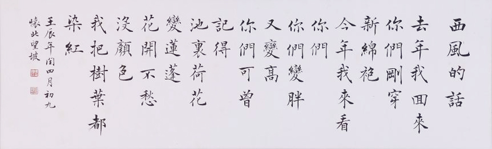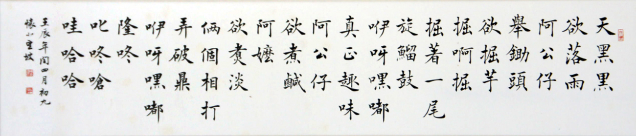 ◎ 書法 行書-秋水長天 2011 35x136cm 楷書月夜愁-擬智永 2011 35x136cm 月光光 2011 35×120cm 王菲-棋子 2011 35×136 cmx4 哈輝茶香 2011 70×136 cm 金字心經 2011 35×136 cm 天黑黑 2011 35×136 cm 西風的話 2009 35×136cm 王羲之尺牘 2009 35×136cm 群峰伴不譁 2012 35×130cm 團金橘滿洲 2012 35×130cm 隸書對聯 行書小對聯 13×66cm 行書小對聯 12×50cm 臨米芾蜀素帖 35×136cm 小鏡片 9×28cm 董其昌畫禪室隨筆 50×136cm 扇面-擬金農隸書