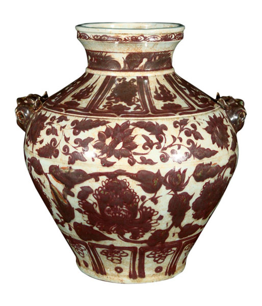 釉裡紅纏枝牡丹紋獸頭罐