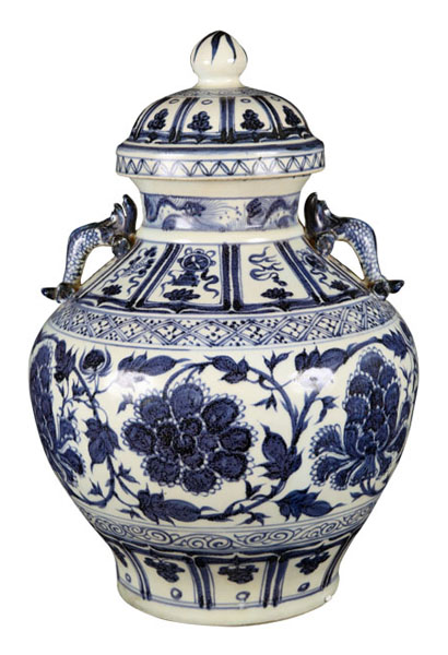 青花纏枝牡丹龍耳蓋罐