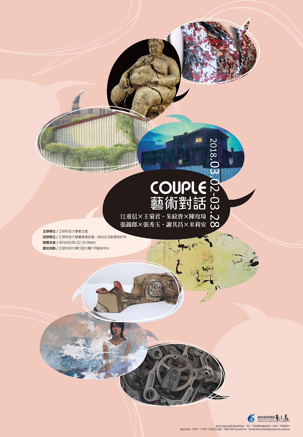 南臺灣的春意正催促著芽尖上的新綠綻放欣欣氣息,正值春暖花開之際,正修科大藝文處邀約南部四對夫妻檔藝術家,以類對話的形式,共同呈現在家庭生活的日常相伴,延伸到藝術創作的相互對話密語中,更貼近的閱讀彼此的心靈。「Couples」分別以嘉義、臺南、高雄地區的藝術家夫妻檔為邀約對象:嘉義-謝其昌/Myriam、臺南-朱紋皆/陳玫琦、旗山-江重信/王菊君、高雄-張錦郎/張秀玉。展出作品內容包含平面繪畫、立體雕塑和纖維織品;創作形式更是各具特色。藝術家夫妻在家庭生活中彼此互相牽手扶持,而在藝術創作中又有如何的火花,自然令人期待!