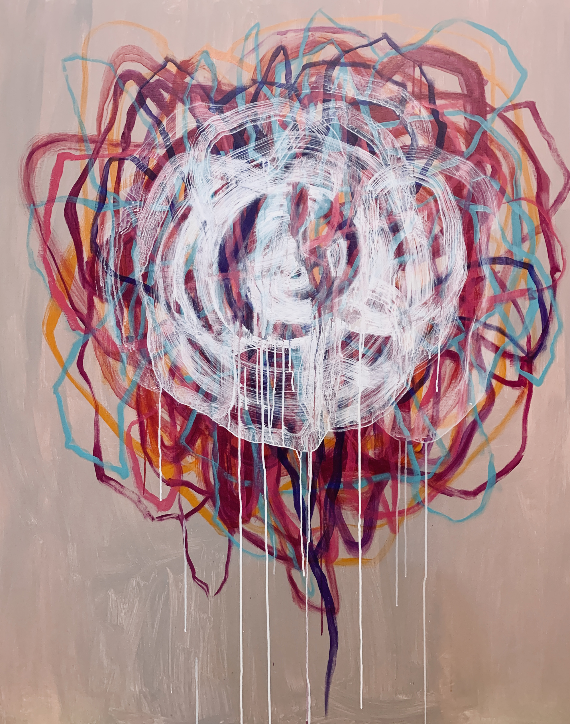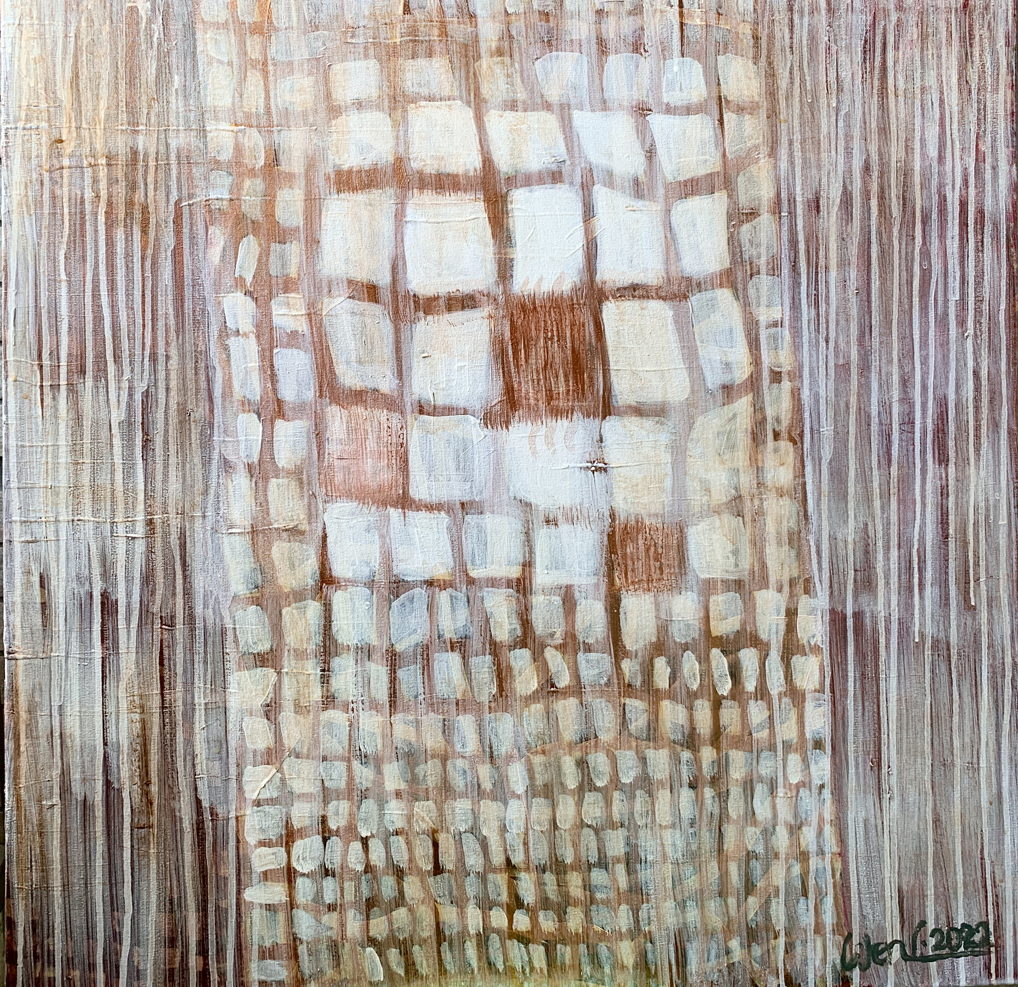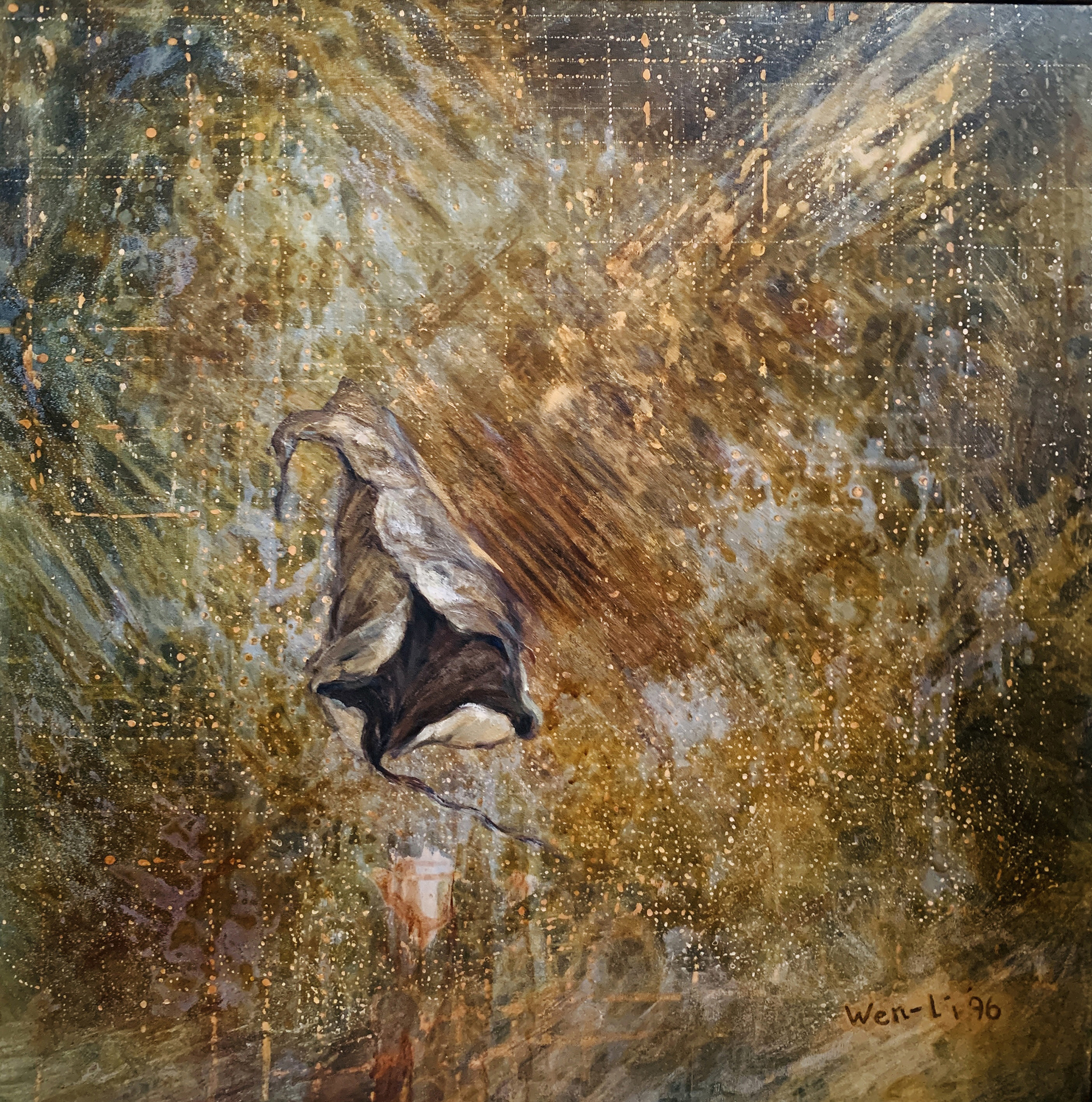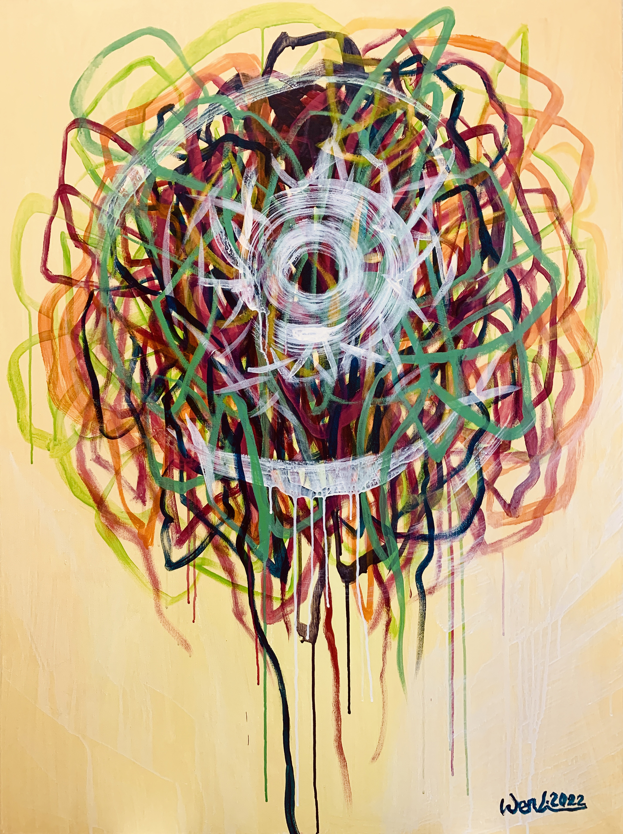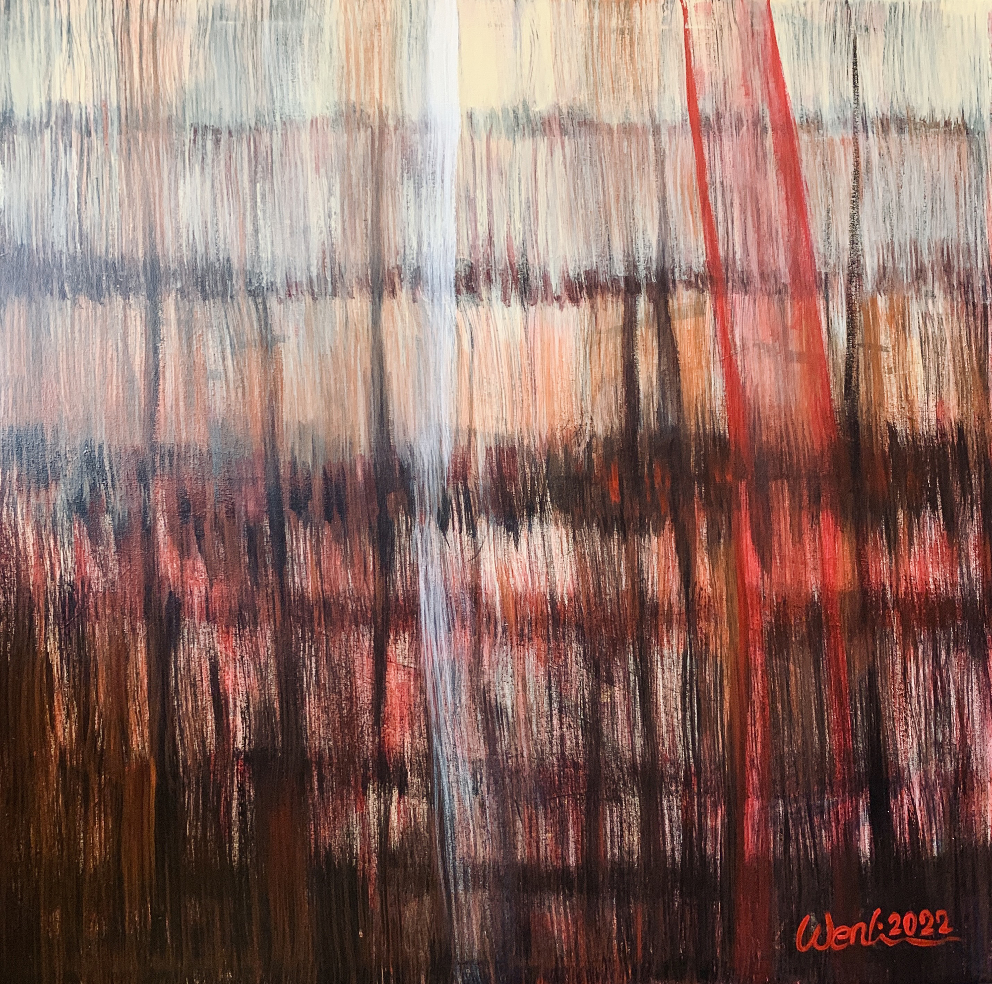 赴笈美國紐約期間我像海綿一般地盡情吸收一流當代藝術的盛宴,頓然視野開闊並積極思考自我的創作路線、競競業業地探討新的觀念與研發新的獨特技法。畢業個展時呈現了一系列[Going with the Flow] 的繪畫創作,此系列融合抽像表現與極簡藝術的意境,以自創的半自動性技法完成畫作。