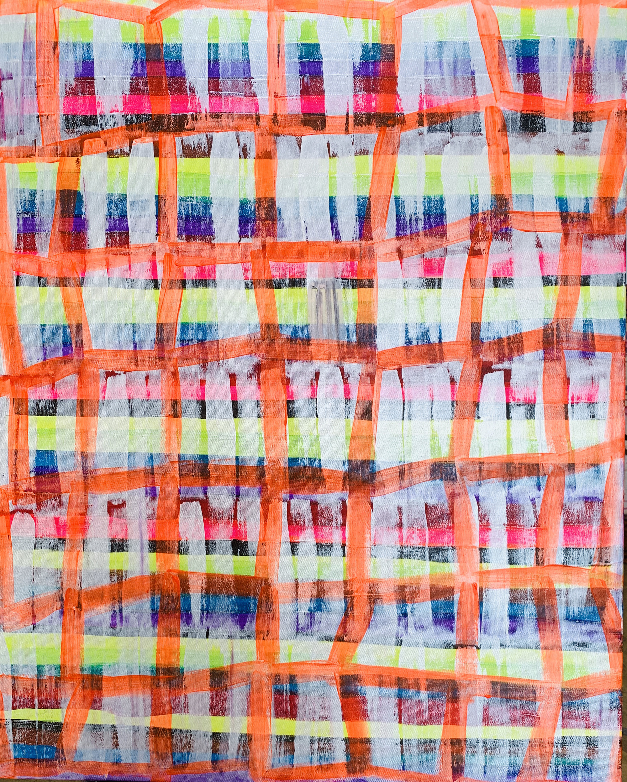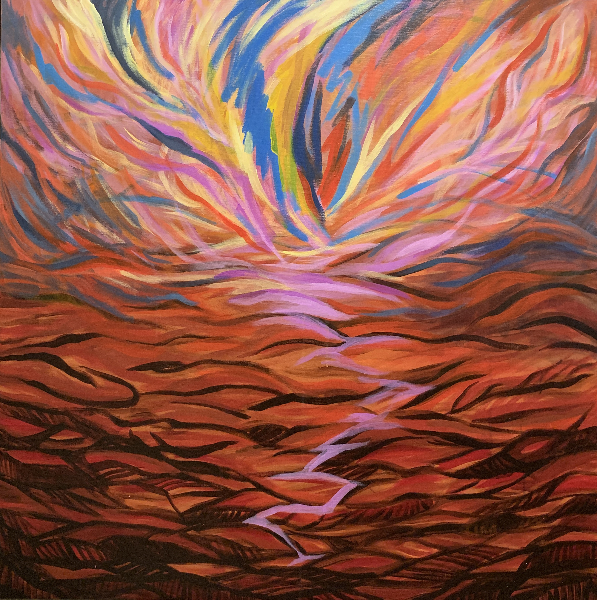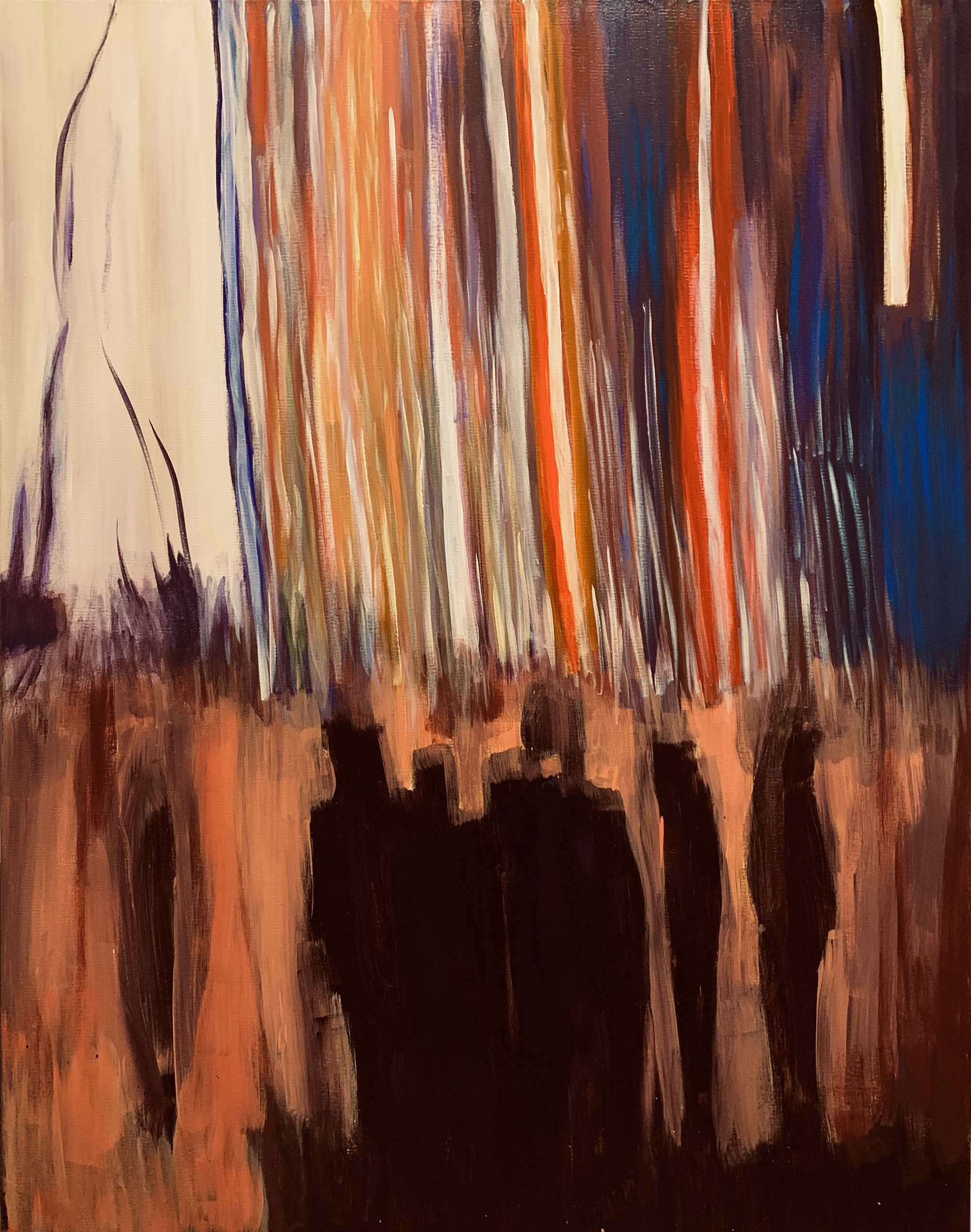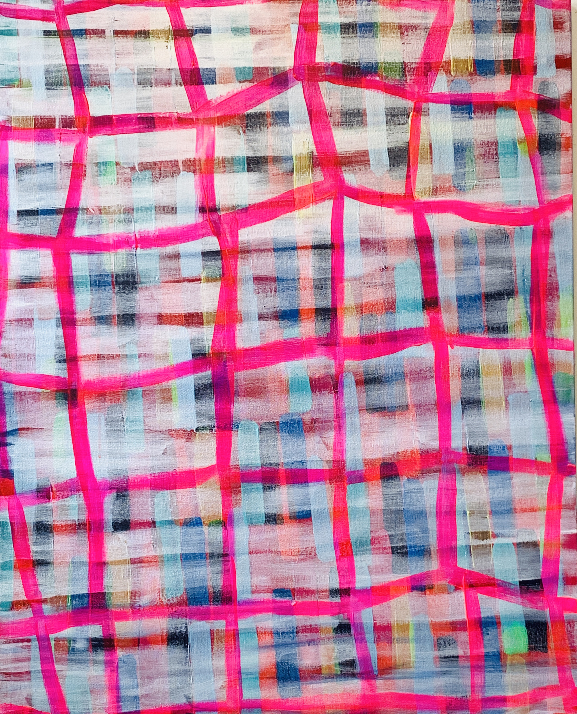 赴笈美國紐約期間我像海綿一般地盡情吸收一流當代藝術的盛宴,頓然視野開闊並積極思考自我的創作路線、競競業業地探討新的觀念與研發新的獨特技法。畢業個展時呈現了一系列[Going with the Flow] 的繪畫創作,此系列融合抽像表現與極簡藝術的意境,以自創的半自動性技法完成畫作。