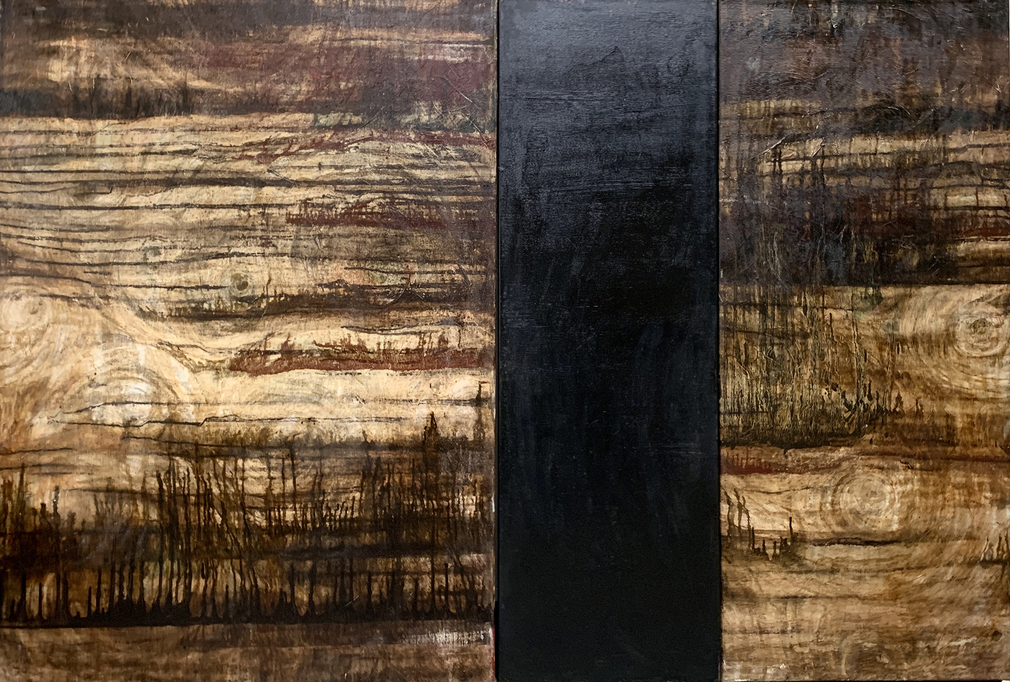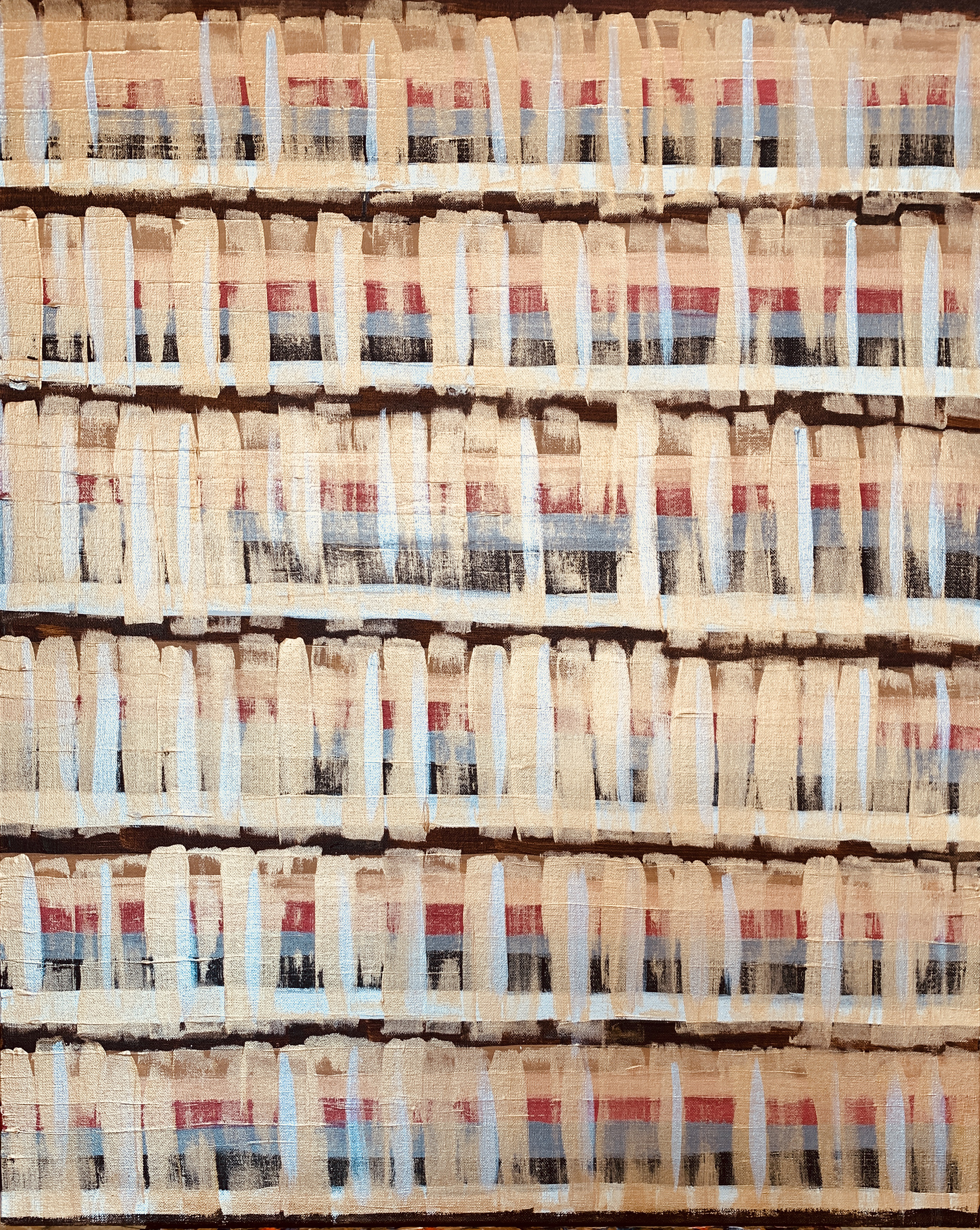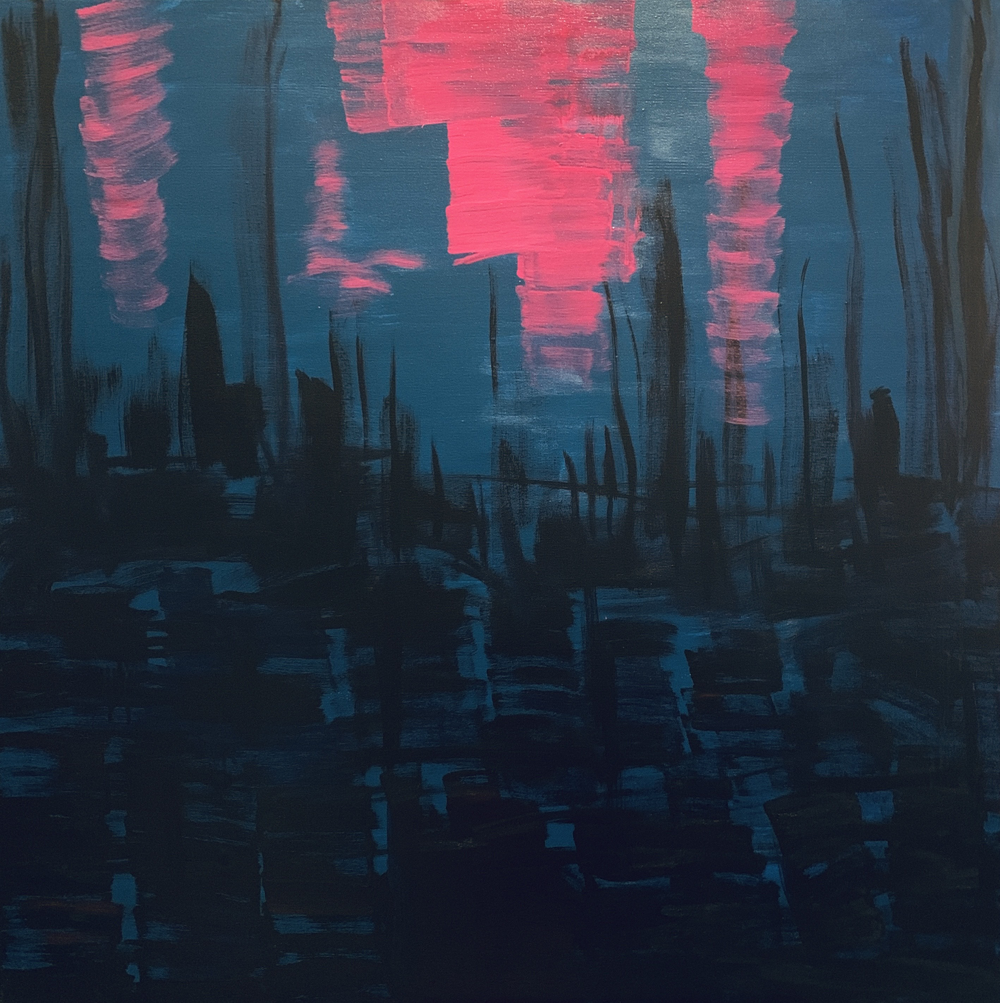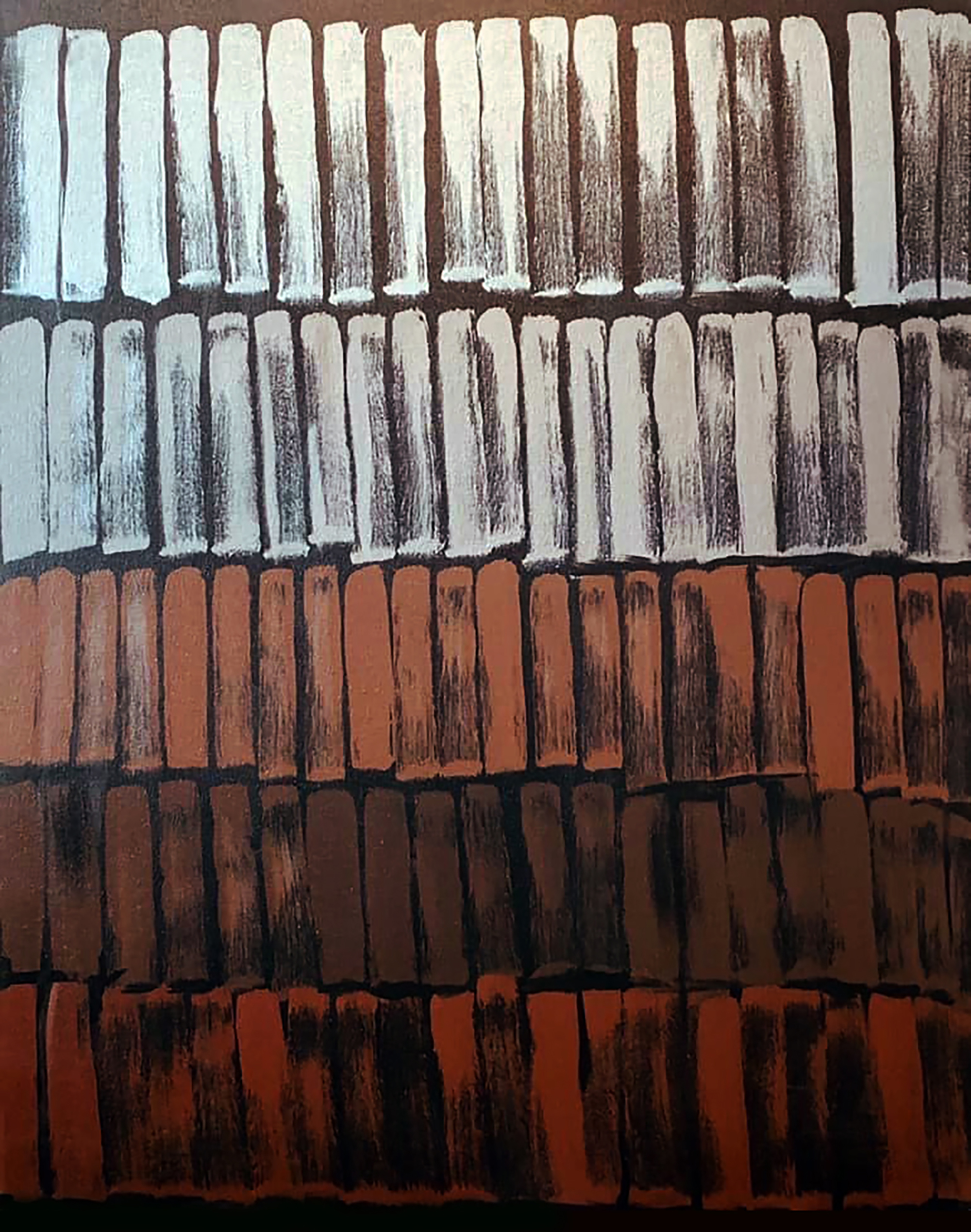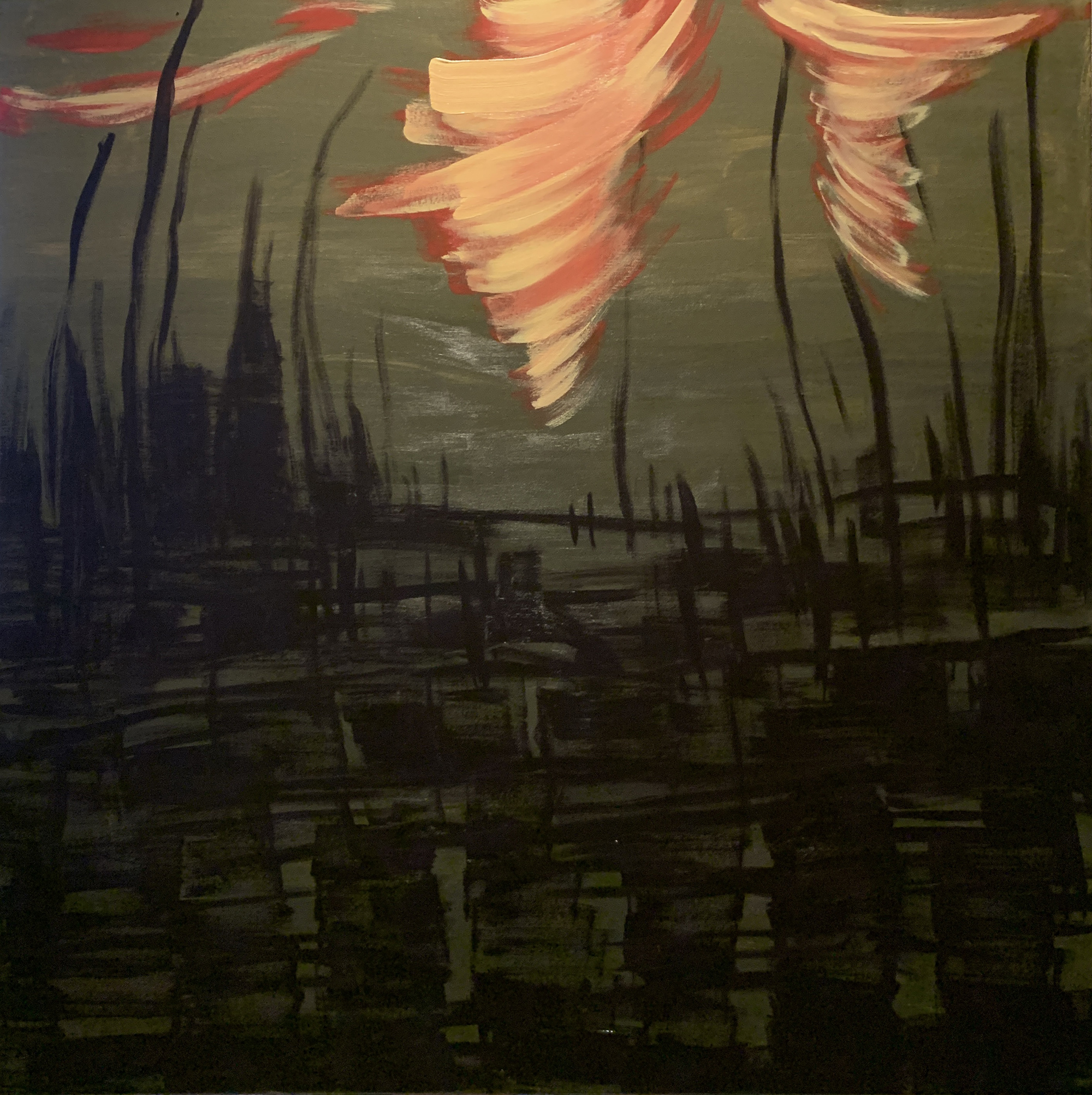 赴笈美國紐約期間我像海綿一般地盡情吸收一流當代藝術的盛宴,頓然視野開闊並積極思考自我的創作路線、競競業業地探討新的觀念與研發新的獨特技法。畢業個展時呈現了一系列[Going with the Flow] 的繪畫創作,此系列融合抽像表現與極簡藝術的意境,以自創的半自動性技法完成畫作。