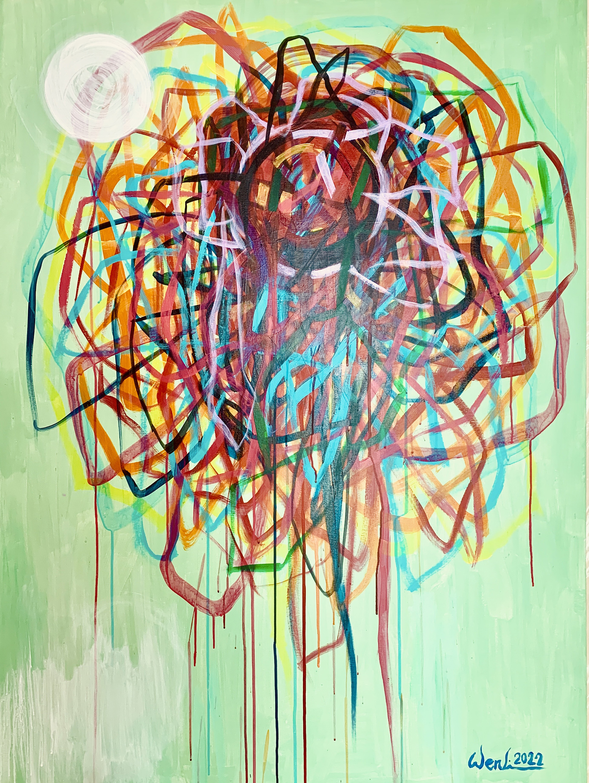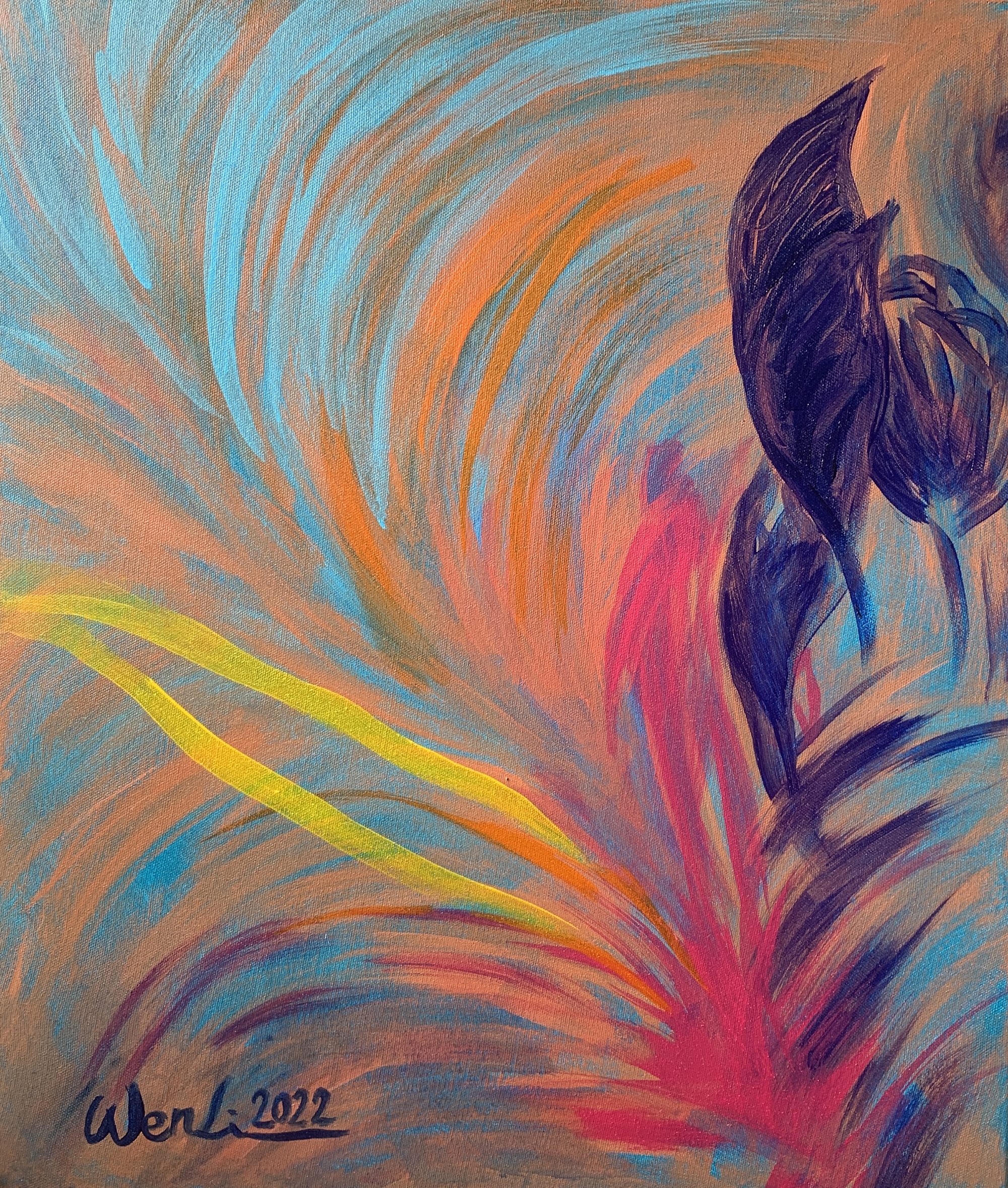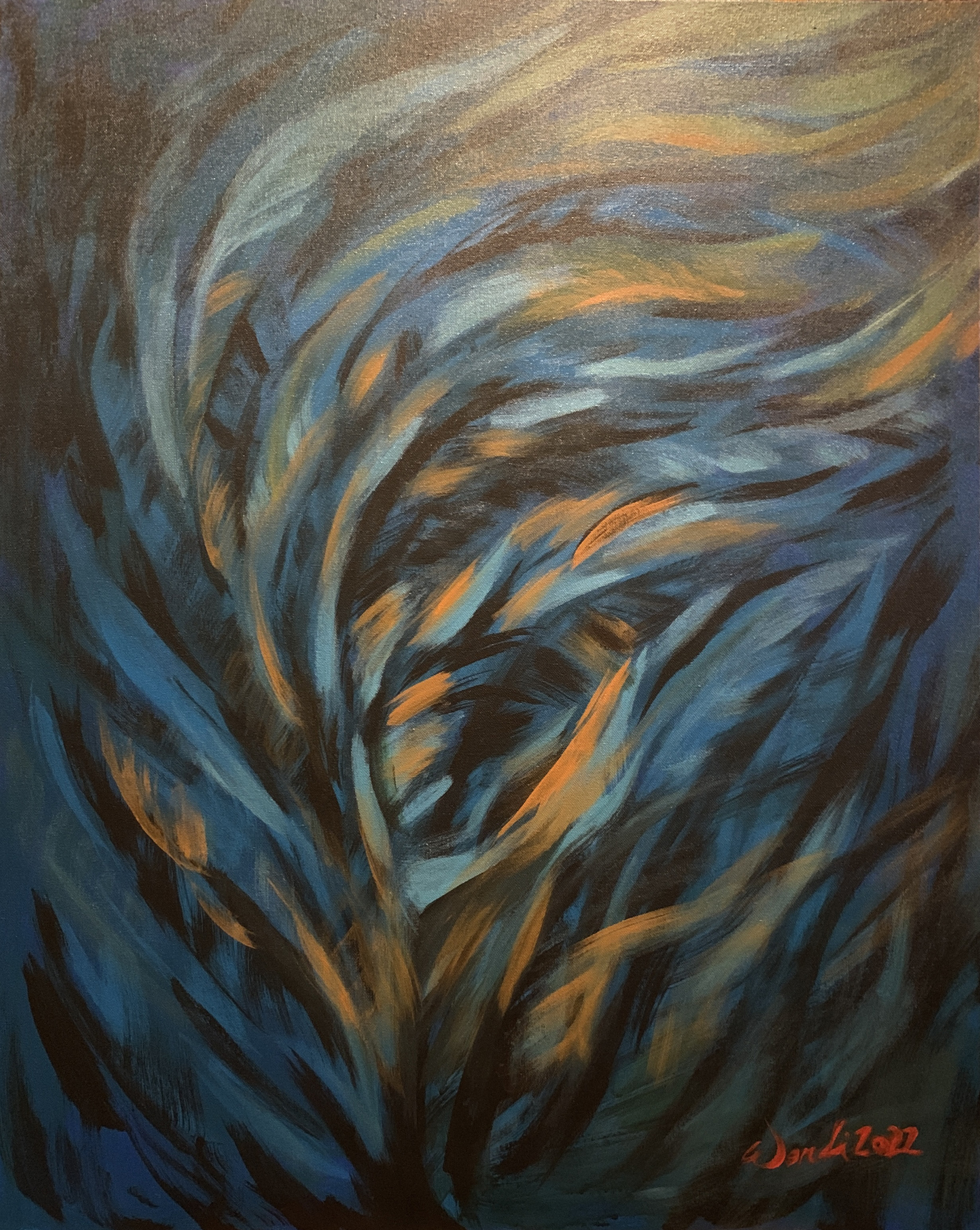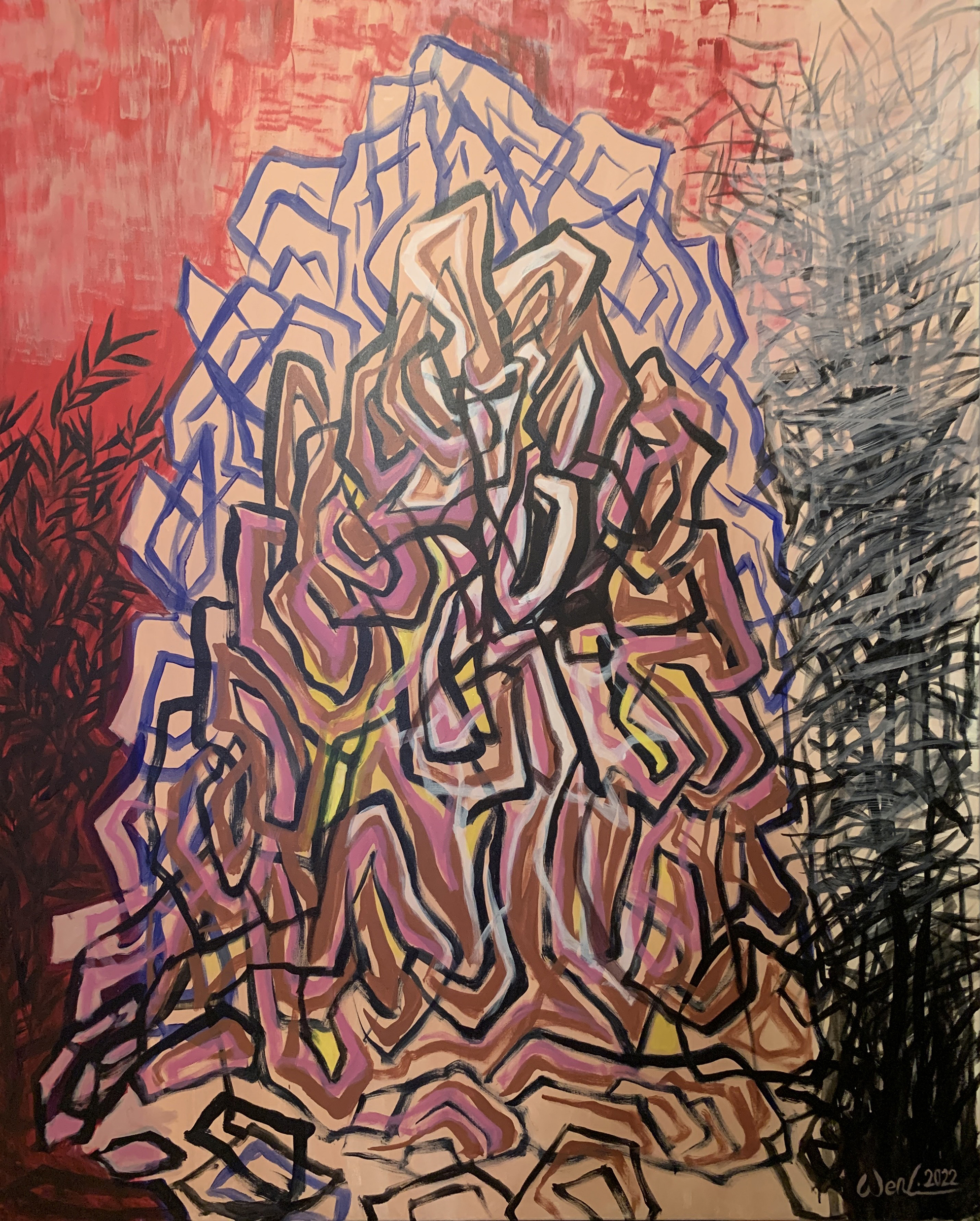 近期的繪畫創作欲彰顯內心澎湃的情感與對內在性(viscerality)的深入探索,以強勁的筆觸揮灑呈現一種在狂放中亦具有幽微情緒的情境。類旋渦形的畫面構成喻示著巴洛克式的感性恣放,呼應了先前數位影像創作中“壓抑與釋放”之間的張力狀態。所謂的反昇華乃意指在創作中應用身體的意象或相關物質元素以微觀及內觀的方式與外界視象進行對話,進而產生身體所感知的內蘊節奏與韻律,欲以達致一種崇高美學的新意境。