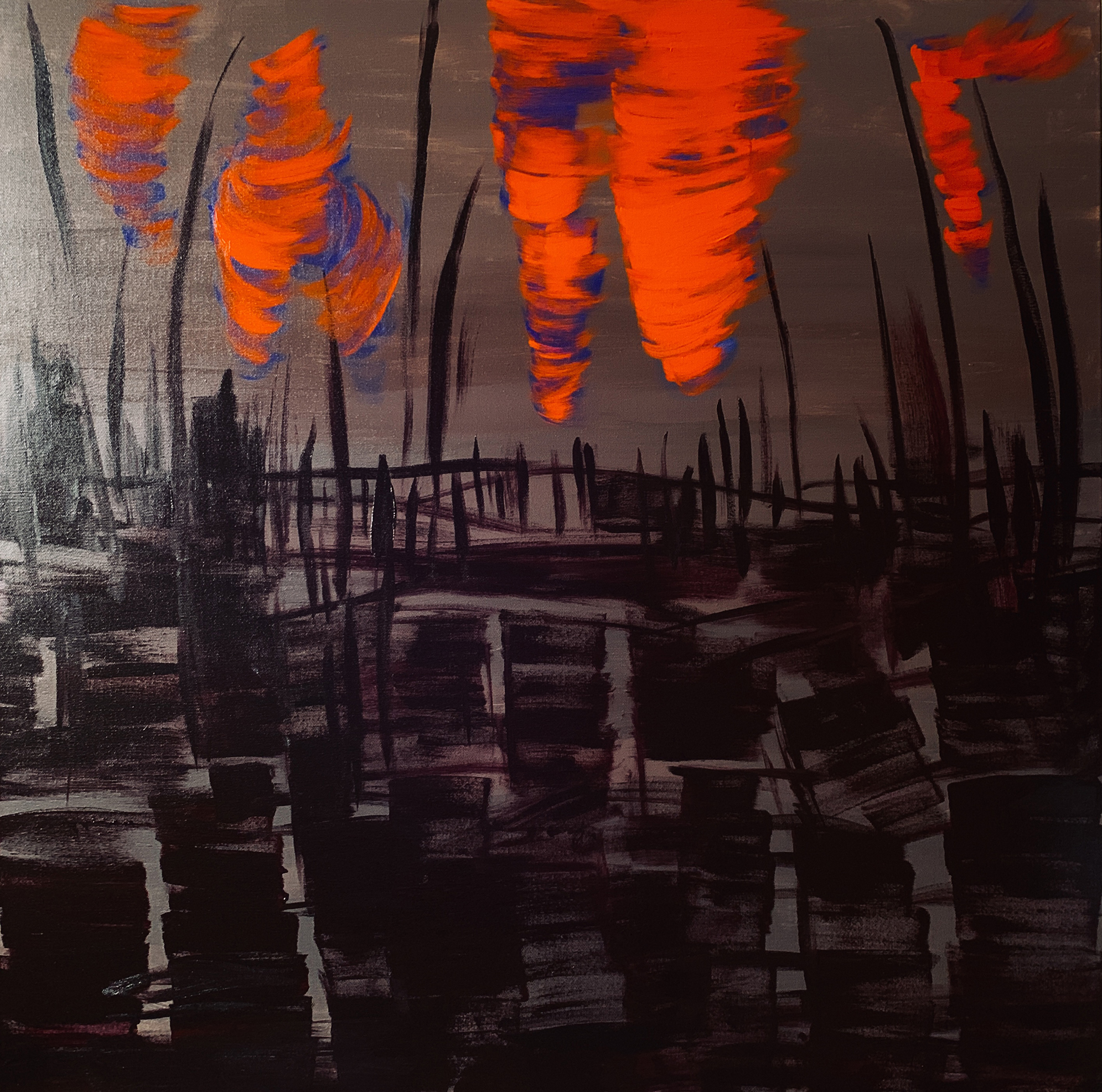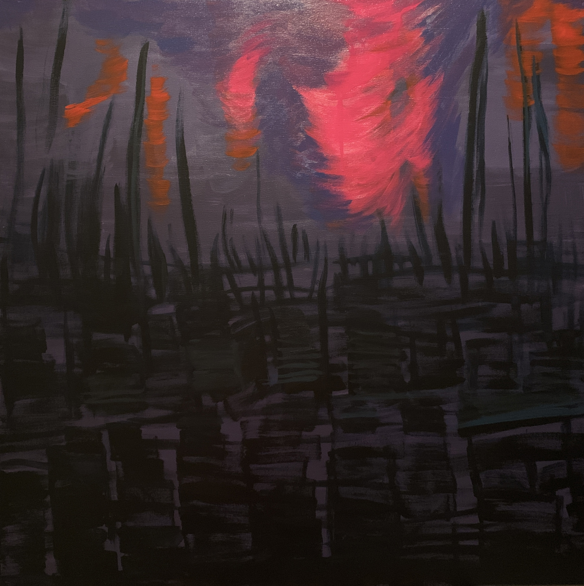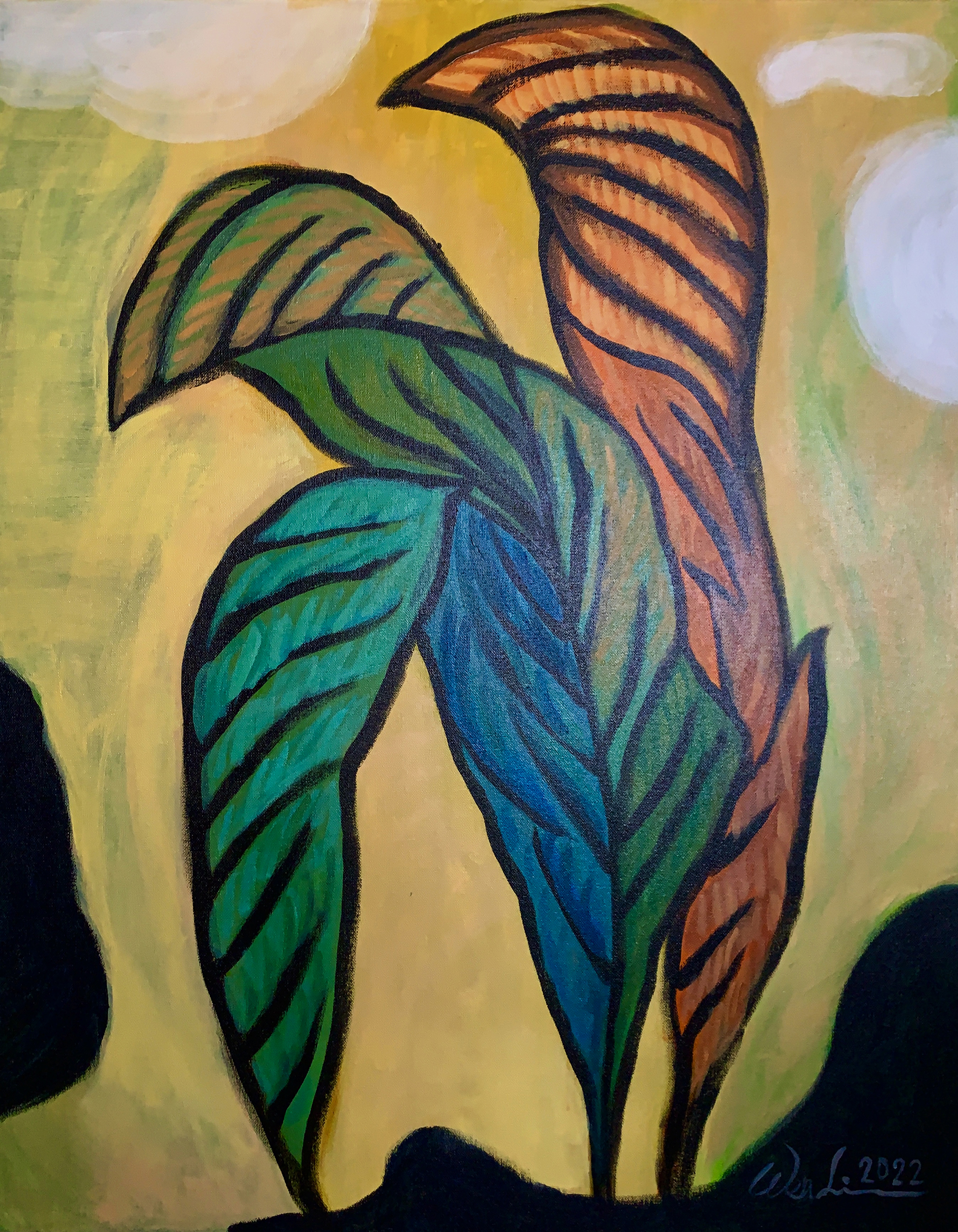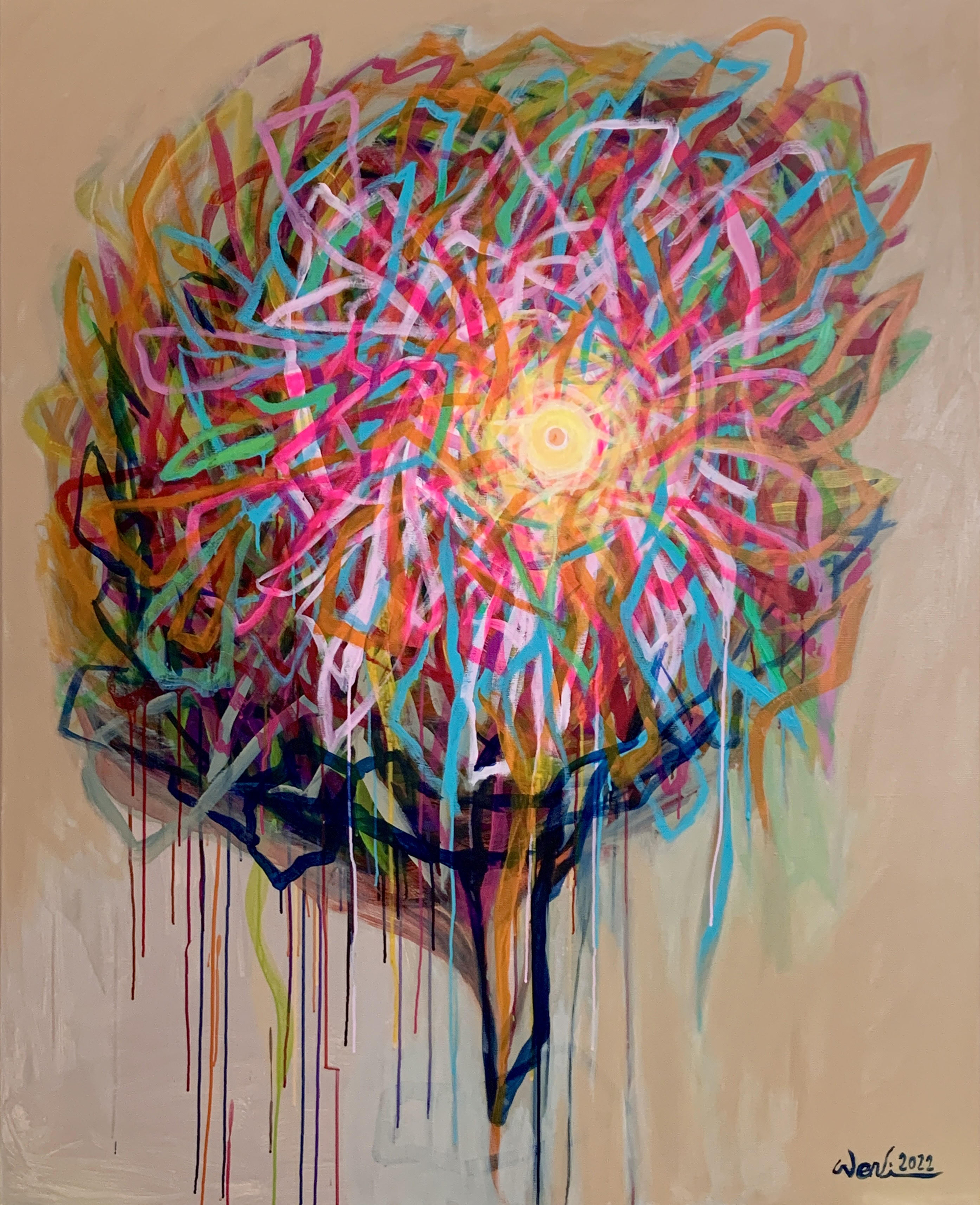 近期的繪畫創作欲彰顯內心澎湃的情感與對內在性(viscerality)的深入探索,以強勁的筆觸揮灑呈現一種在狂放中亦具有幽微情緒的情境。類旋渦形的畫面構成喻示著巴洛克式的感性恣放,呼應了先前數位影像創作中“壓抑與釋放”之間的張力狀態。所謂的反昇華乃意指在創作中應用身體的意象或相關物質元素以微觀及內觀的方式與外界視象進行對話,進而產生身體所感知的內蘊節奏與韻律,欲以達致一種崇高美學的新意境。