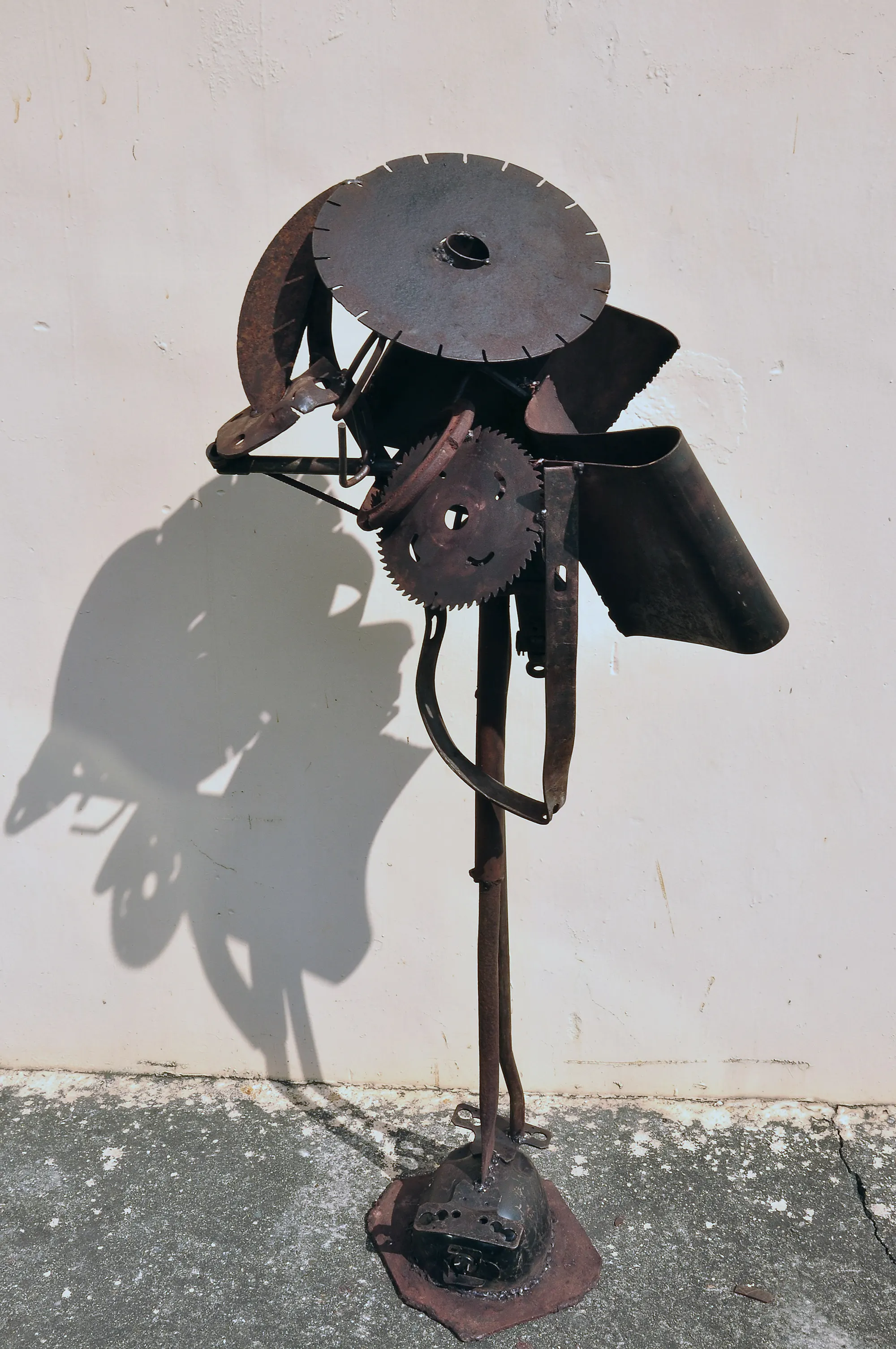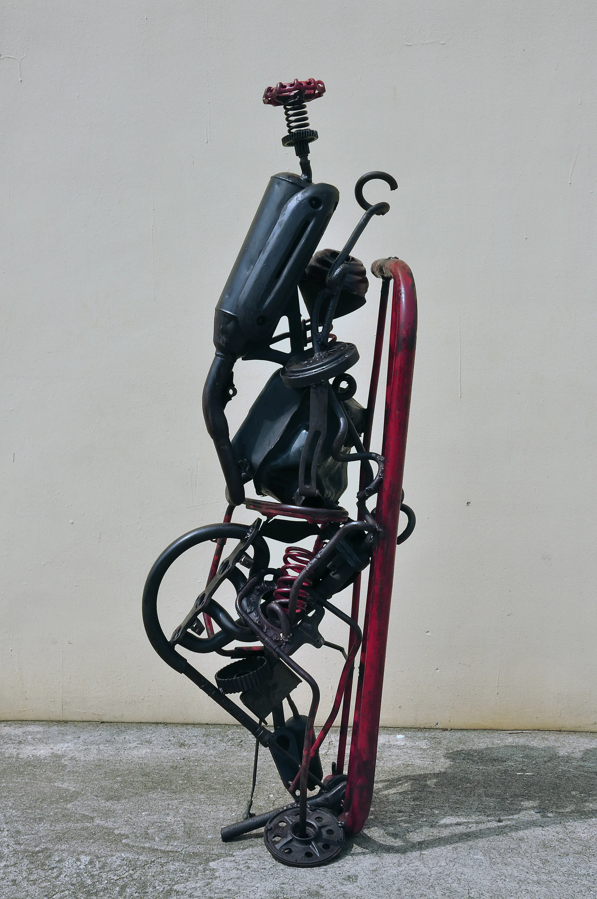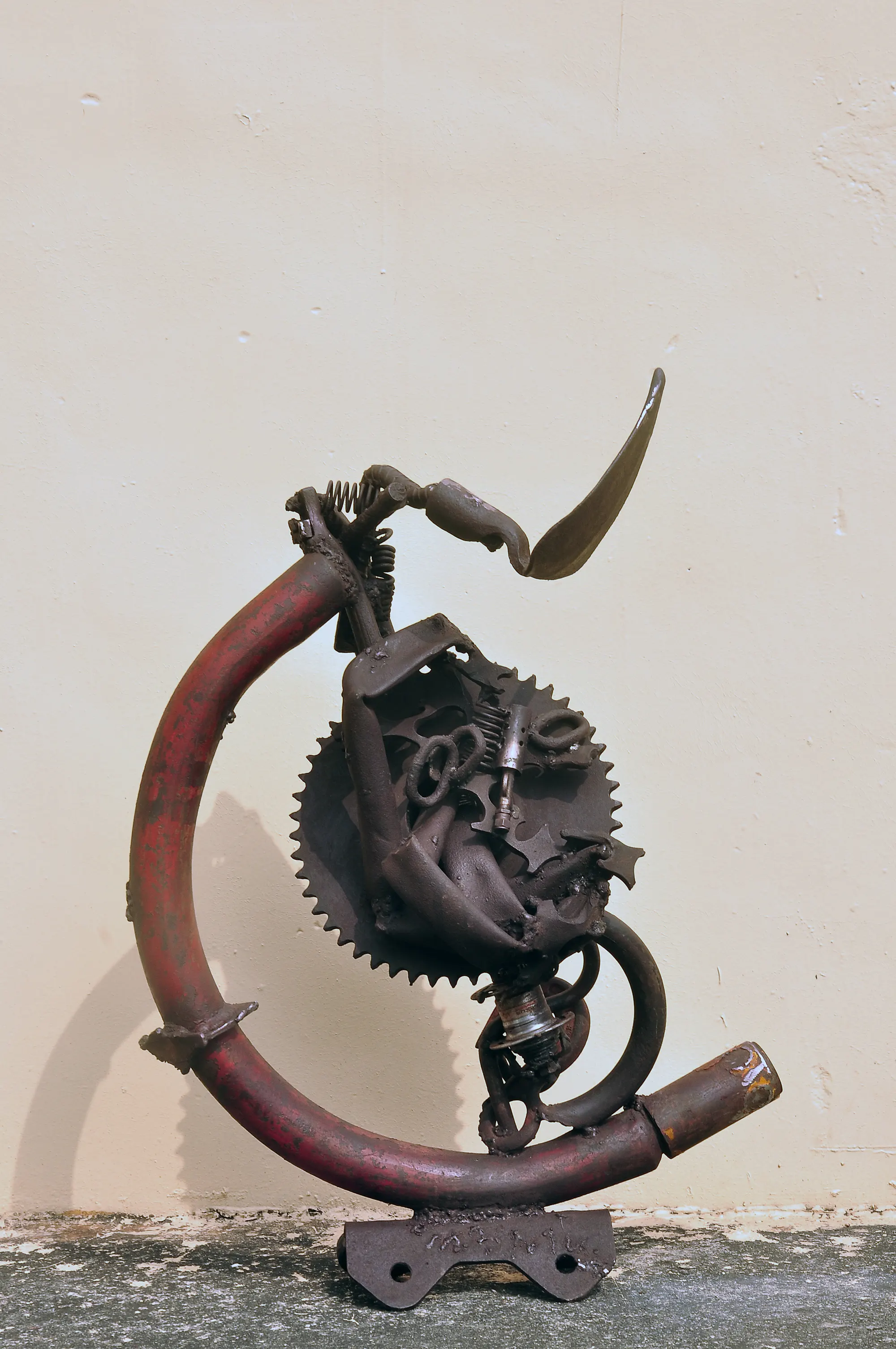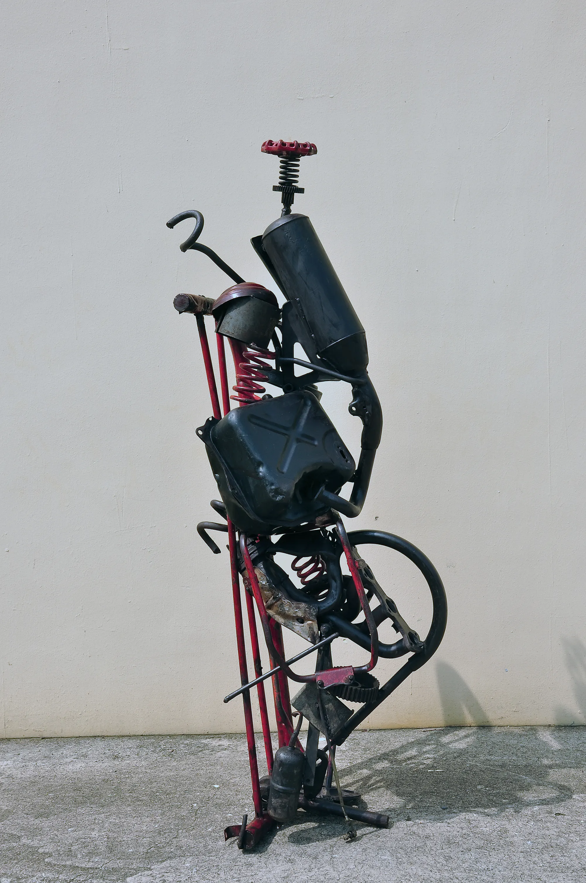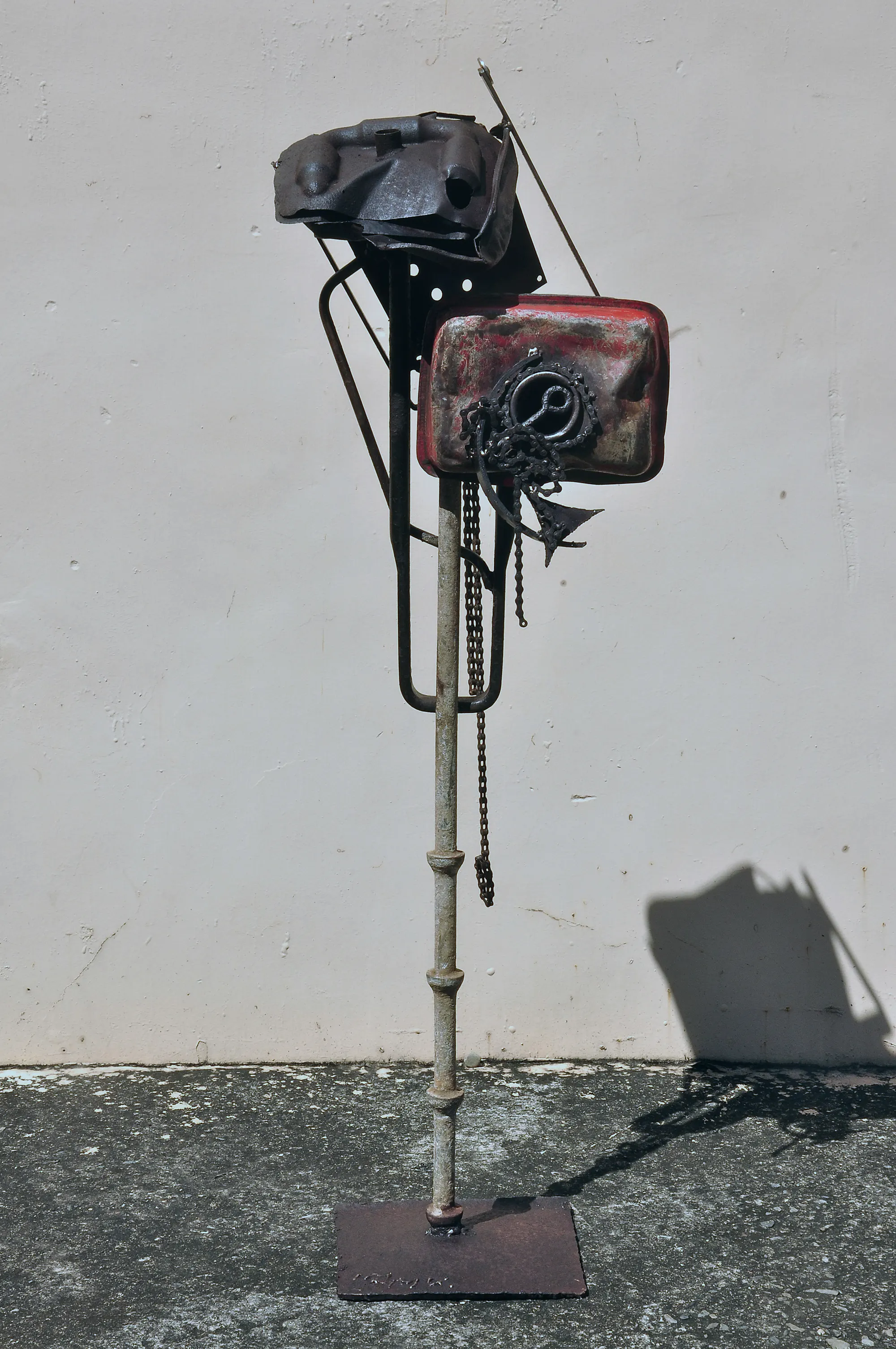 近期作品仍以鐵現成物創作媒材,創作中不事先打稿,按著意念自由建構,透過對鐵件的自然造形與身體(手)的勞動(包括燃燒與焊接),使作品呈現豐富的色彩與鐵銹况味是最大的特色。