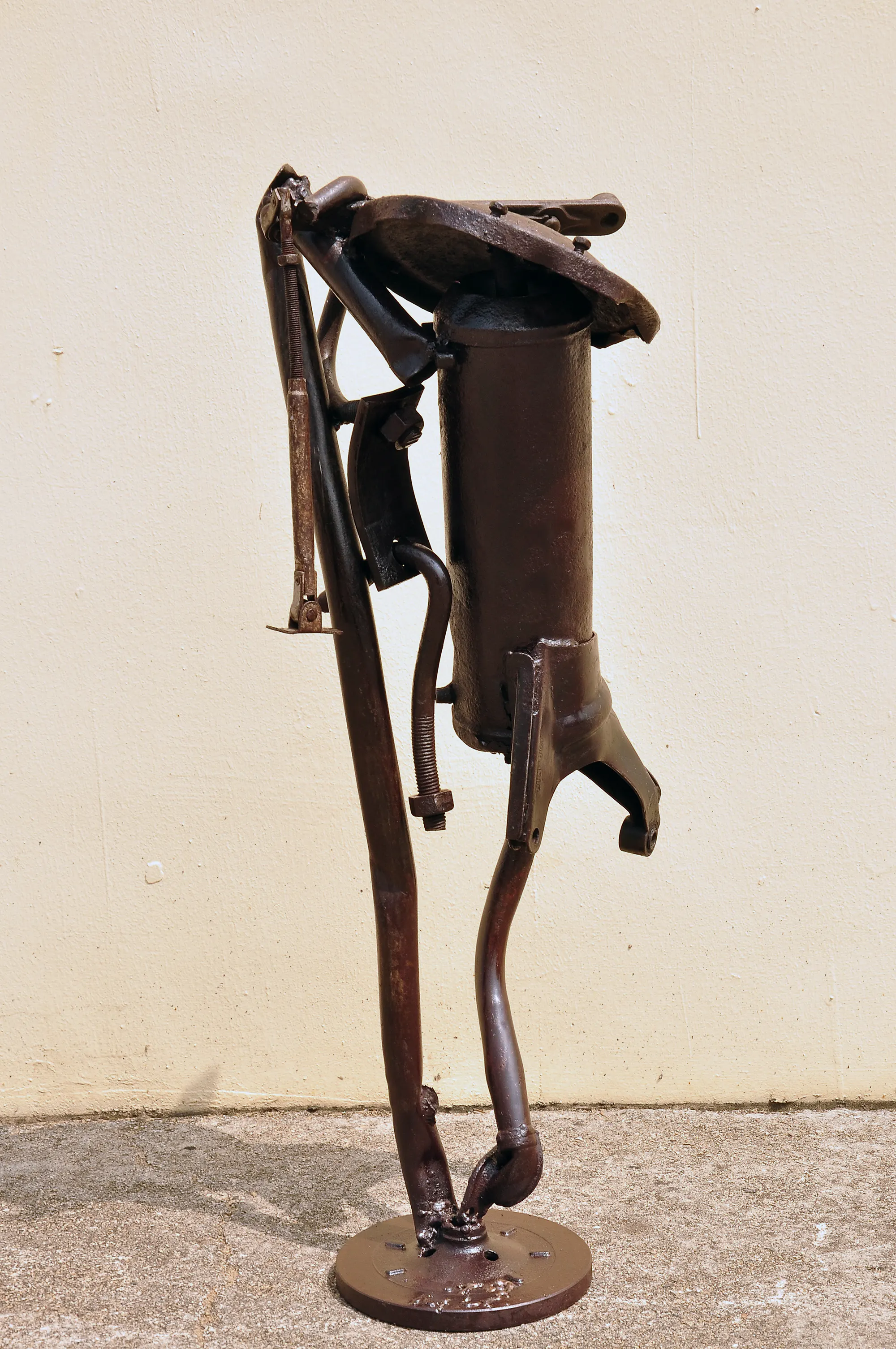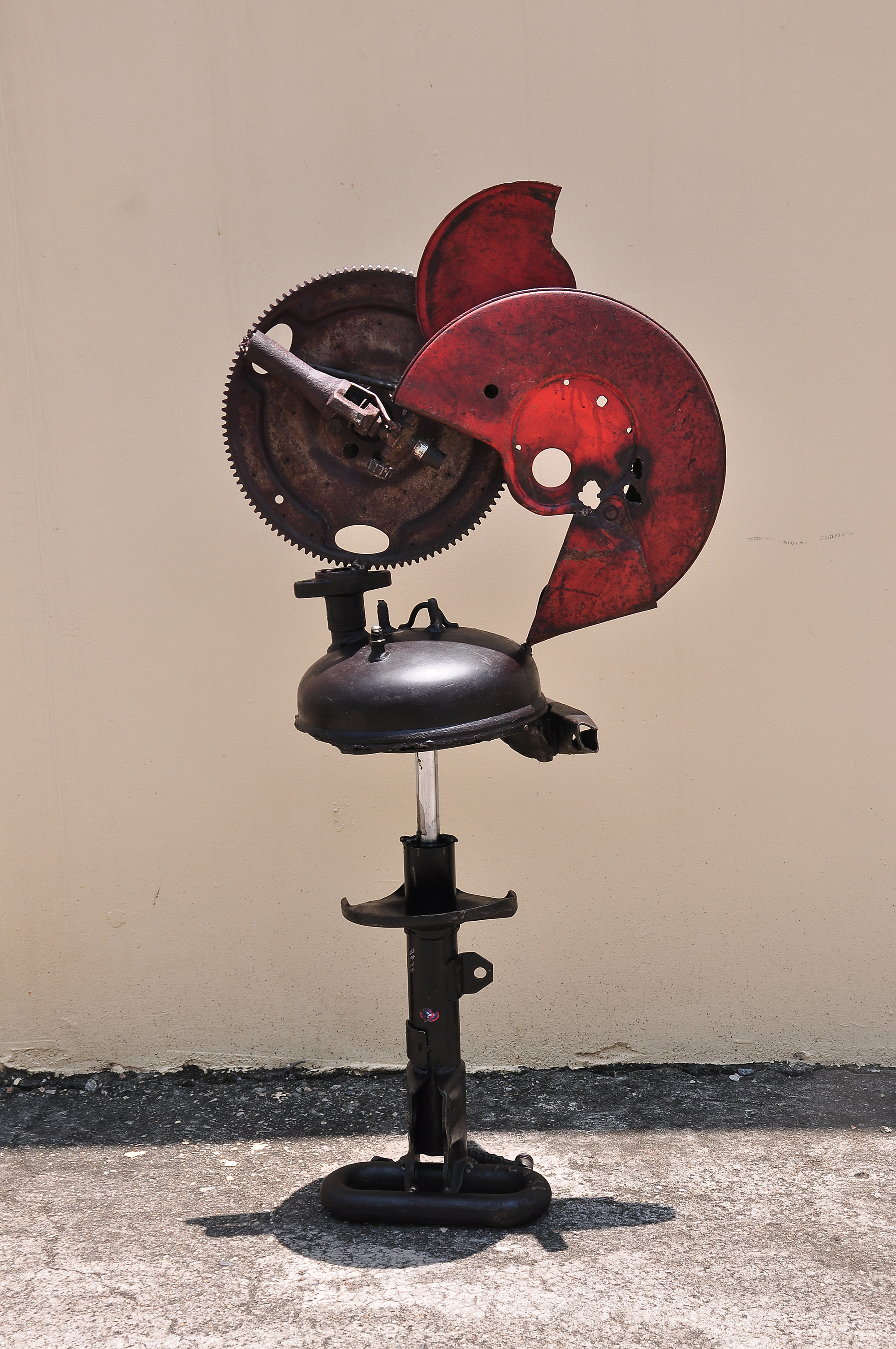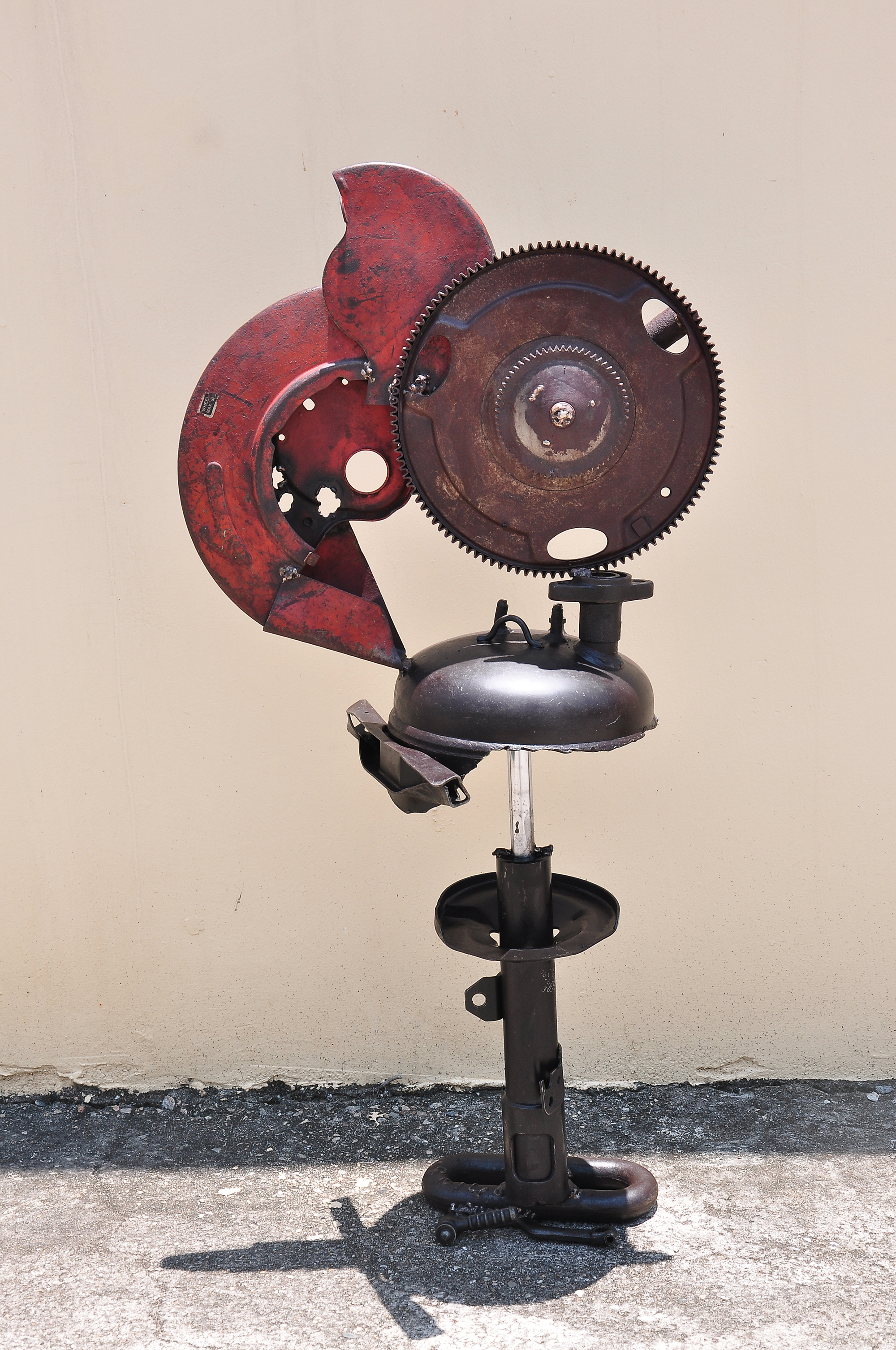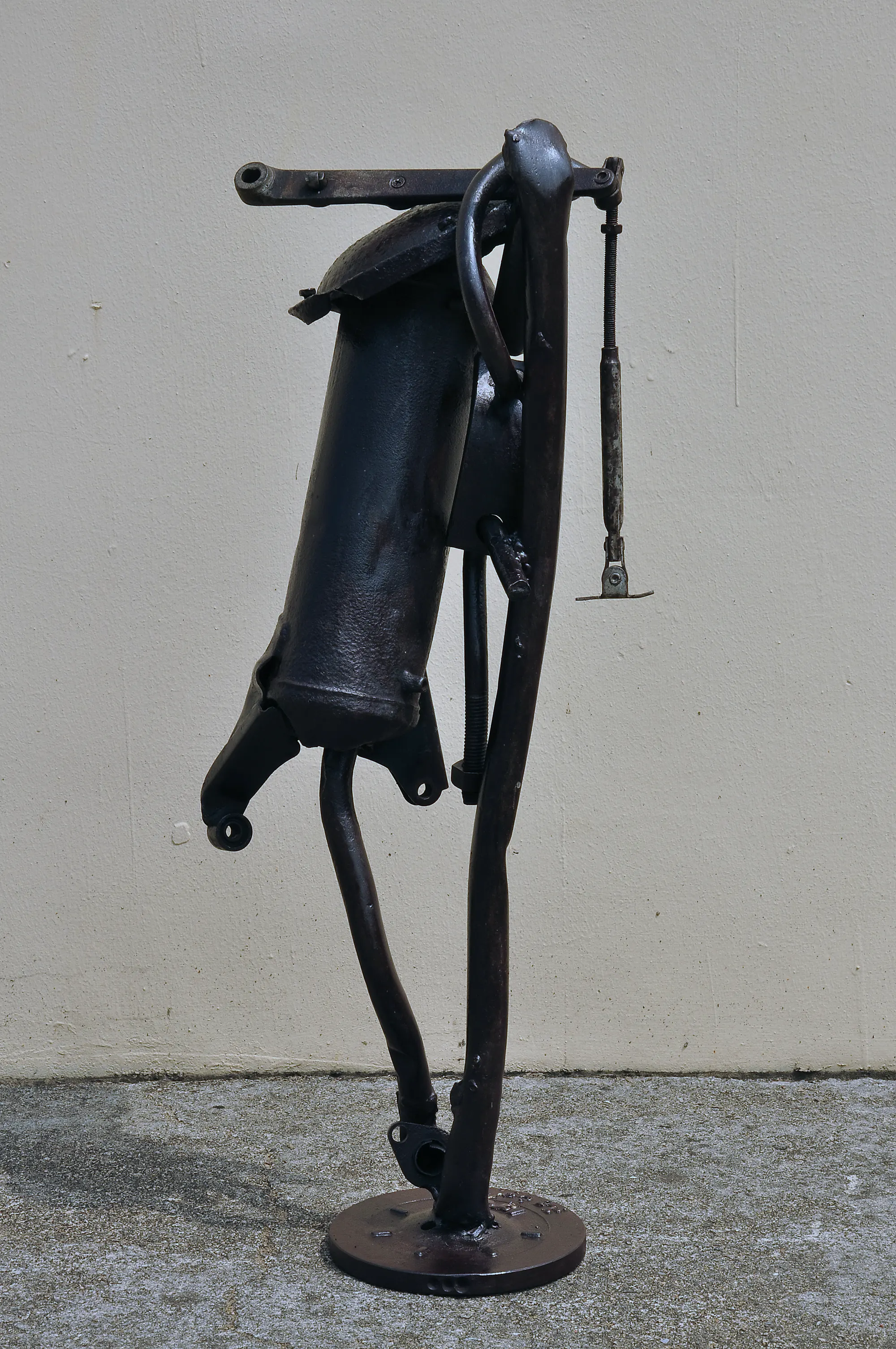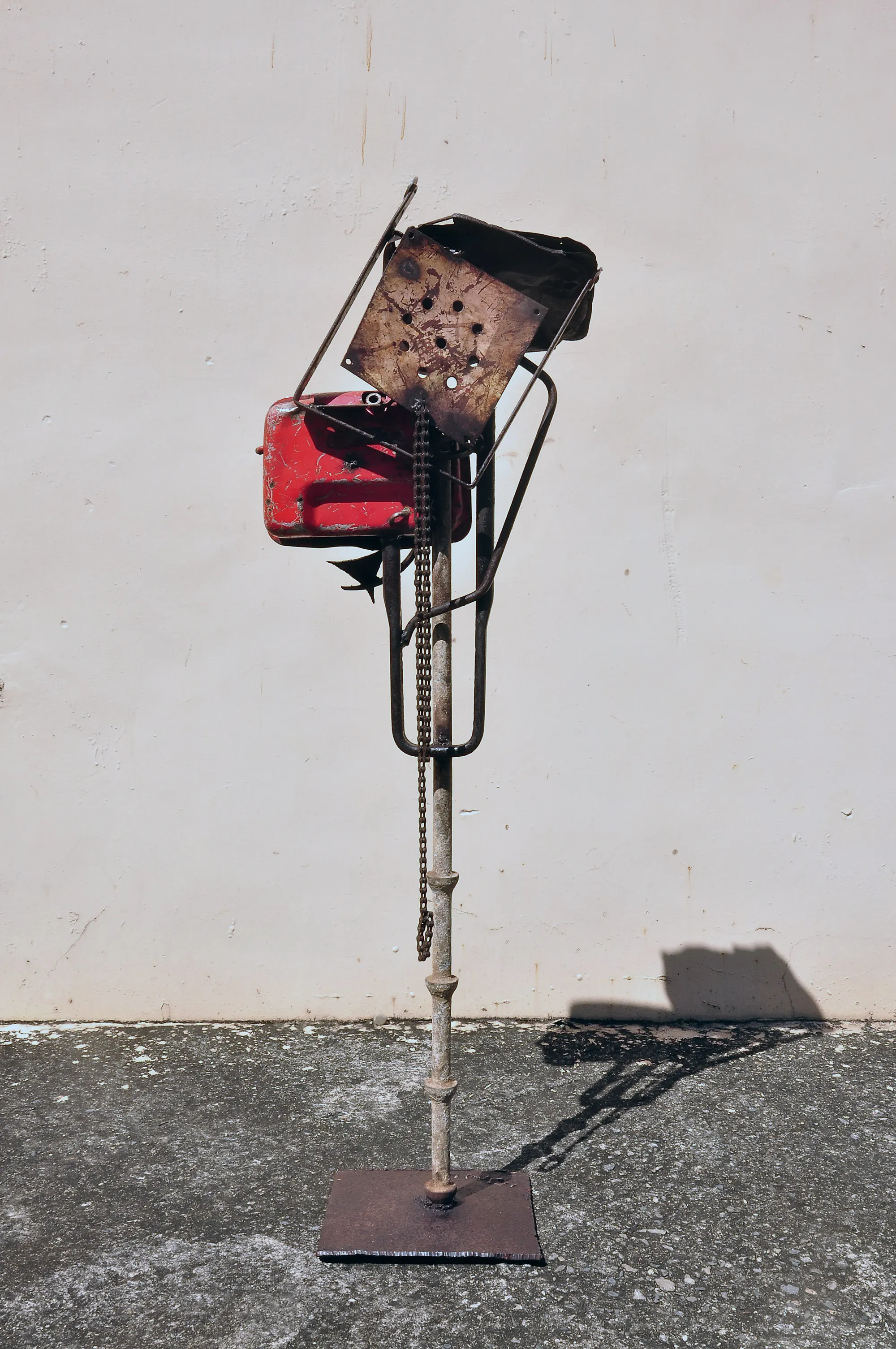 近期作品仍以鐵現成物創作媒材,創作中不事先打稿,按著意念自由建構,透過對鐵件的自然造形與身體(手)的勞動(包括燃燒與焊接),使作品呈現豐富的色彩與鐵銹况味是最大的特色。