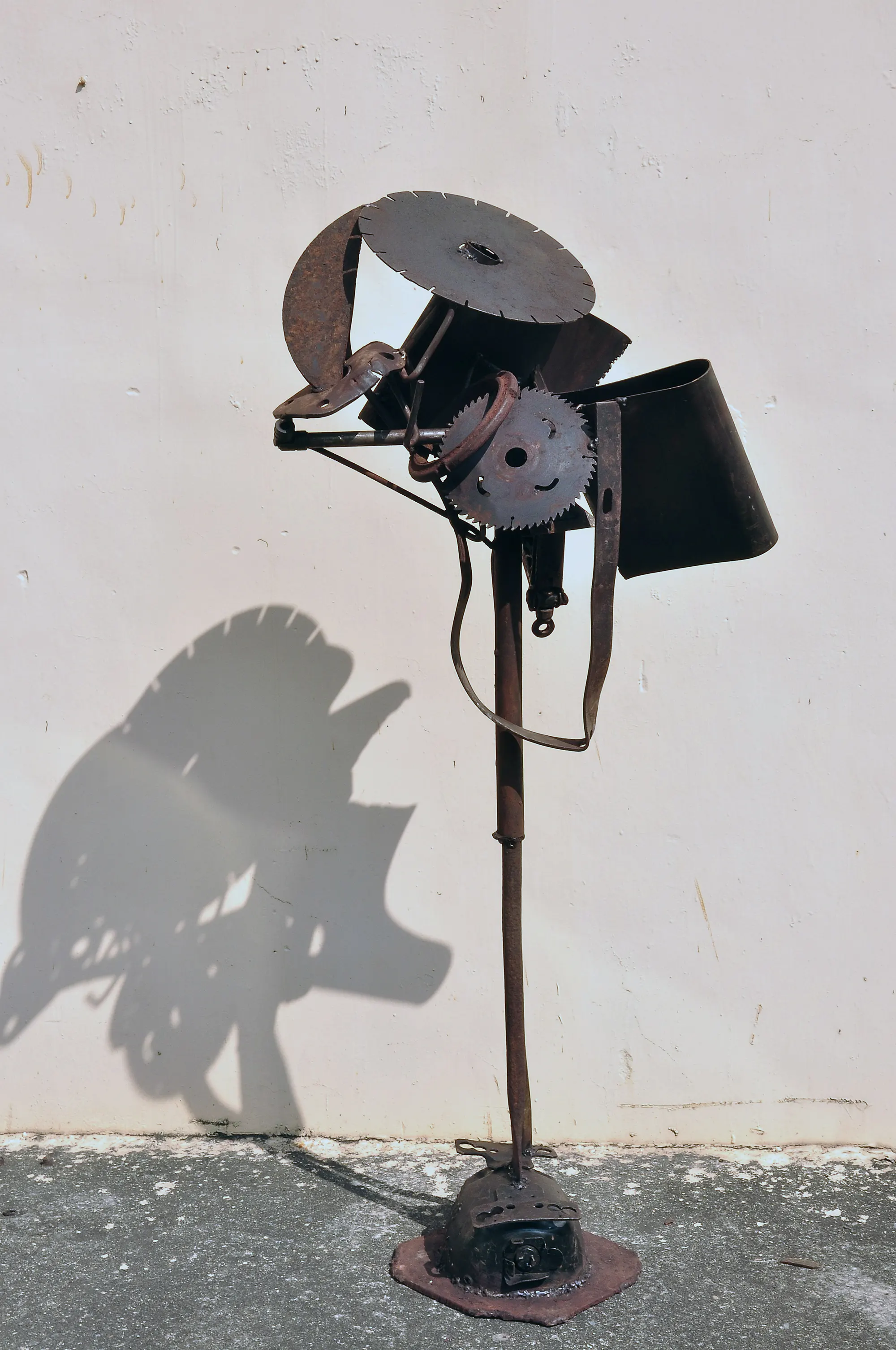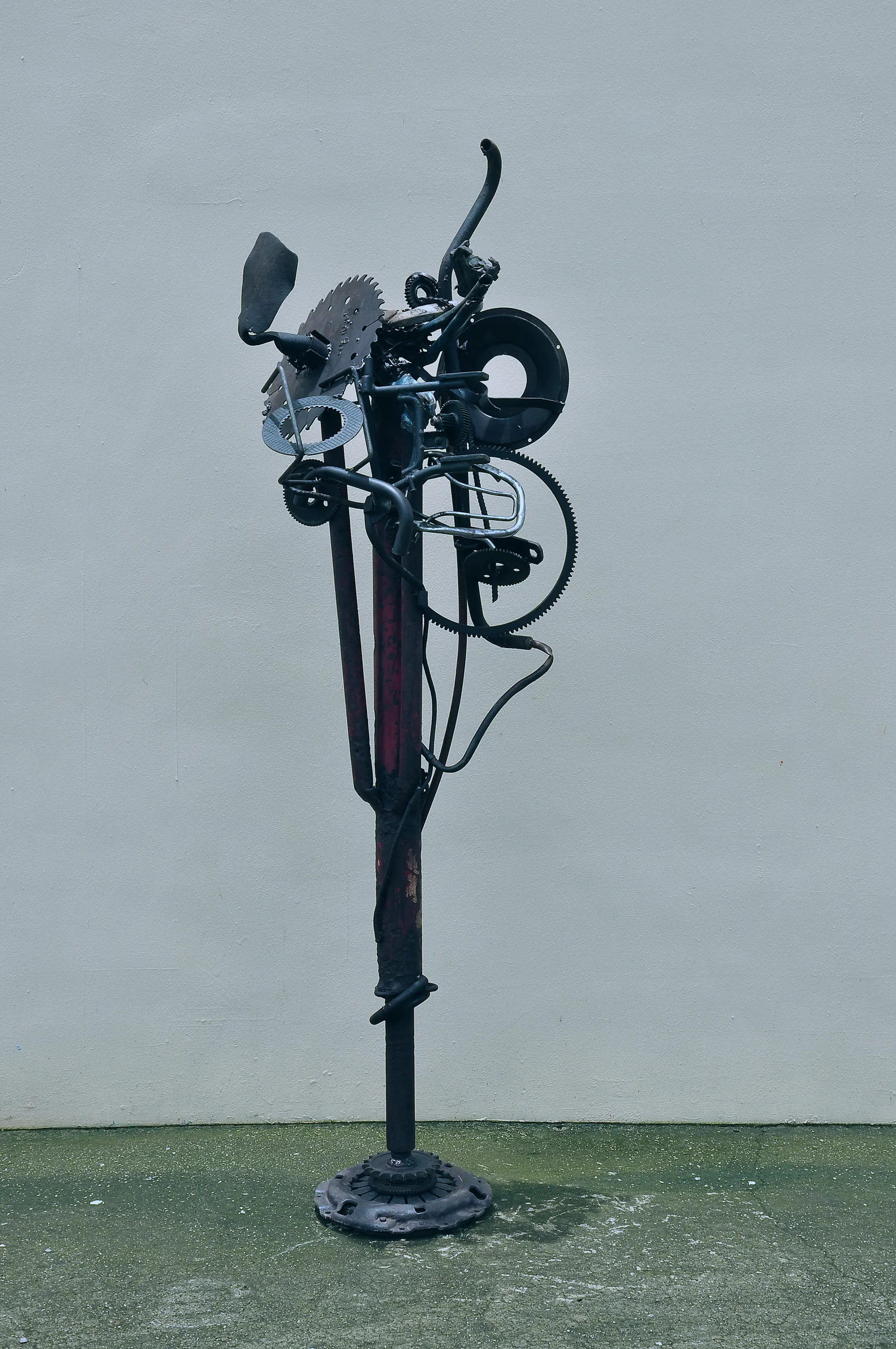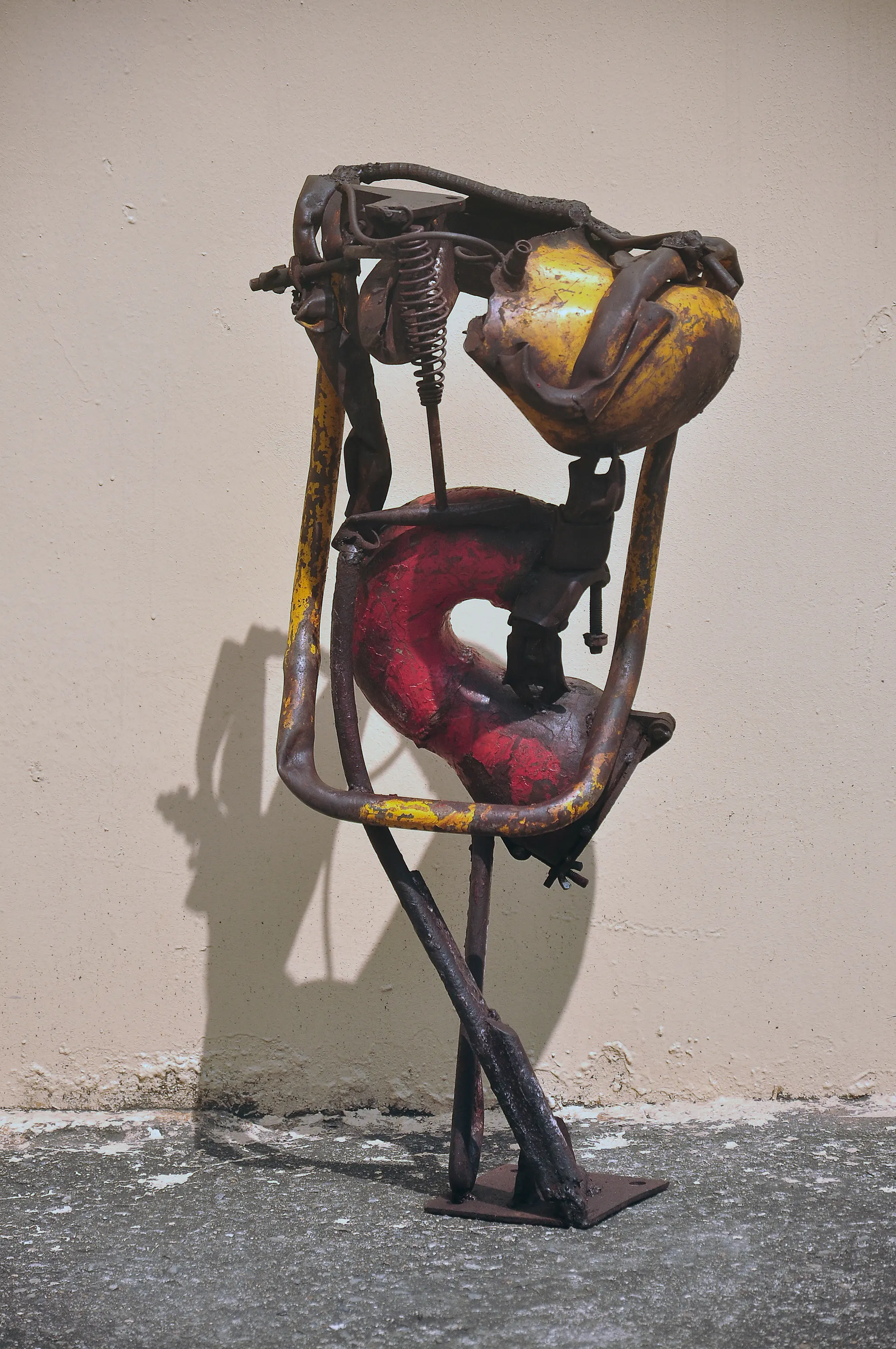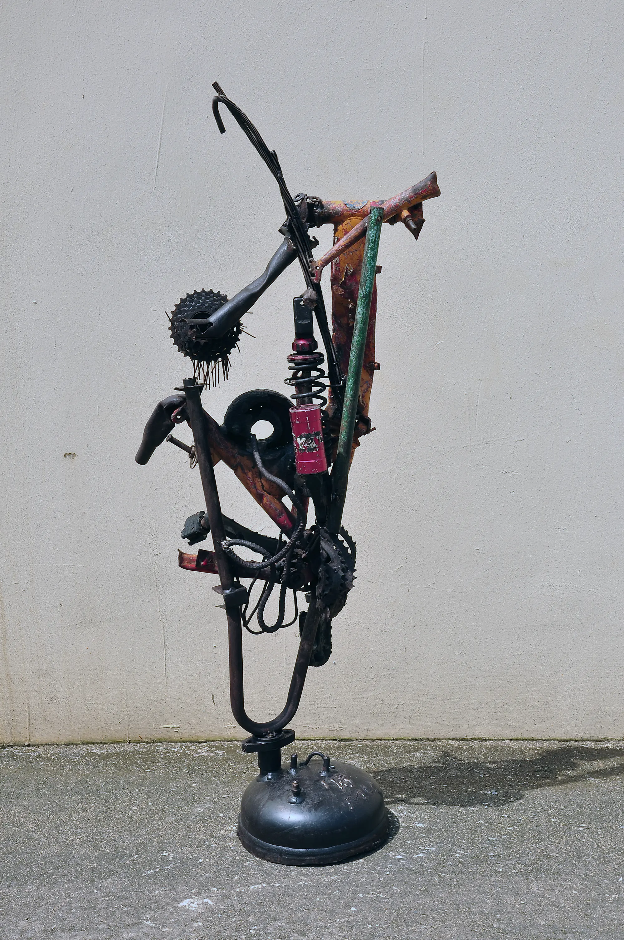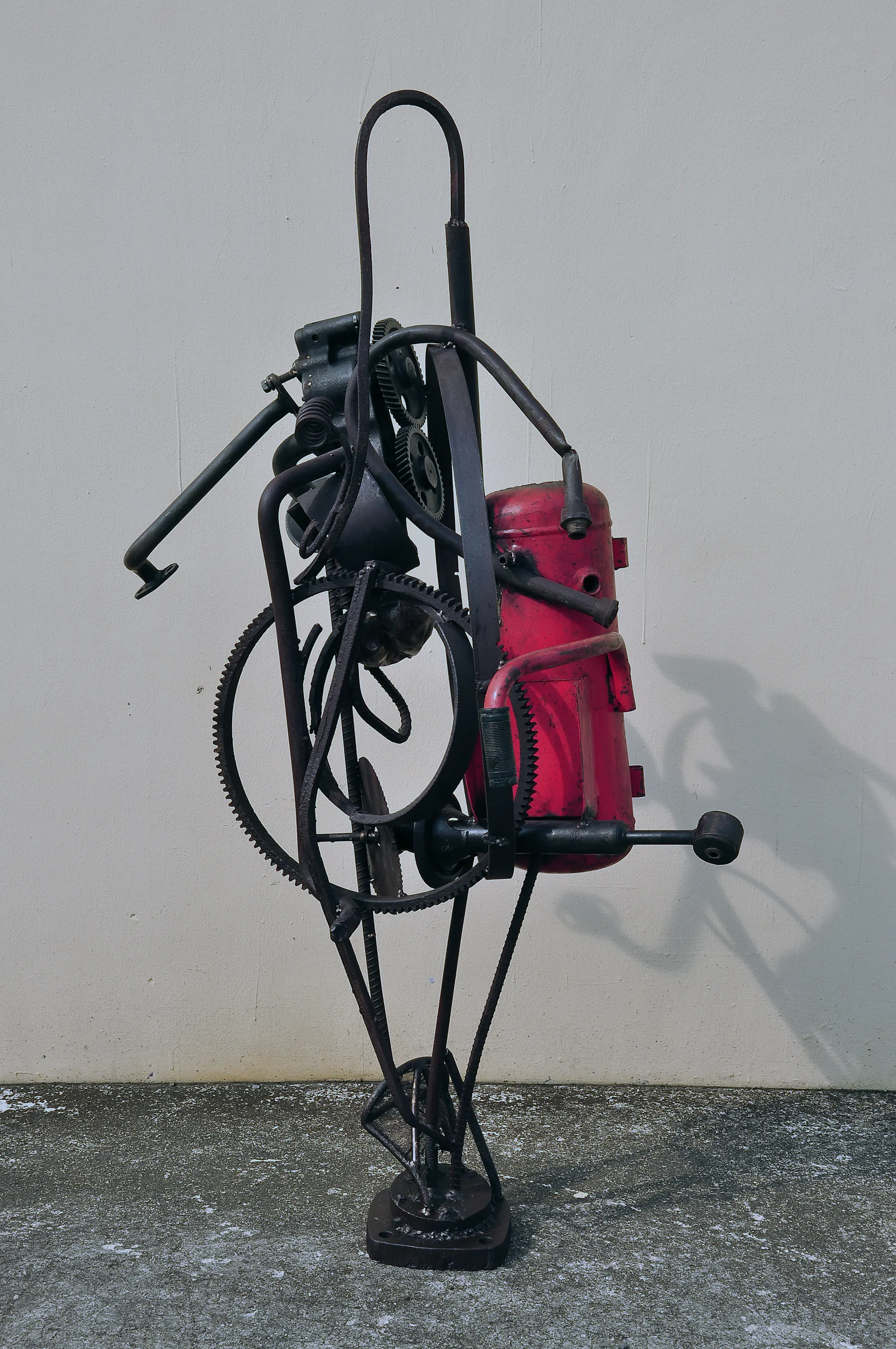 近期作品仍以鐵現成物創作媒材,創作中不事先打稿,按著意念自由建構,透過對鐵件的自然造形與身體(手)的勞動(包括燃燒與焊接),使作品呈現豐富的色彩與鐵銹况味是最大的特色。