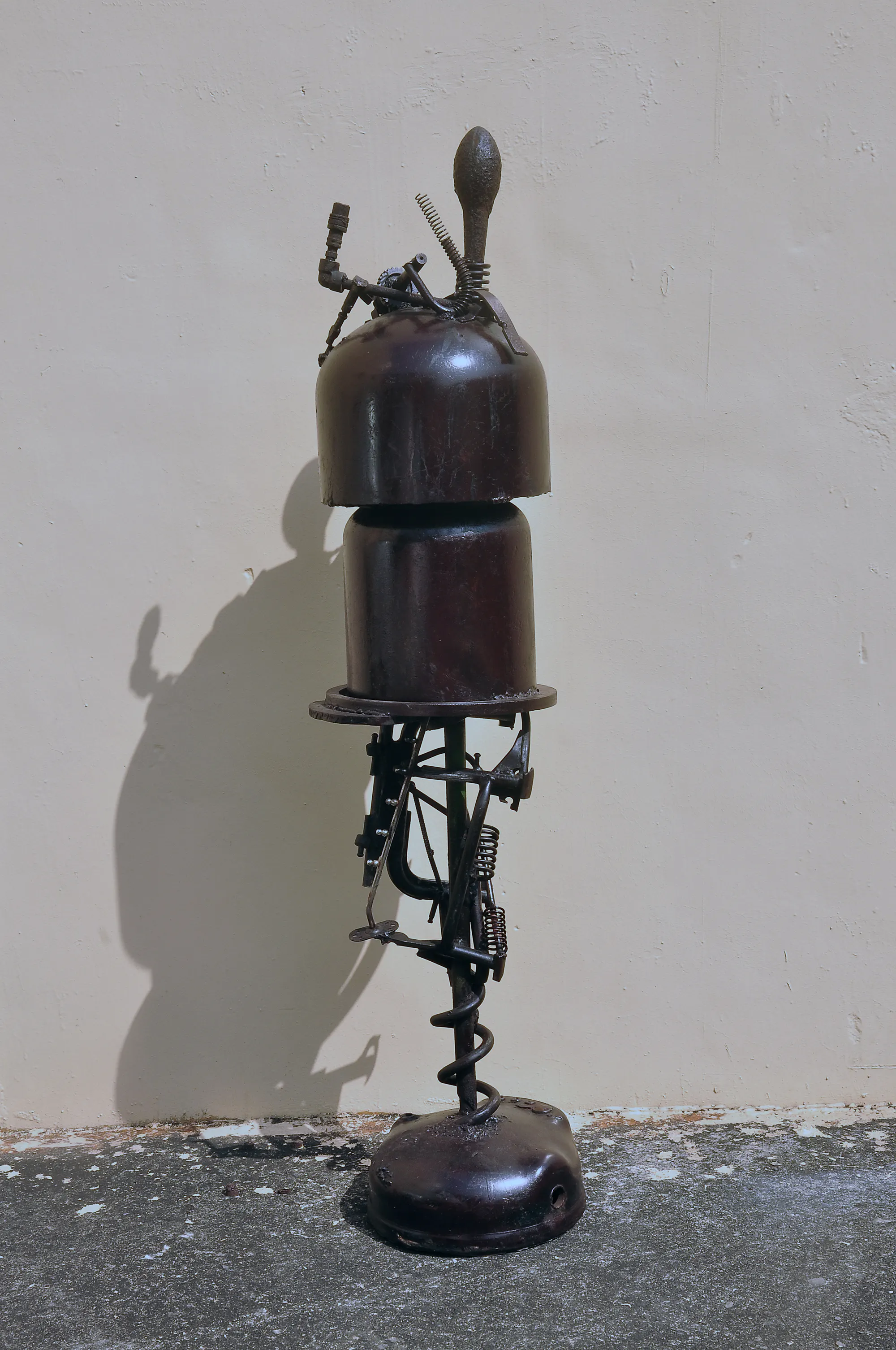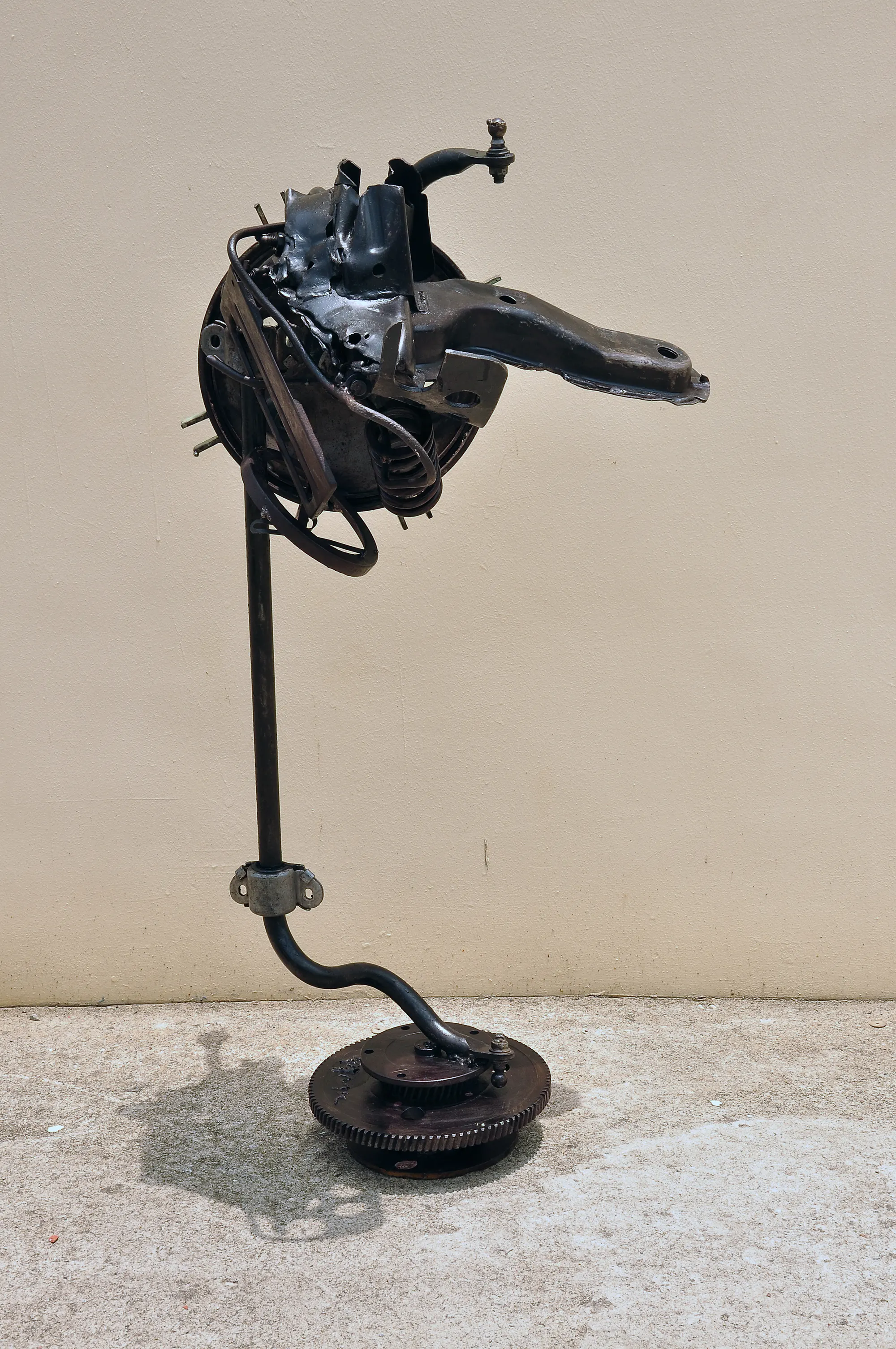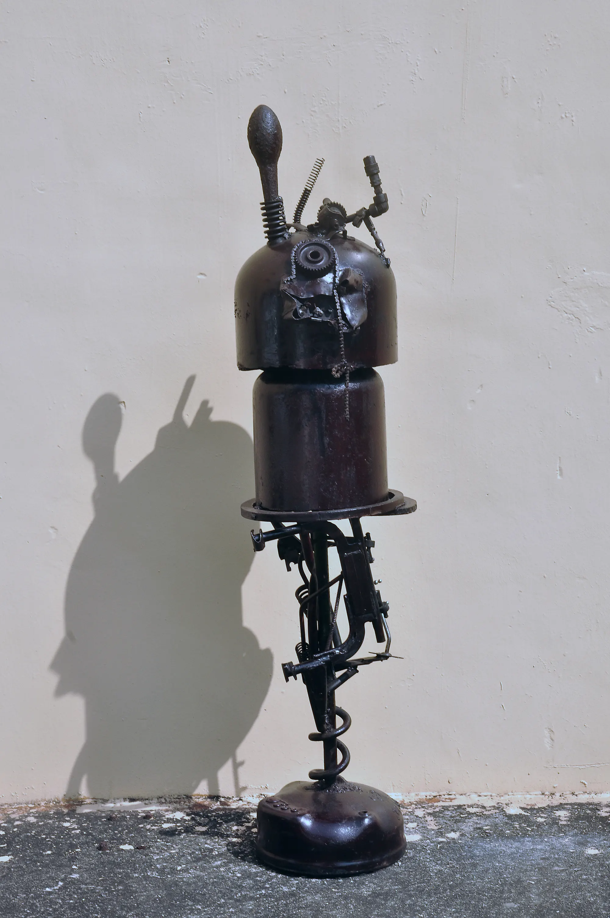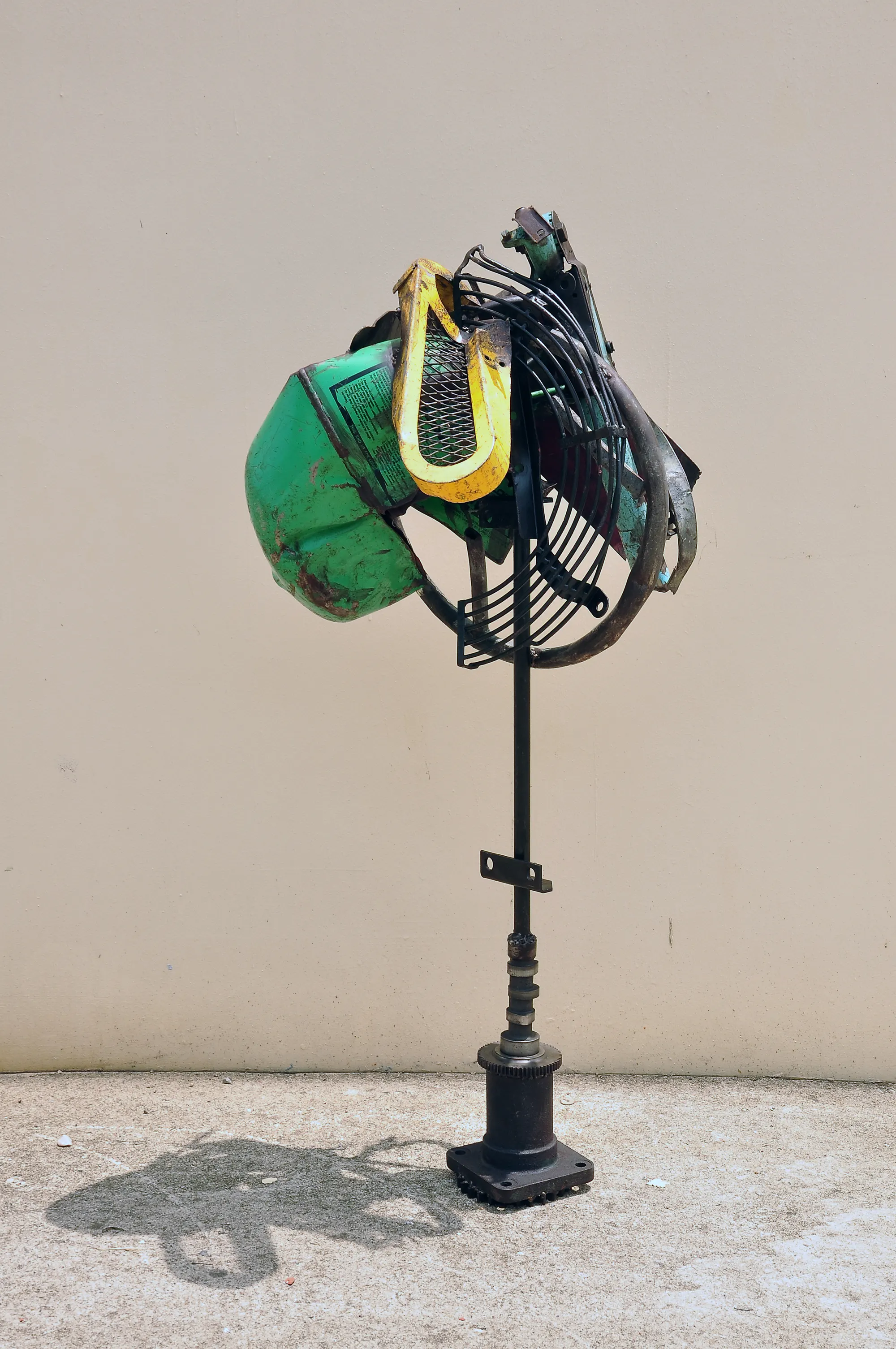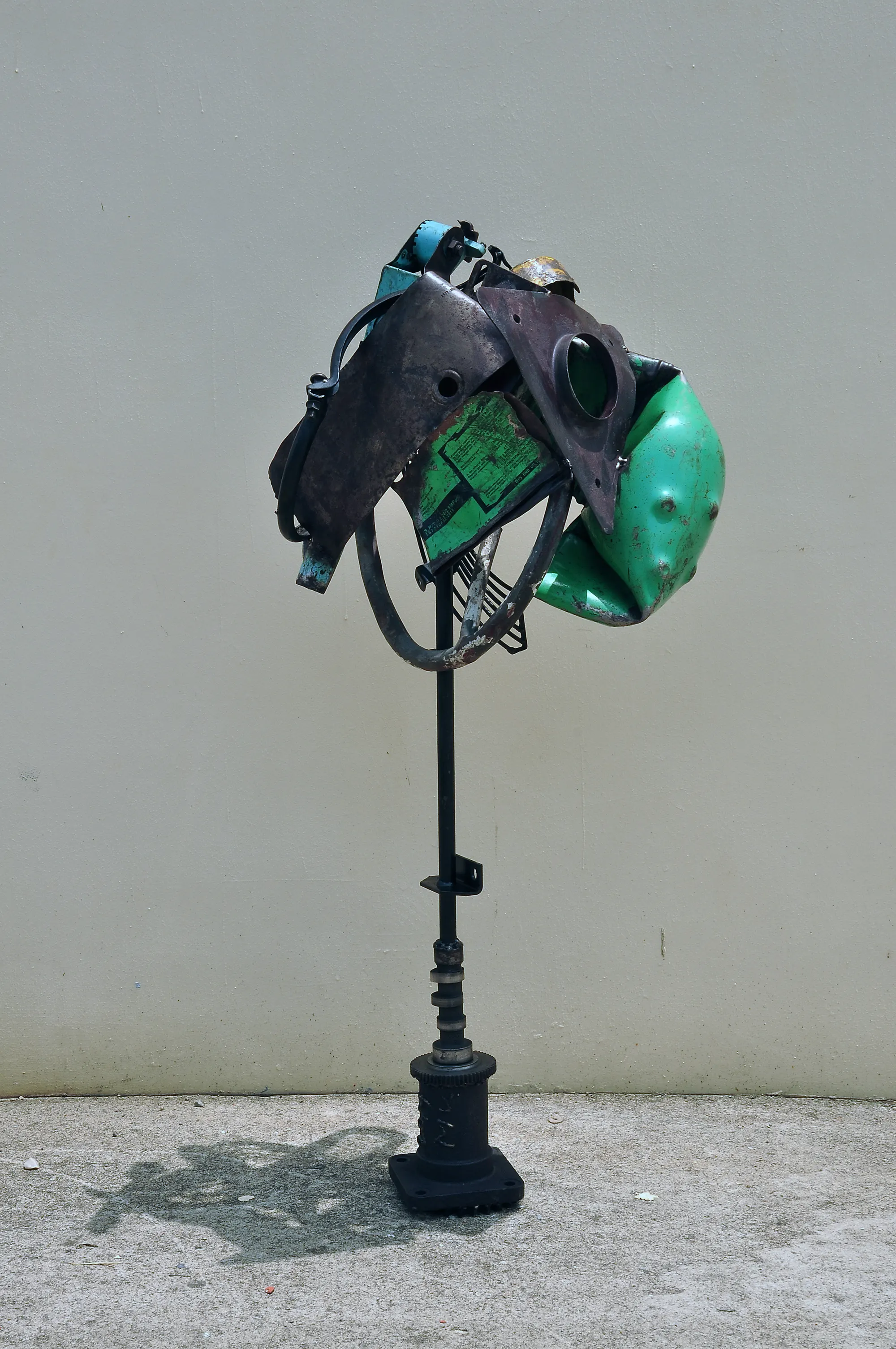 近期作品仍以鐵現成物創作媒材,創作中不事先打稿,按著意念自由建構,透過對鐵件的自然造形與身體(手)的勞動(包括燃燒與焊接),使作品呈現豐富的色彩與鐵銹况味是最大的特色。