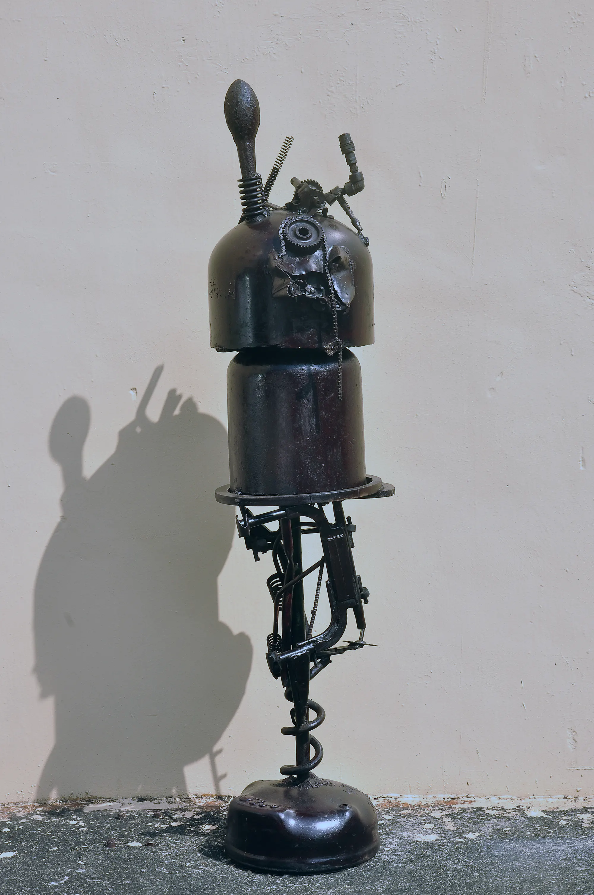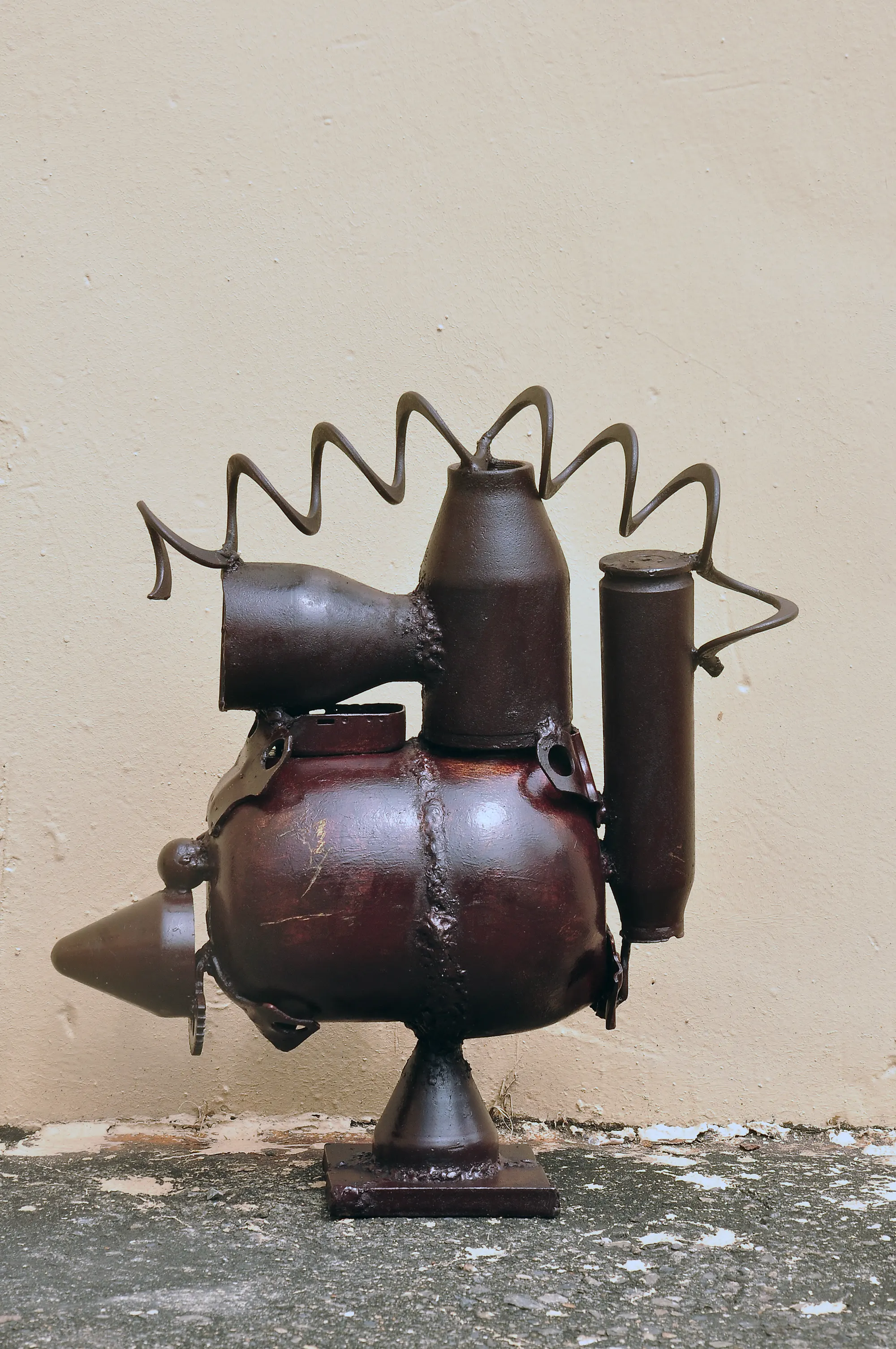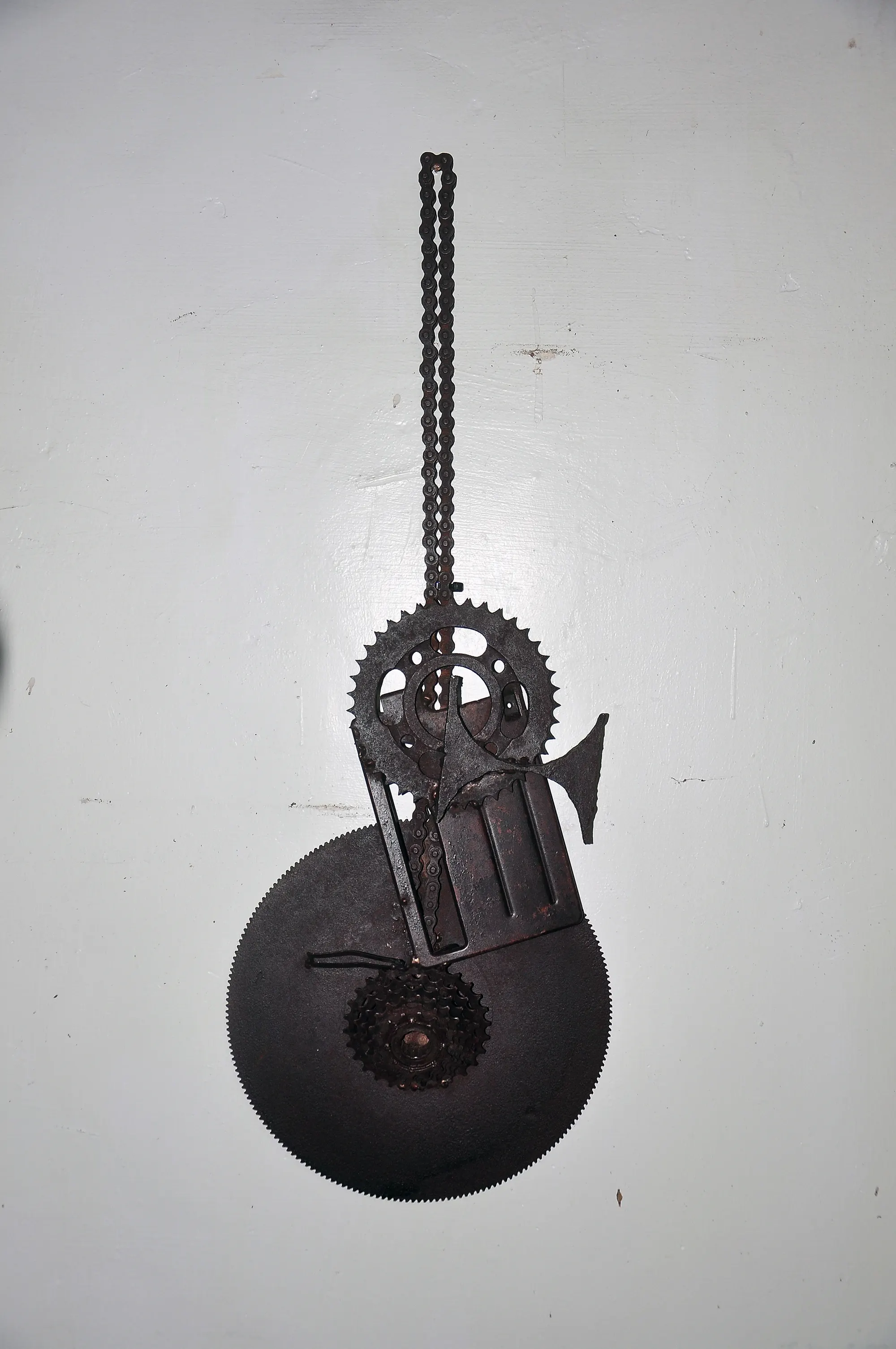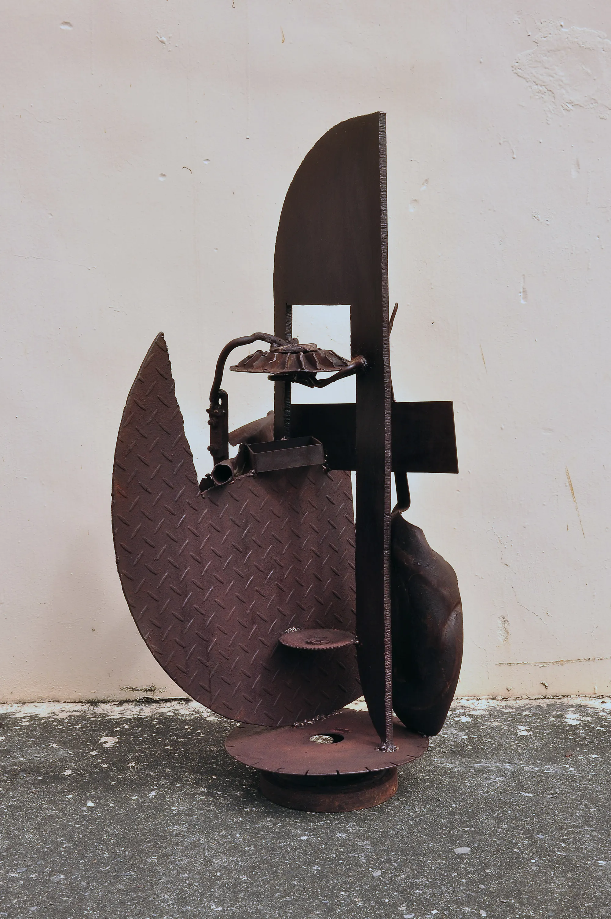 近期作品仍以鐵現成物創作媒材,創作中不事先打稿,按著意念自由建構,透過對鐵件的自然造形與身體(手)的勞動(包括燃燒與焊接),使作品呈現豐富的色彩與鐵銹况味是最大的特色。