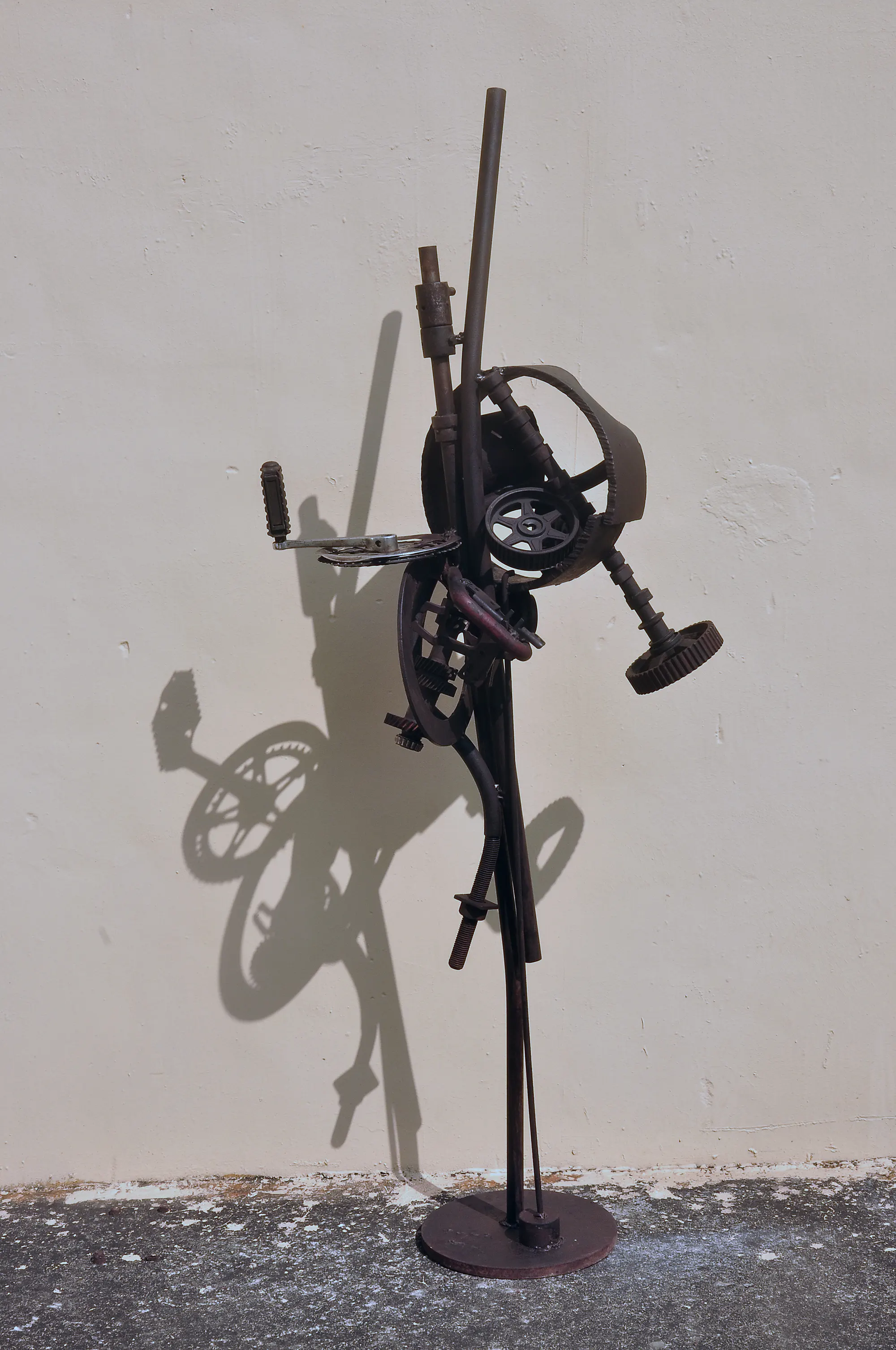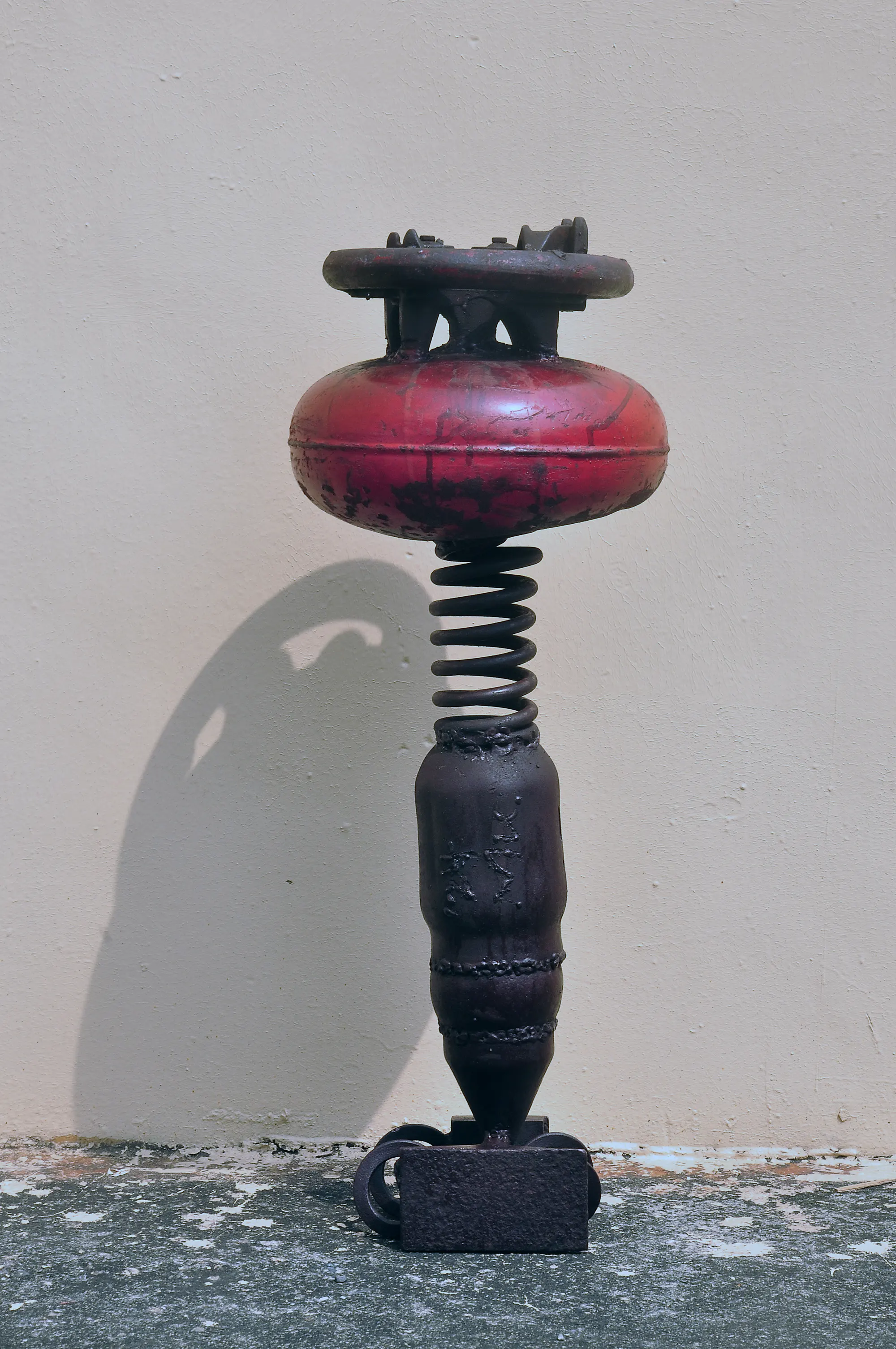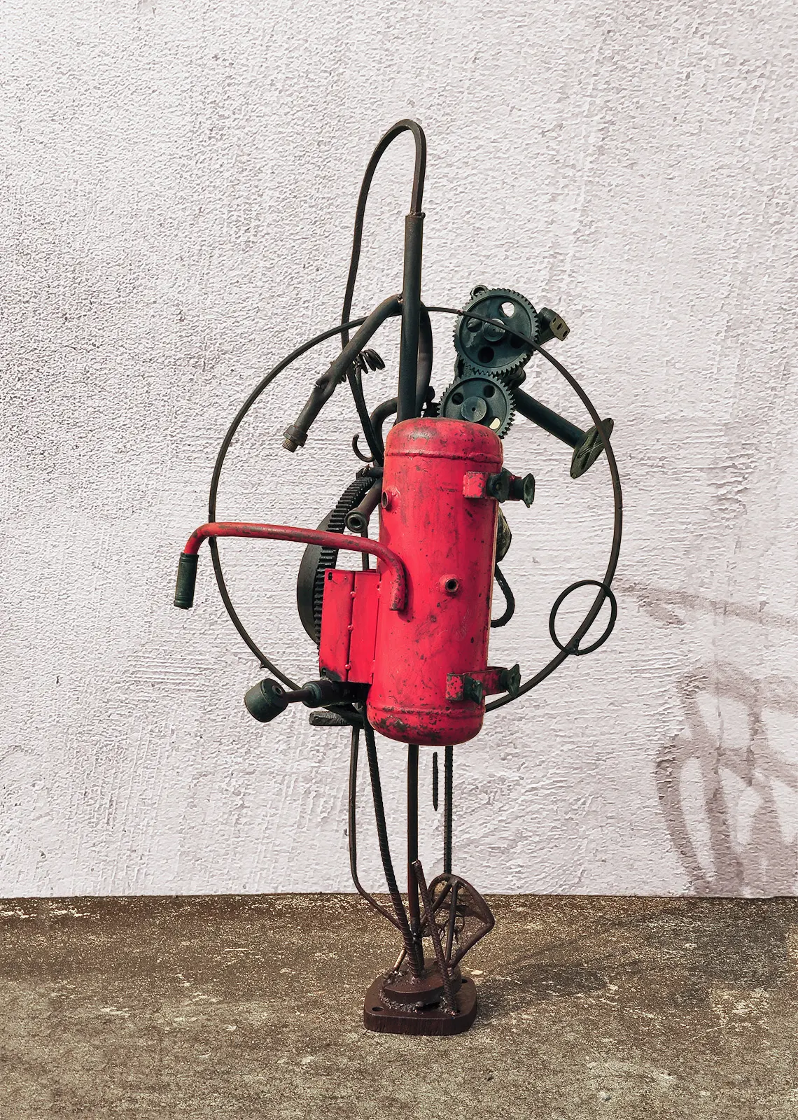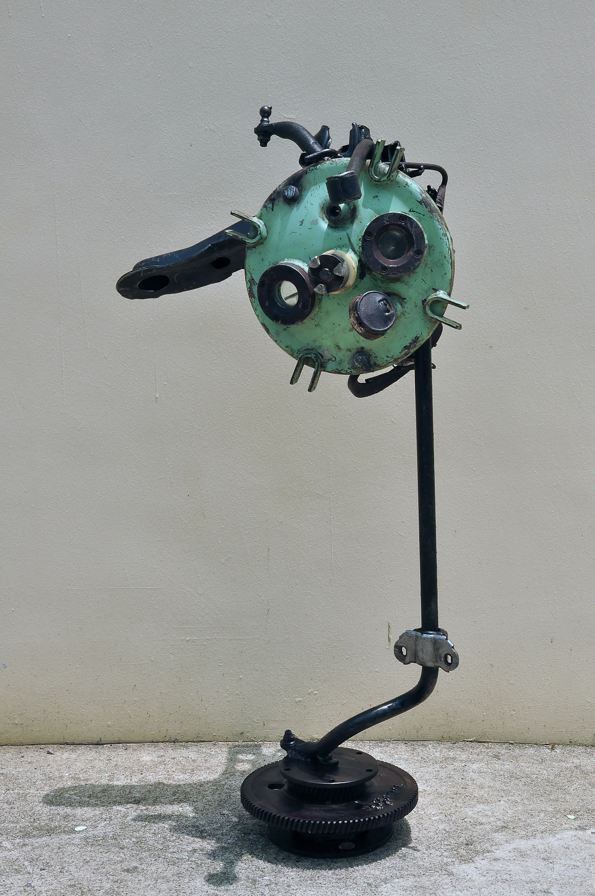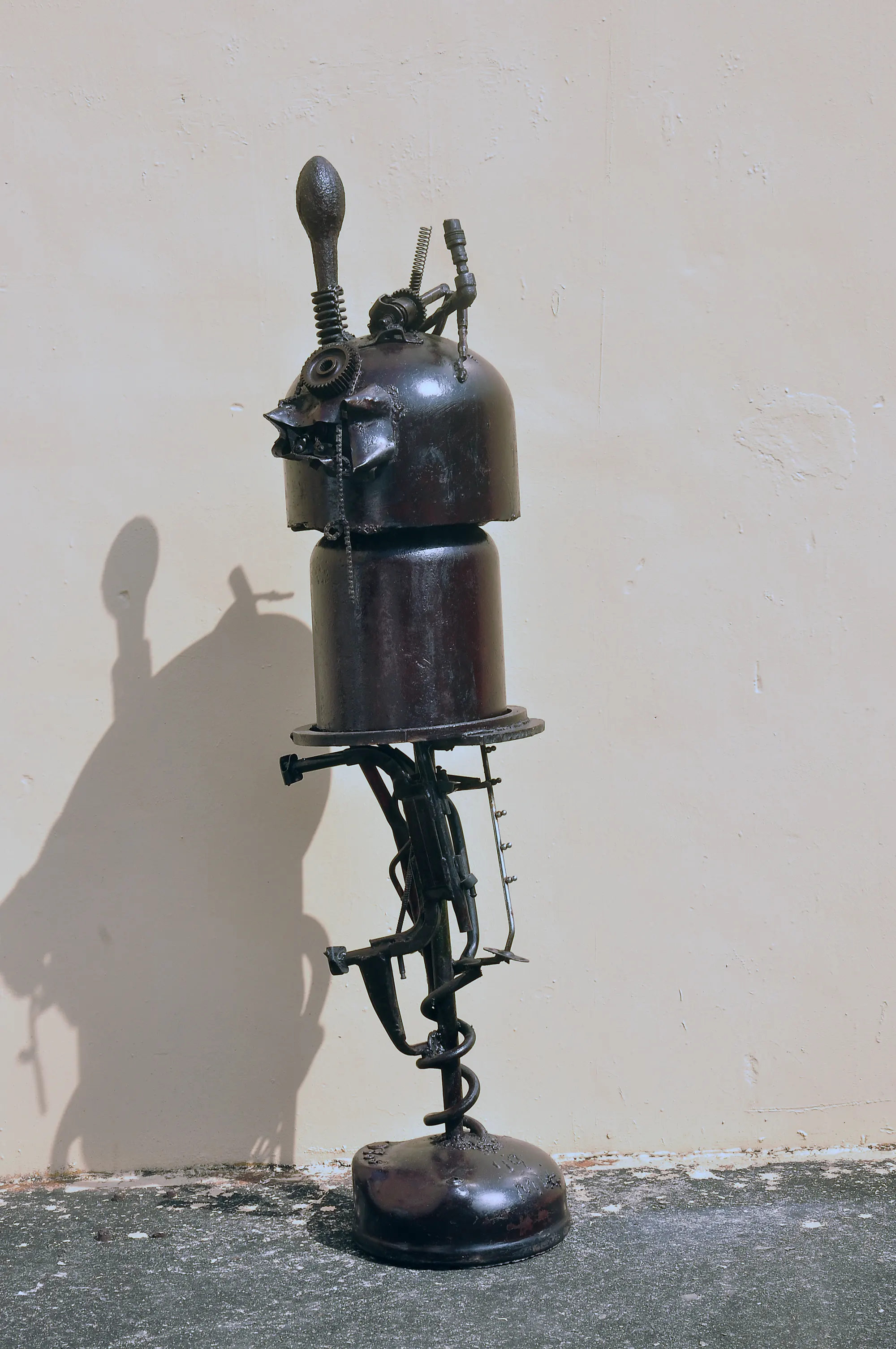 近期作品仍以鐵現成物創作媒材,創作中不事先打稿,按著意念自由建構,透過對鐵件的自然造形與身體(手)的勞動(包括燃燒與焊接),使作品呈現豐富的色彩與鐵銹况味是最大的特色。