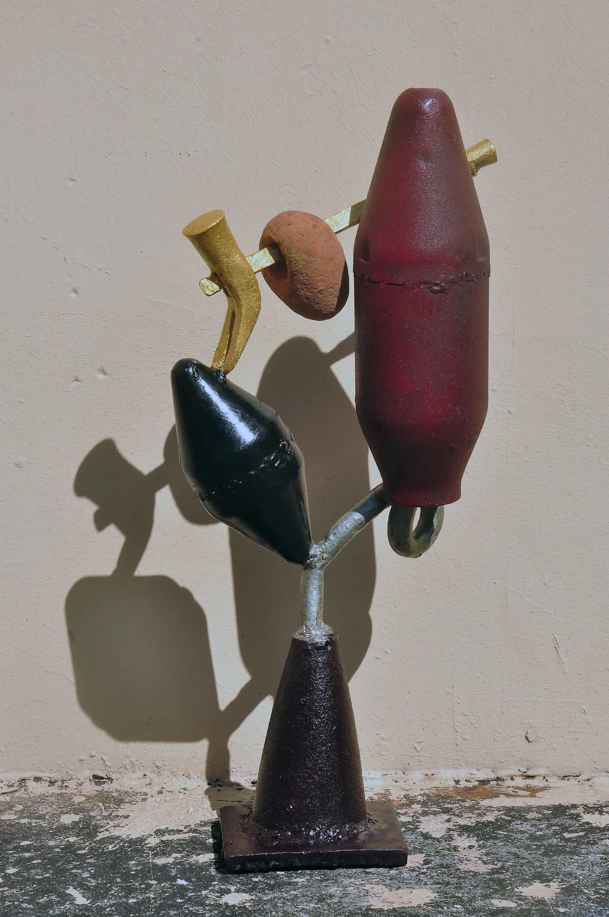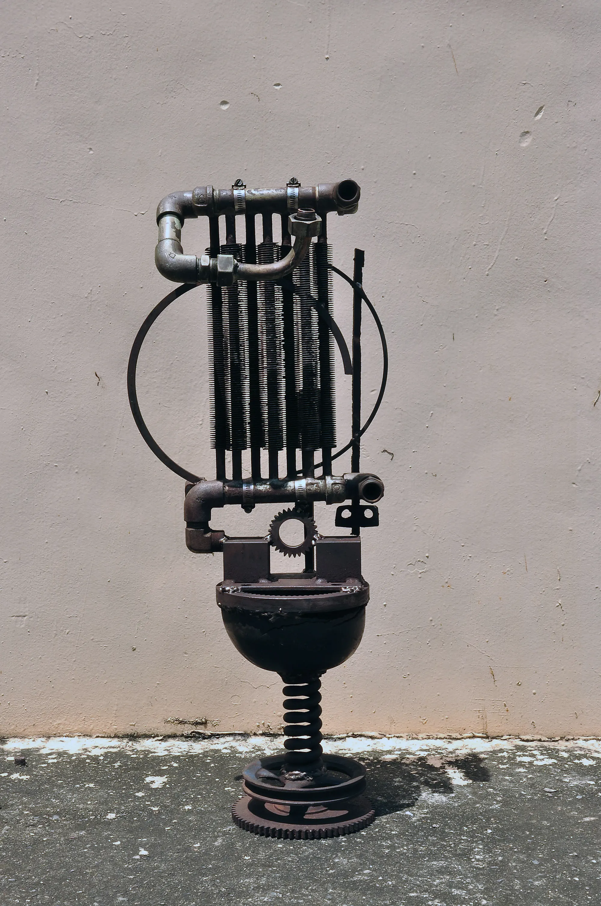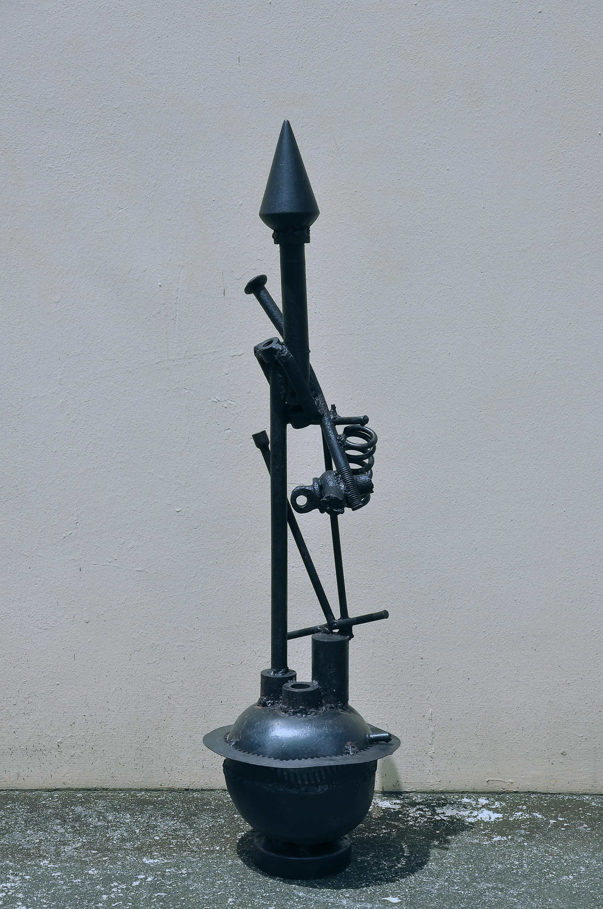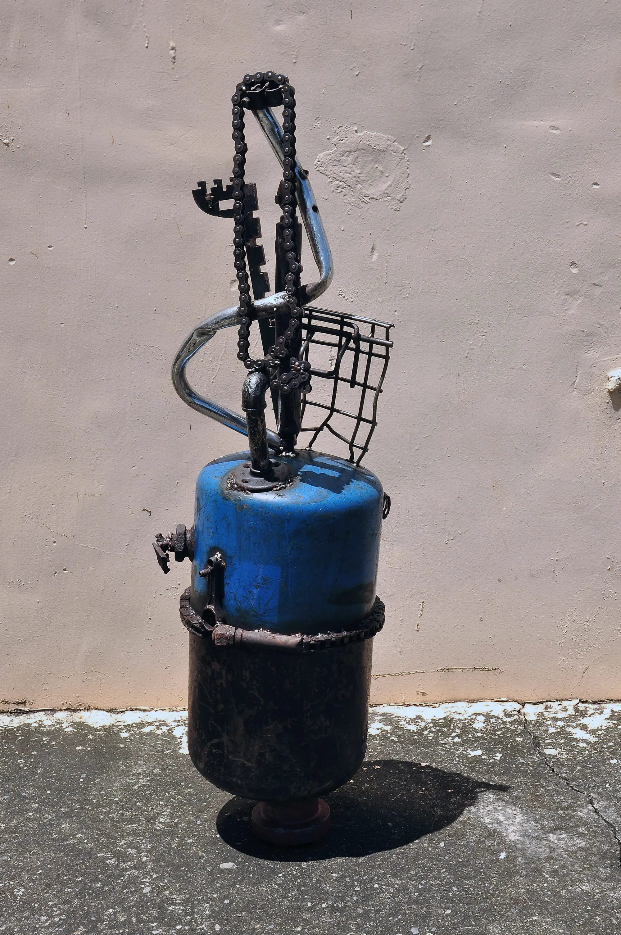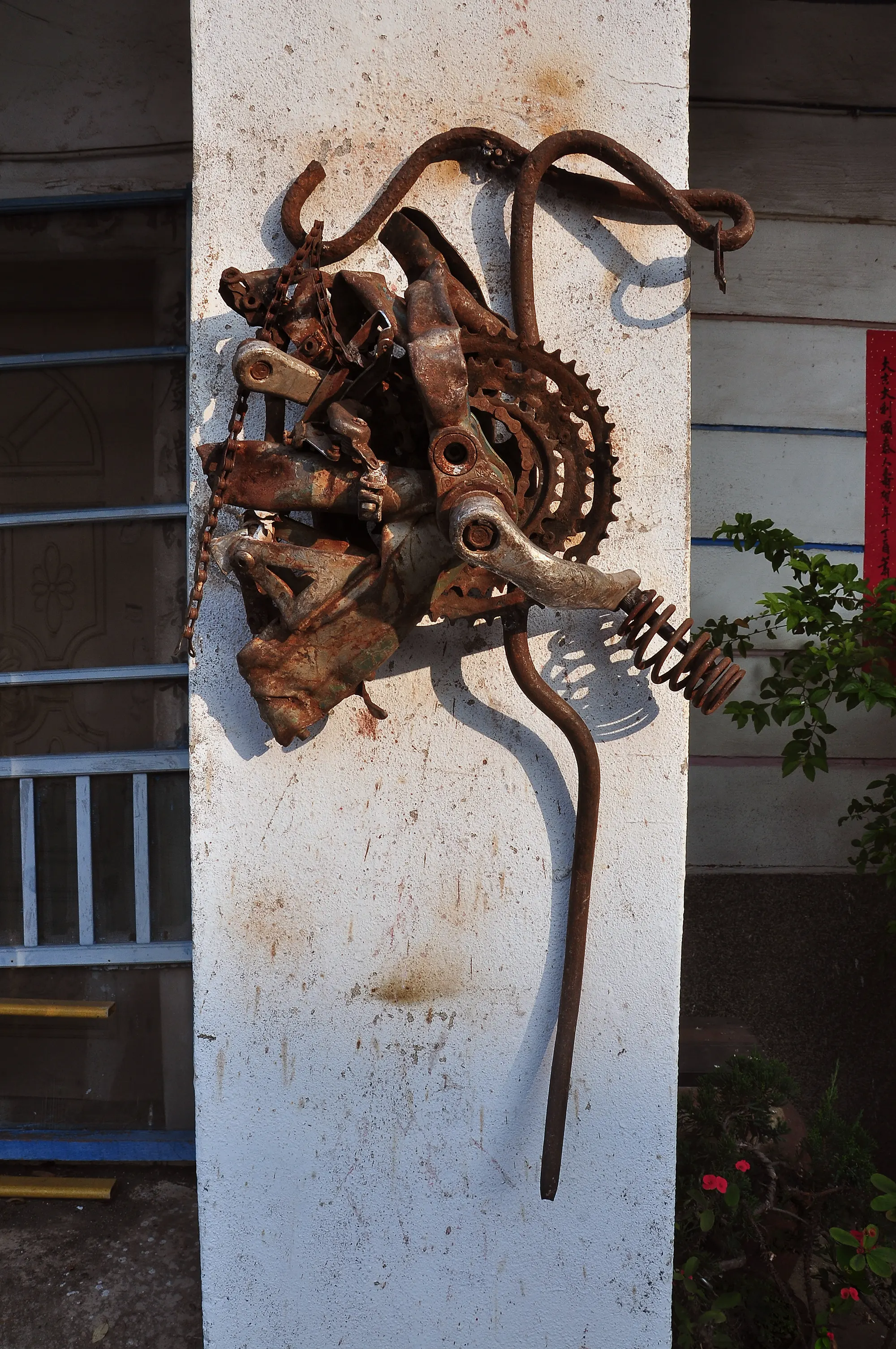 近期作品仍以鐵現成物創作媒材,創作中不事先打稿,按著意念自由建構,透過對鐵件的自然造形與身體(手)的勞動(包括燃燒與焊接),使作品呈現豐富的色彩與鐵銹况味是最大的特色。