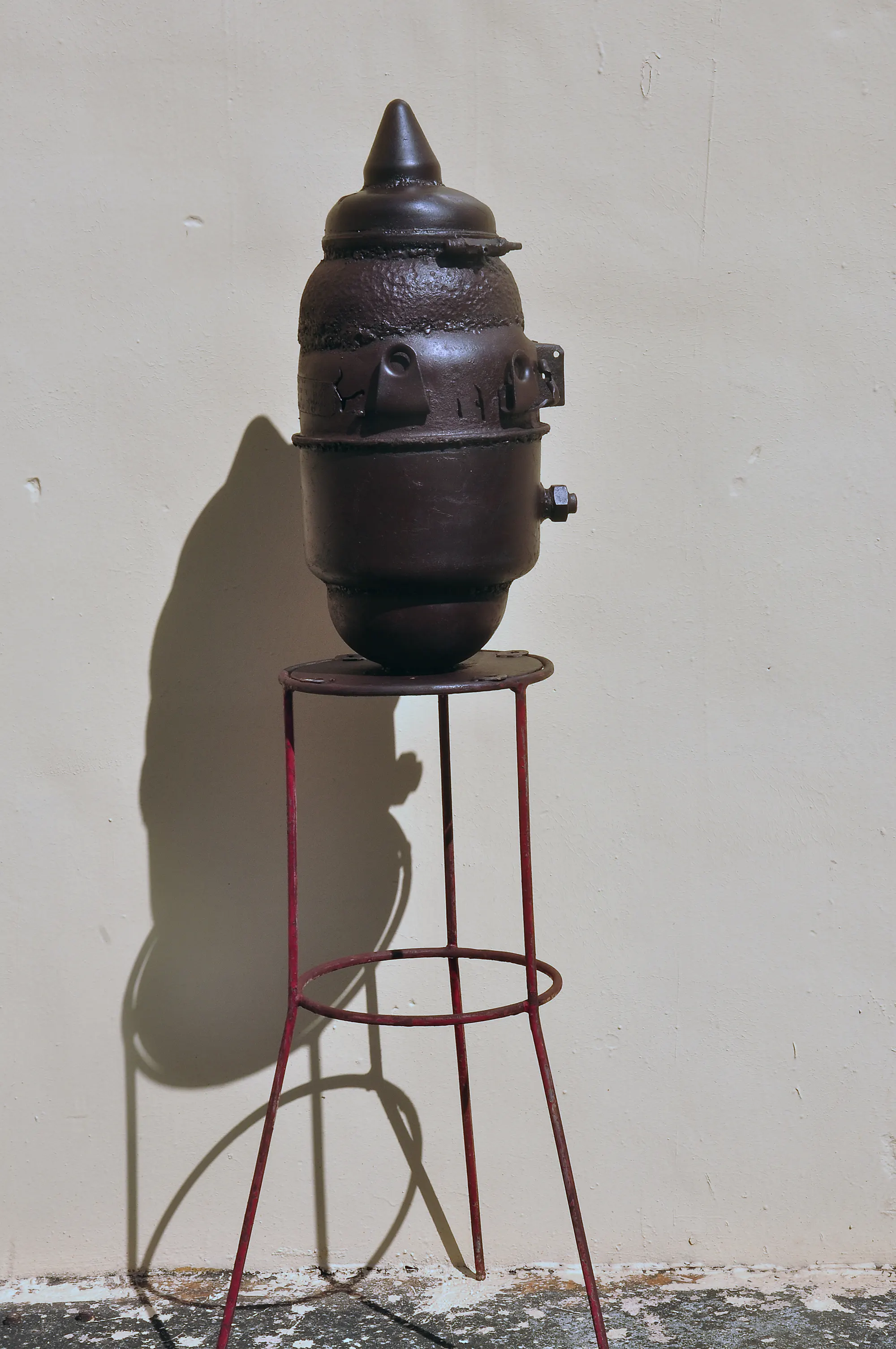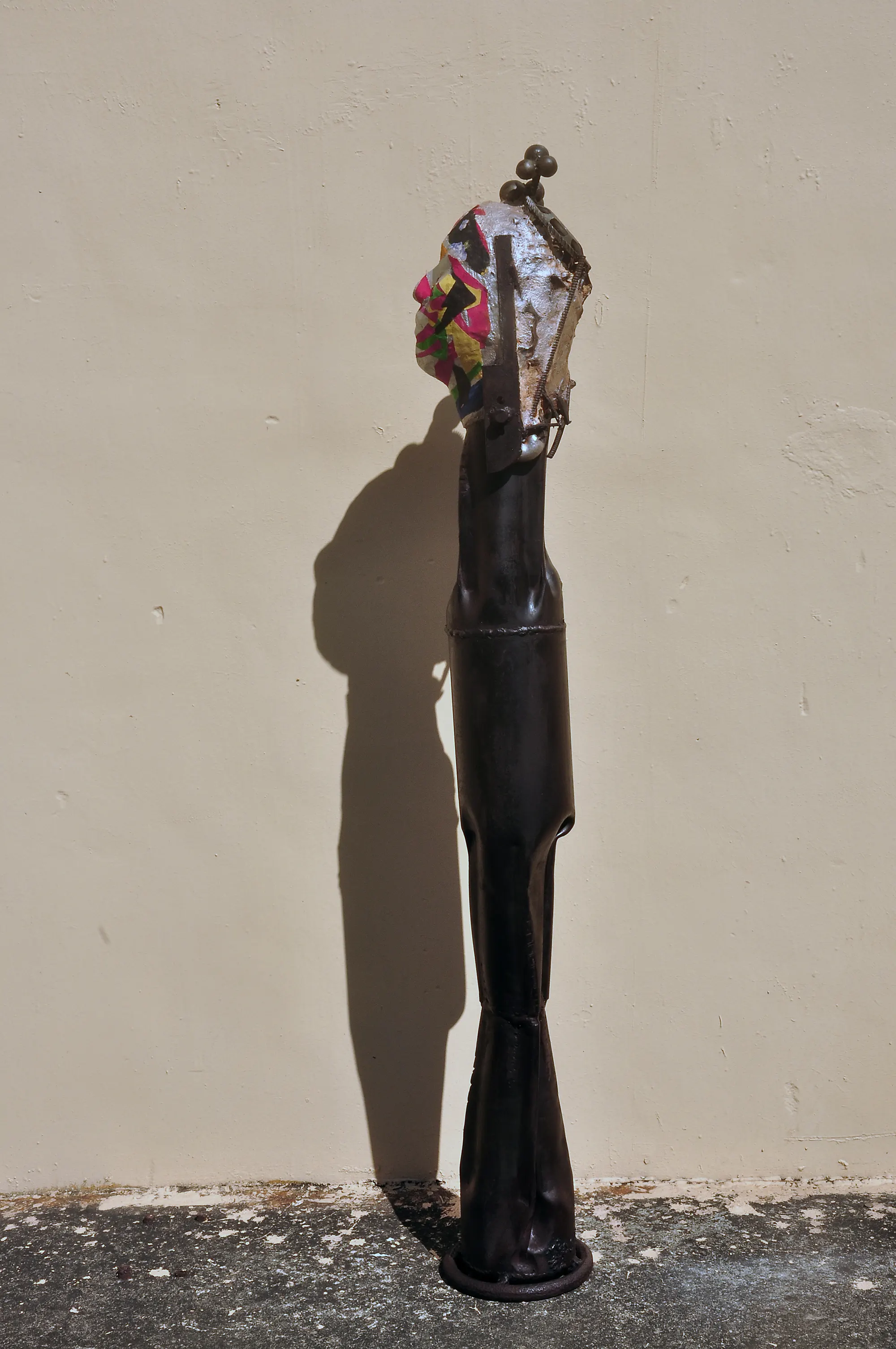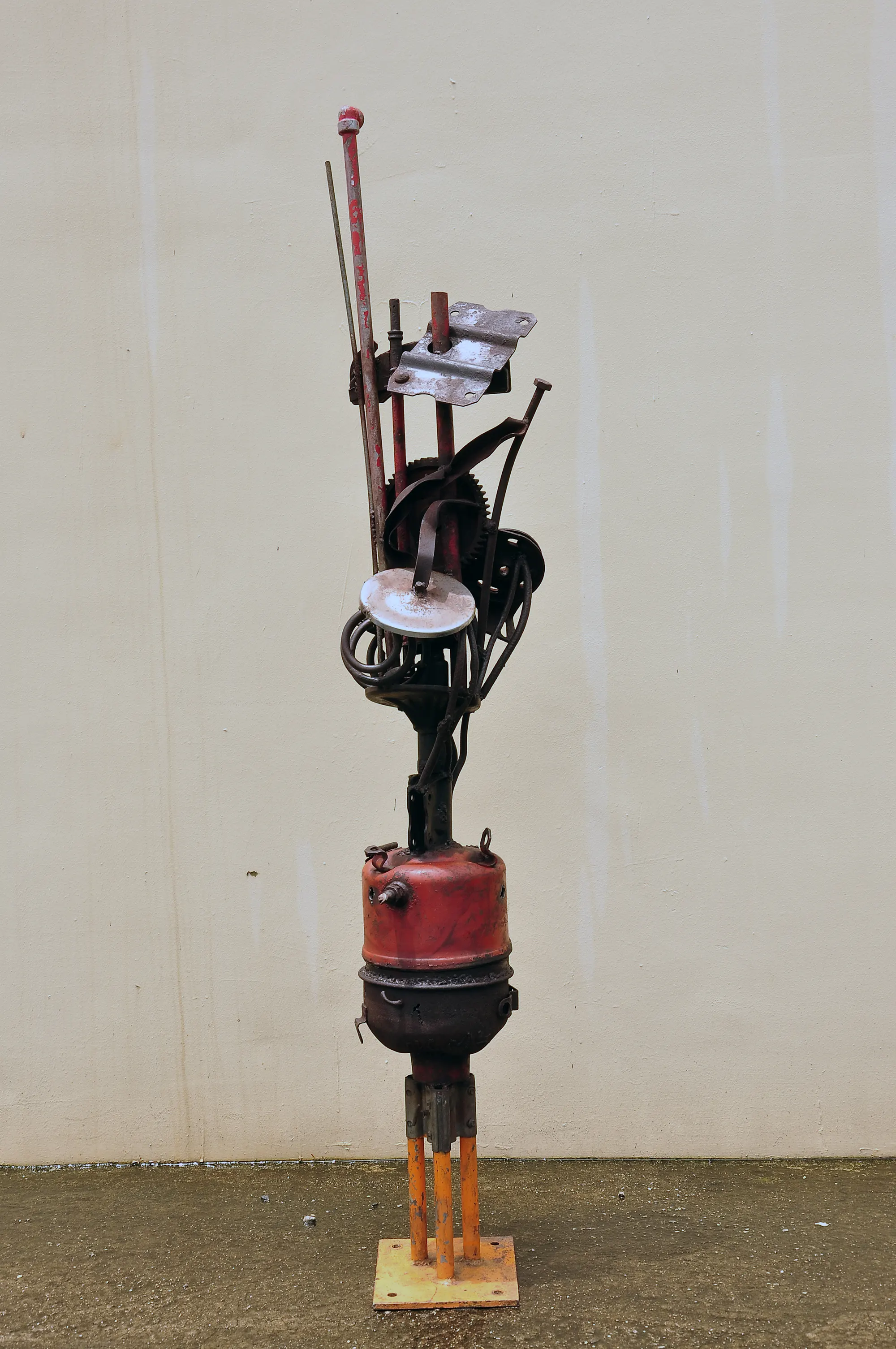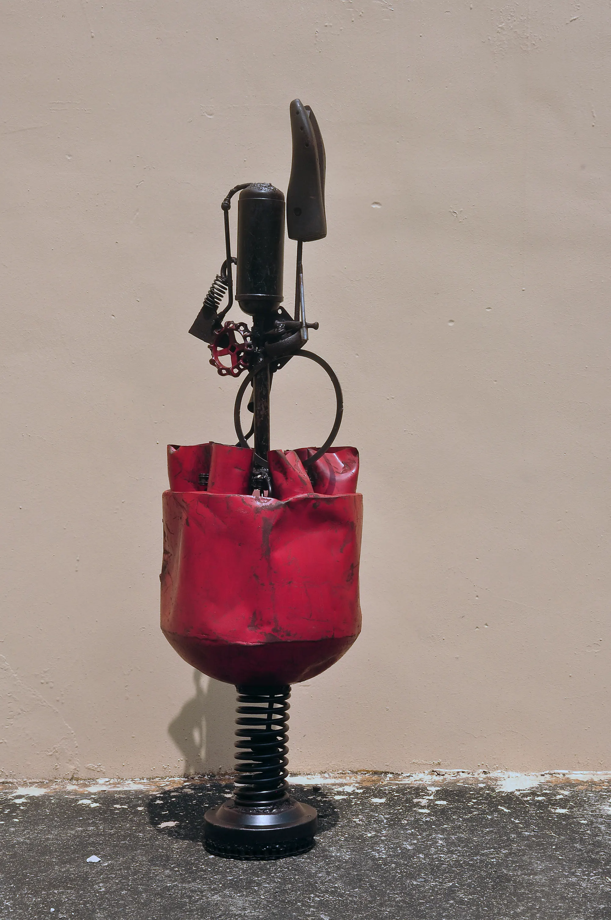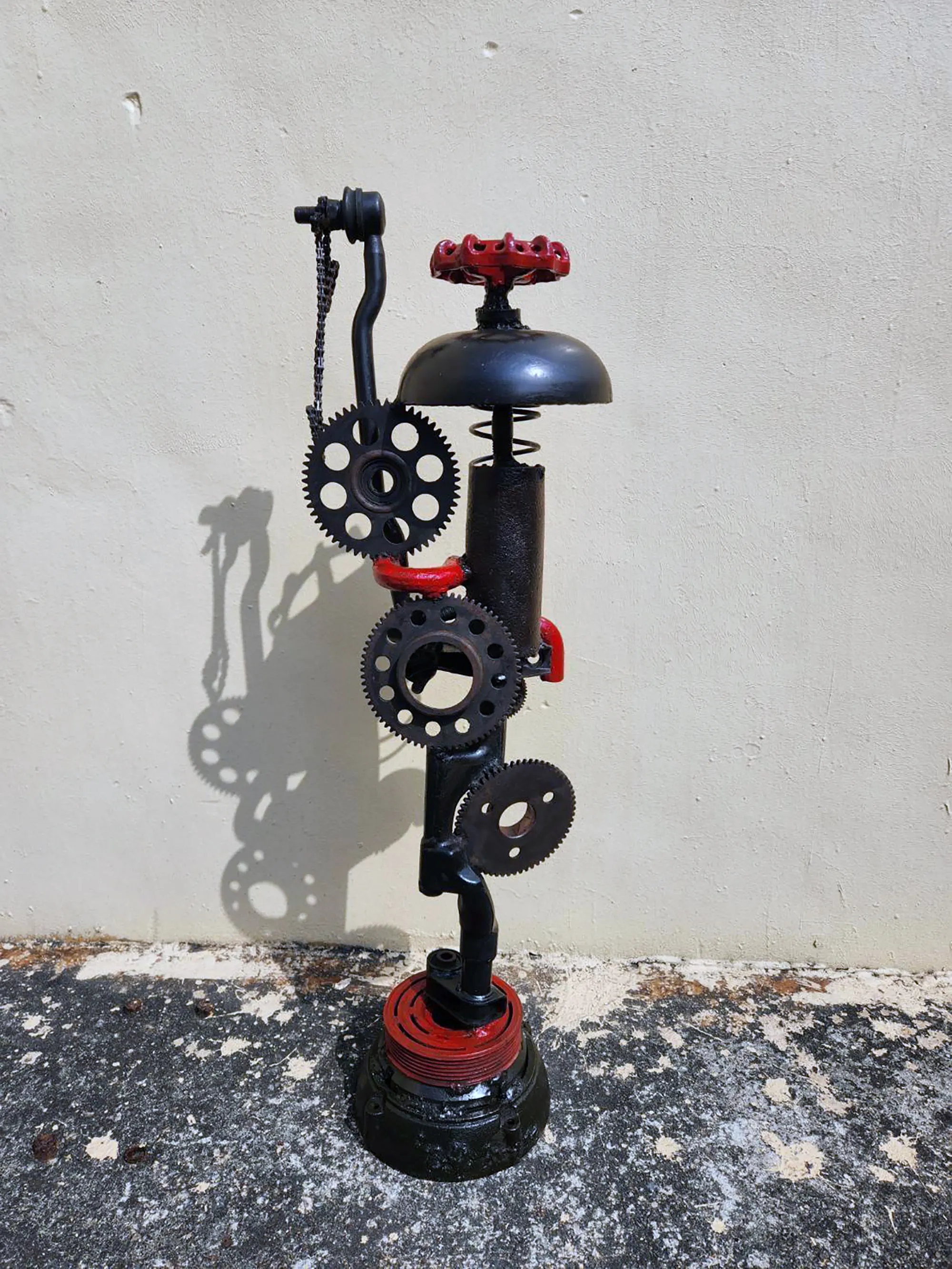 近期作品仍以鐵現成物創作媒材,創作中不事先打稿,按著意念自由建構,透過對鐵件的自然造形與身體(手)的勞動(包括燃燒與焊接),使作品呈現豐富的色彩與鐵銹况味是最大的特色。