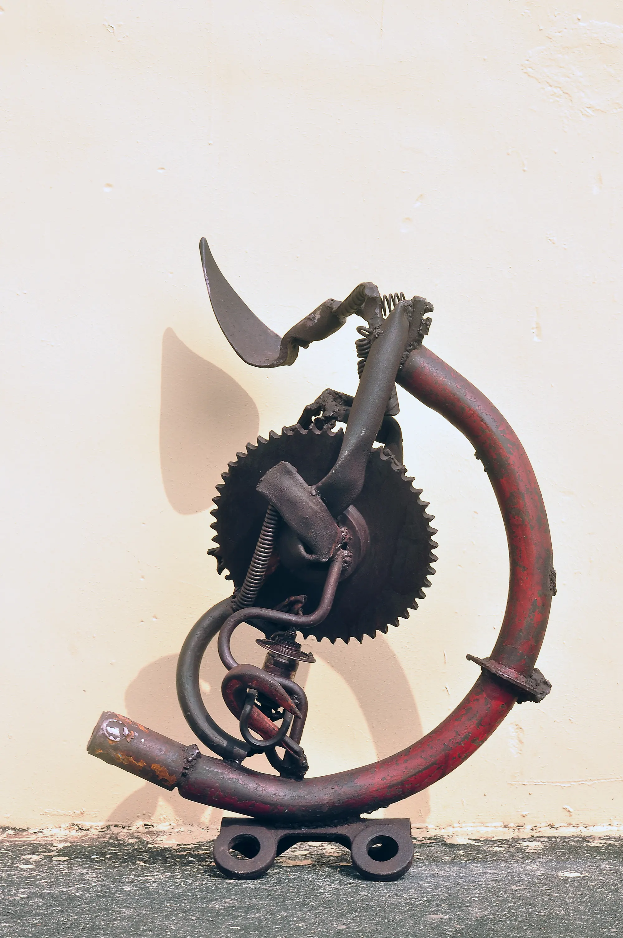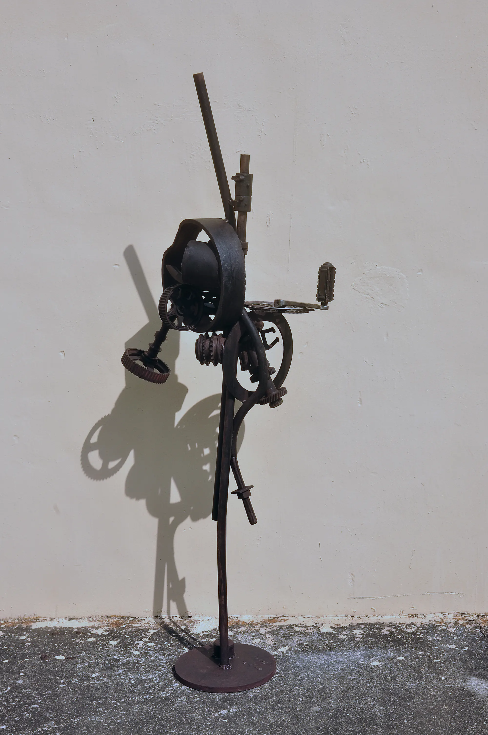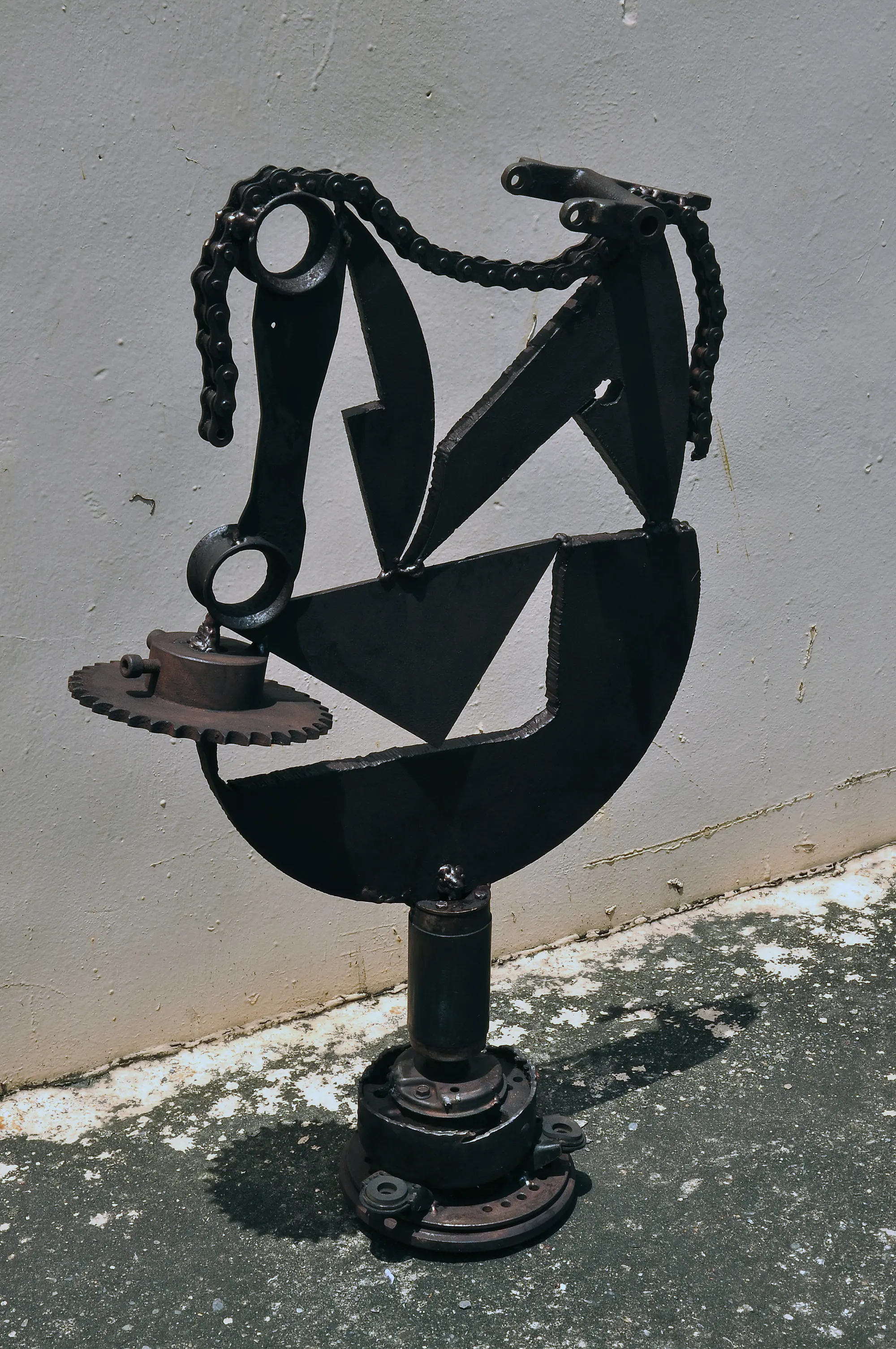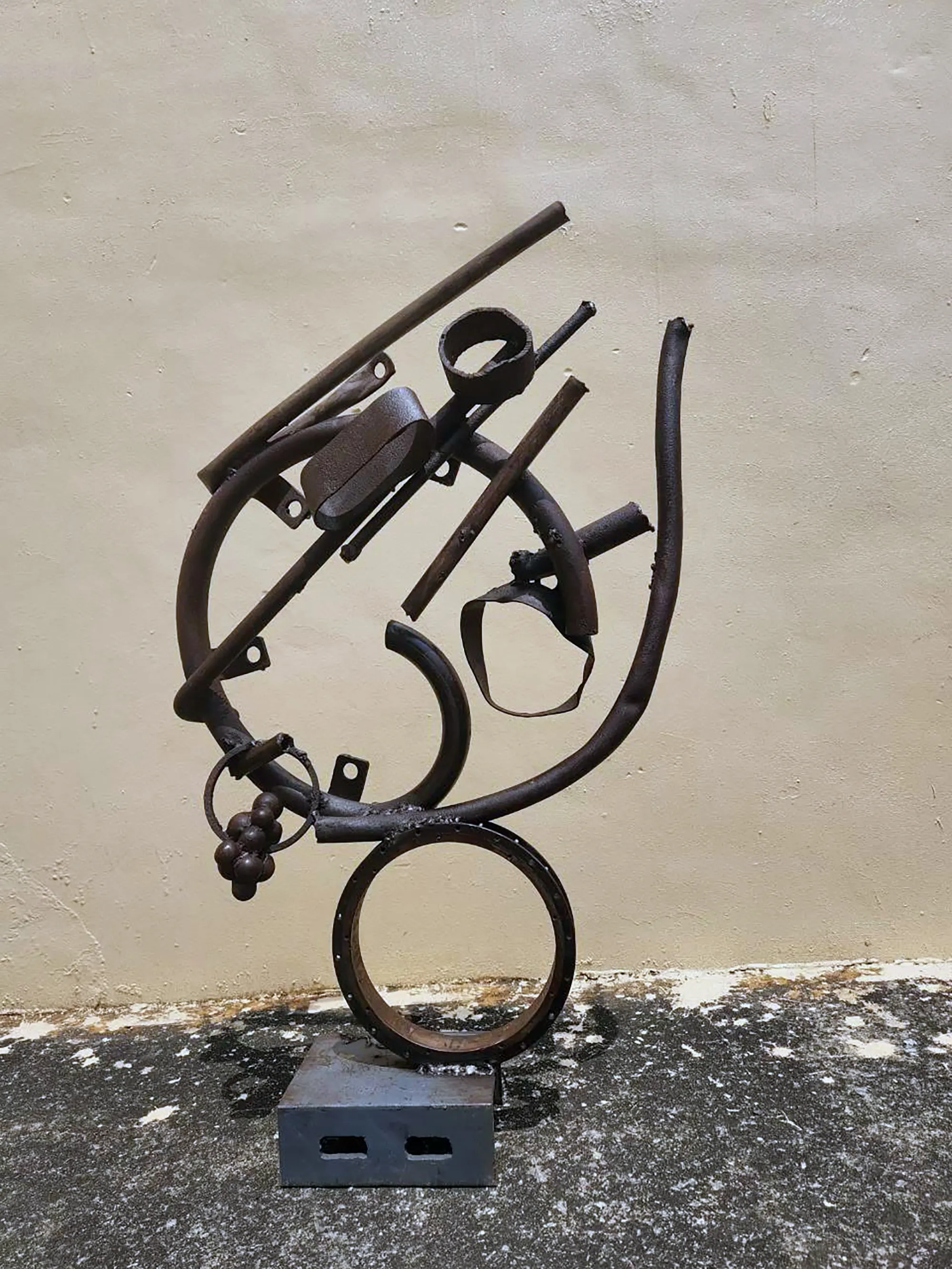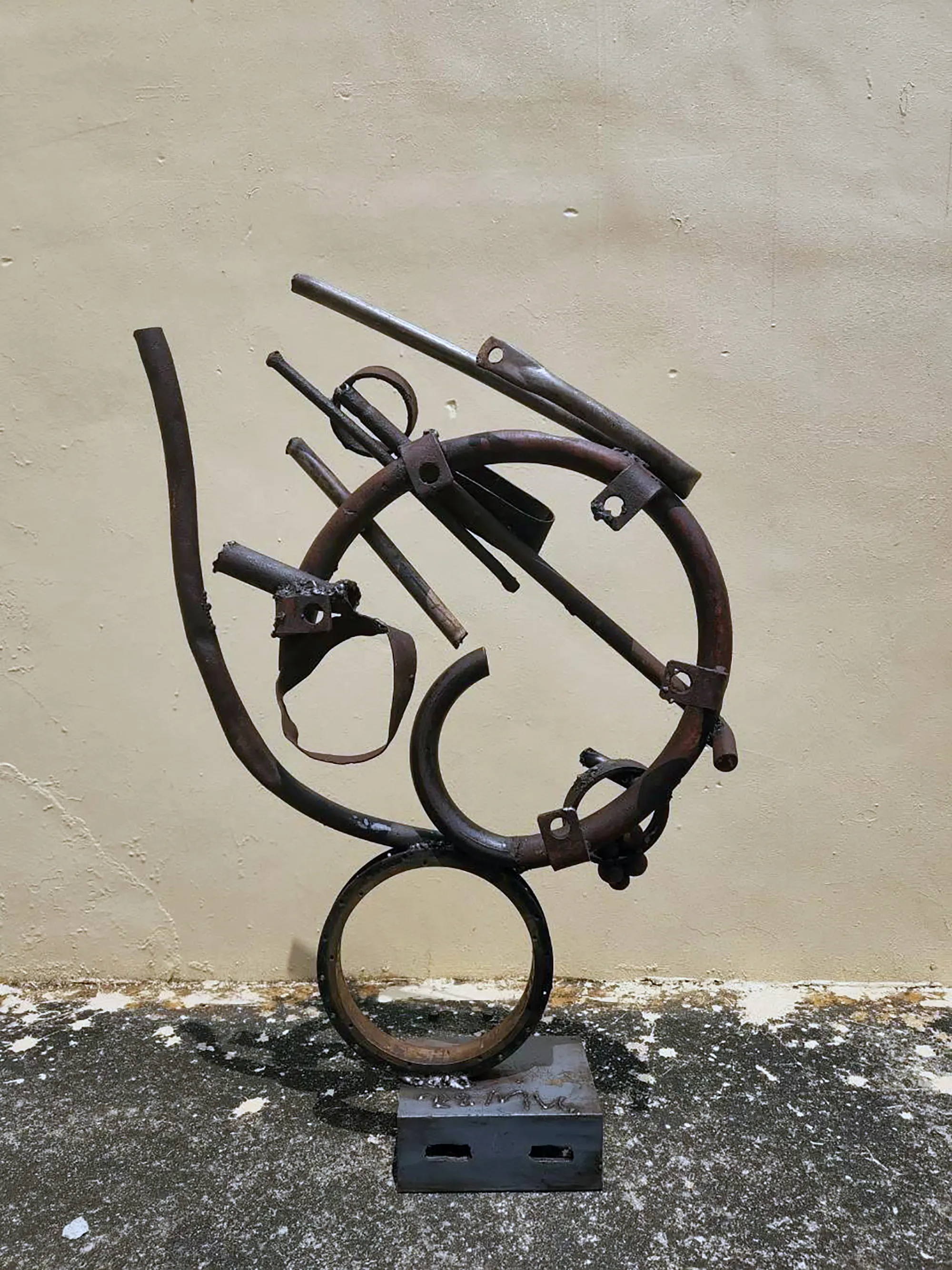 我的鐵雕作品在某種程度上有一種集合藝術的趣味,也具備了隨意組合、拆解的特質。在創作中我動手收集,重新拼貼、組合,那種對完成品輪廓概貌,一直處於「未知」的刺激是我的創作思考邏輯。也藉著與鐵件的零距離接觸,並藉著長期以來對「形」的敏感度不斷的在廢鐵堆中找尋靈感與生活緊密的结合,永遠在轉變中製造新奇,造就了一件件作品的完成。