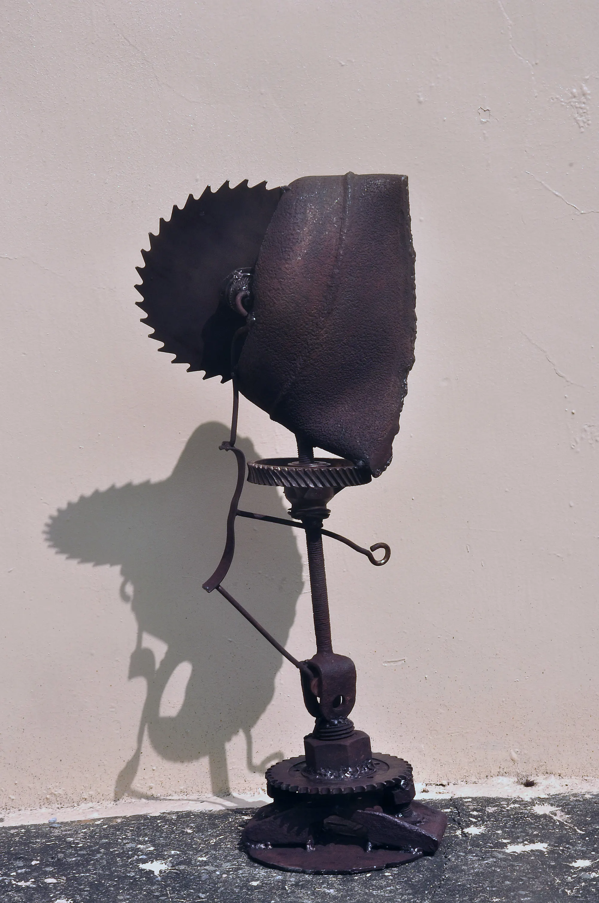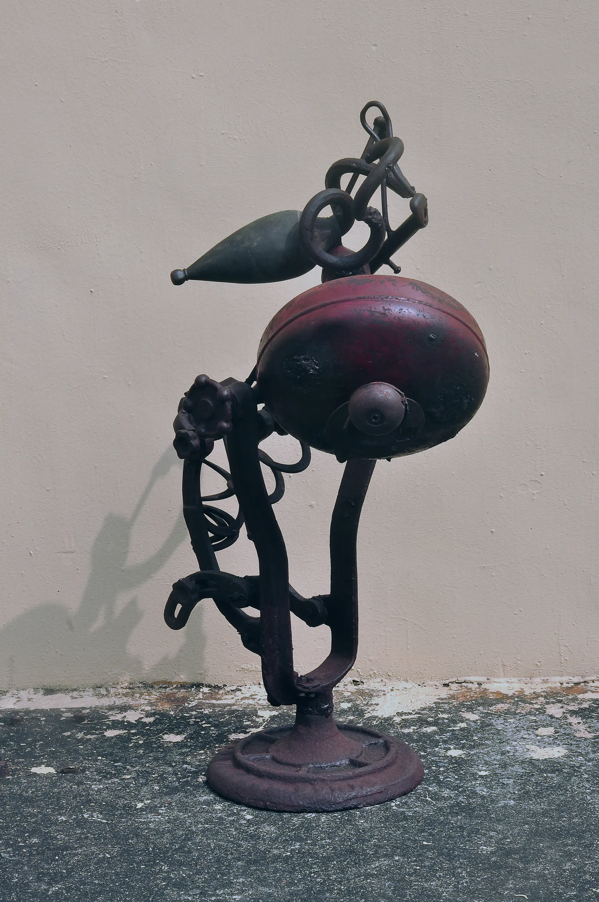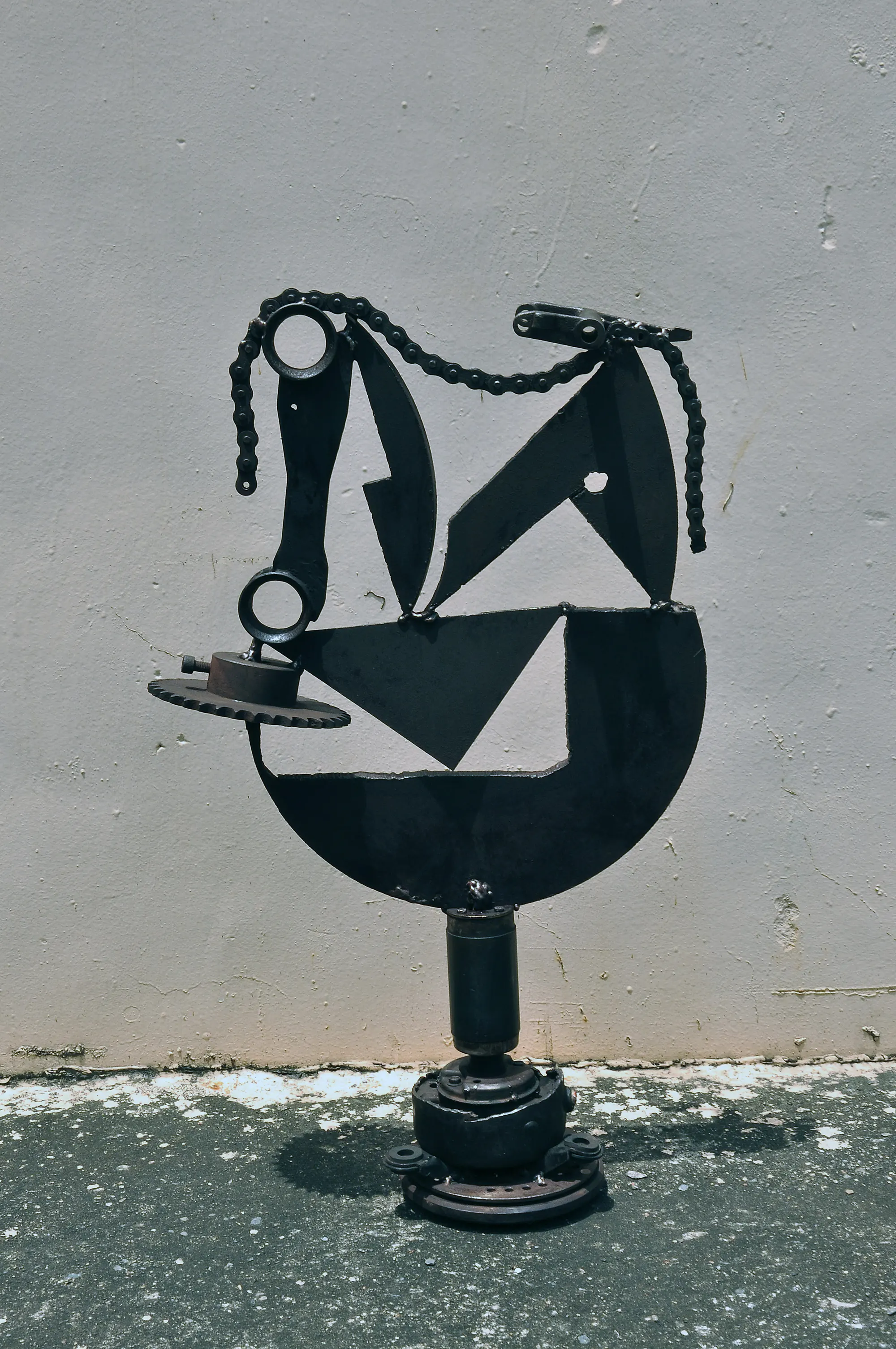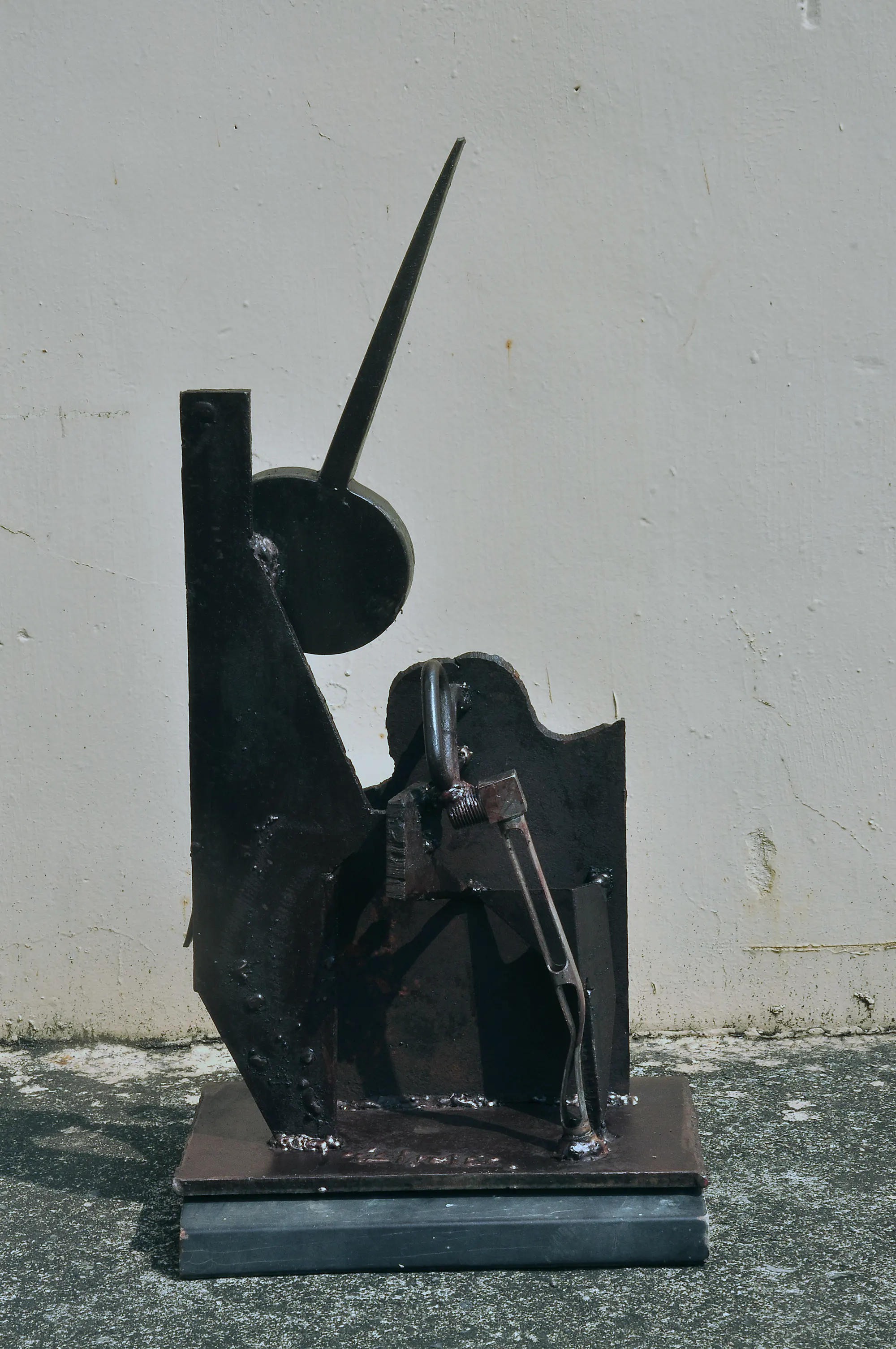 我的鐵雕作品在某種程度上有一種集合藝術的趣味,也具備了隨意組合、拆解的特質。在創作中我動手收集,重新拼貼、組合,那種對完成品輪廓概貌,一直處於「未知」的刺激是我的創作思考邏輯。也藉著與鐵件的零距離接觸,並藉著長期以來對「形」的敏感度不斷的在廢鐵堆中找尋靈感與生活緊密的结合,永遠在轉變中製造新奇,造就了一件件作品的完成。