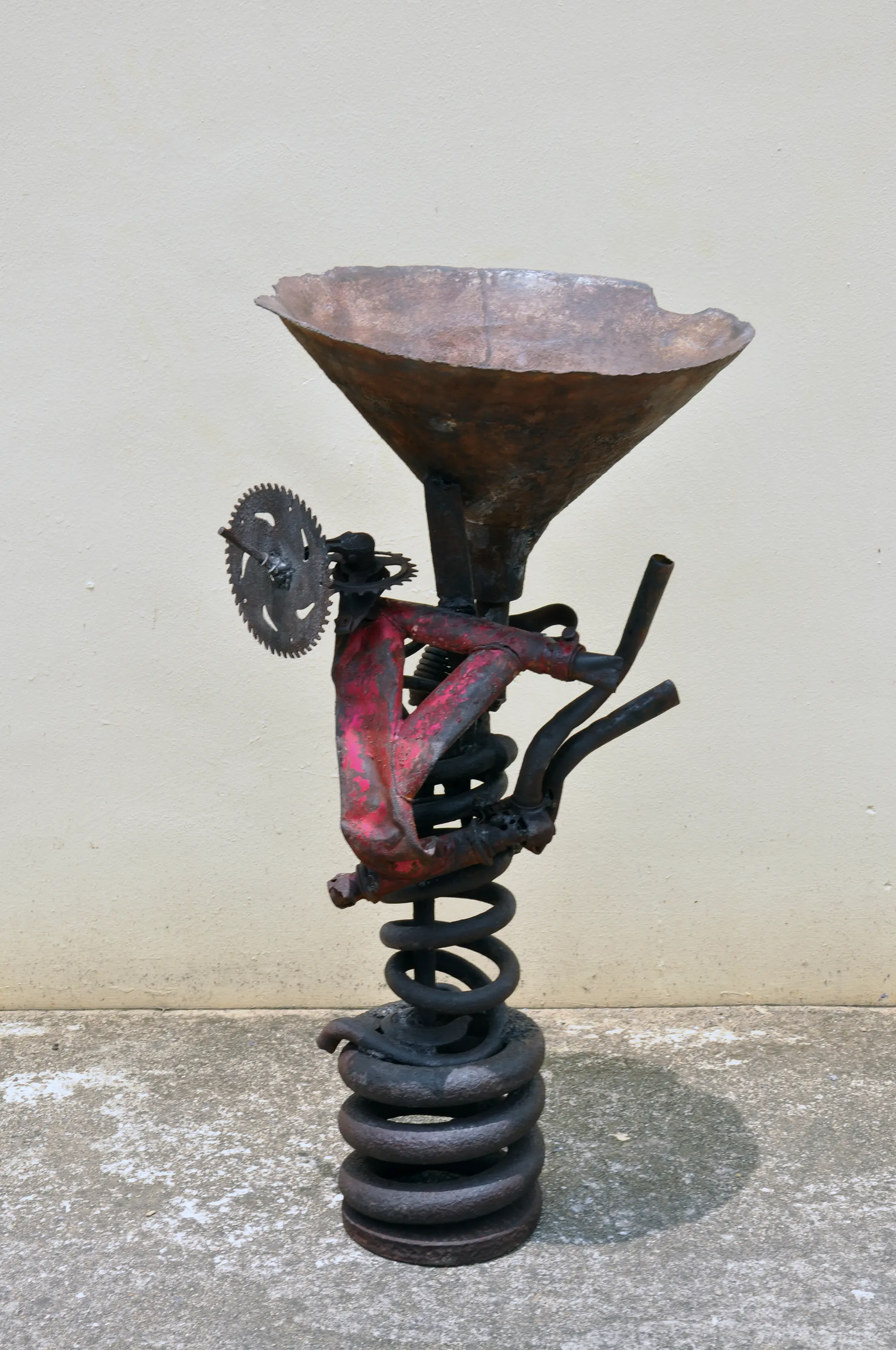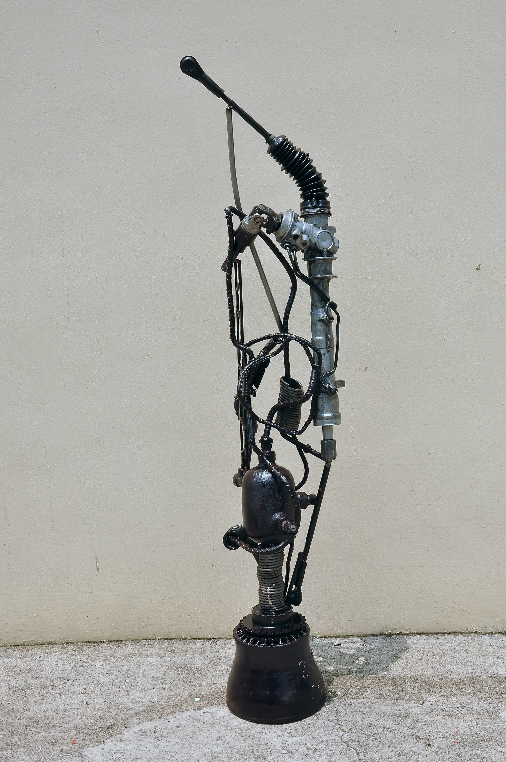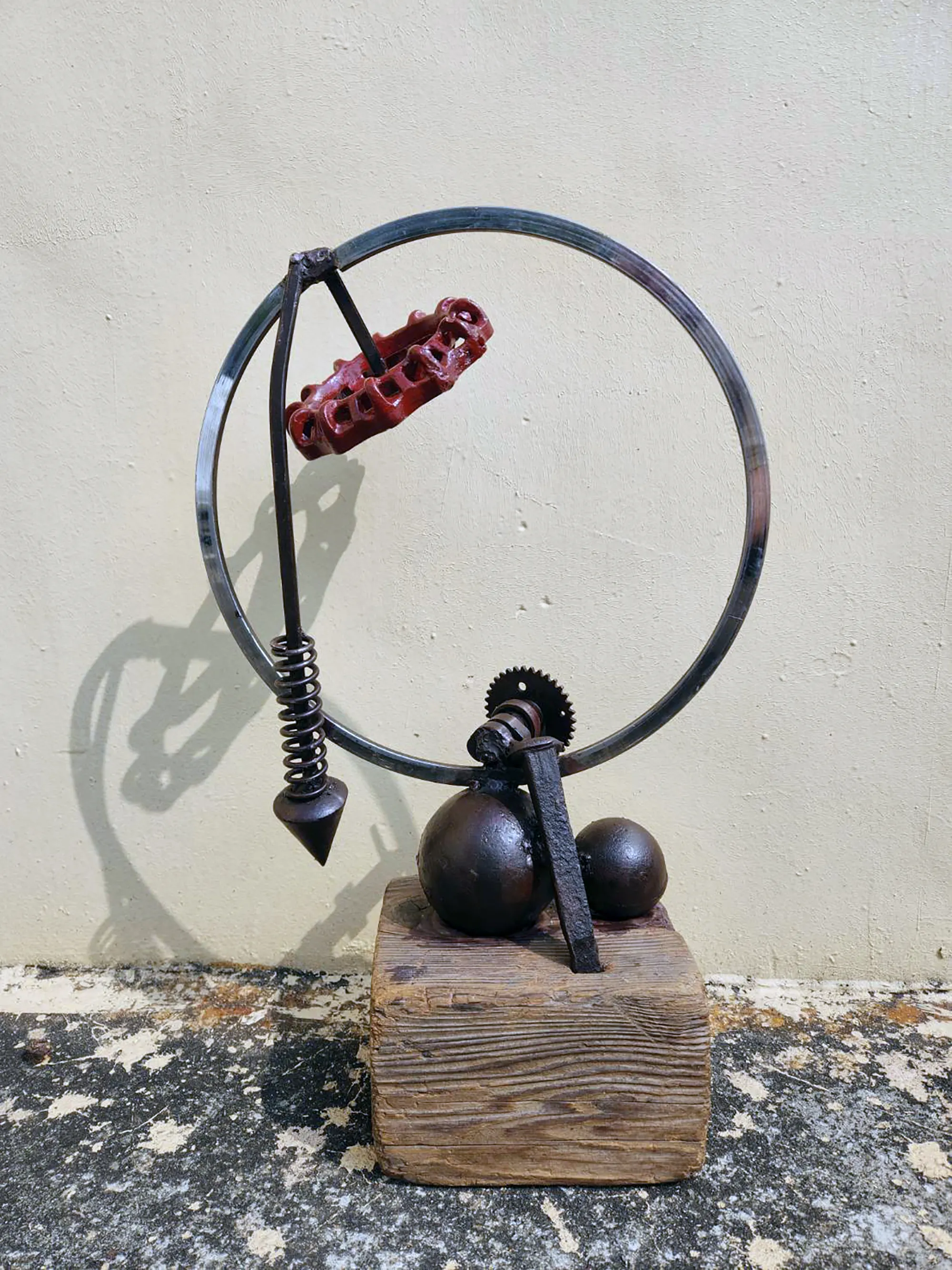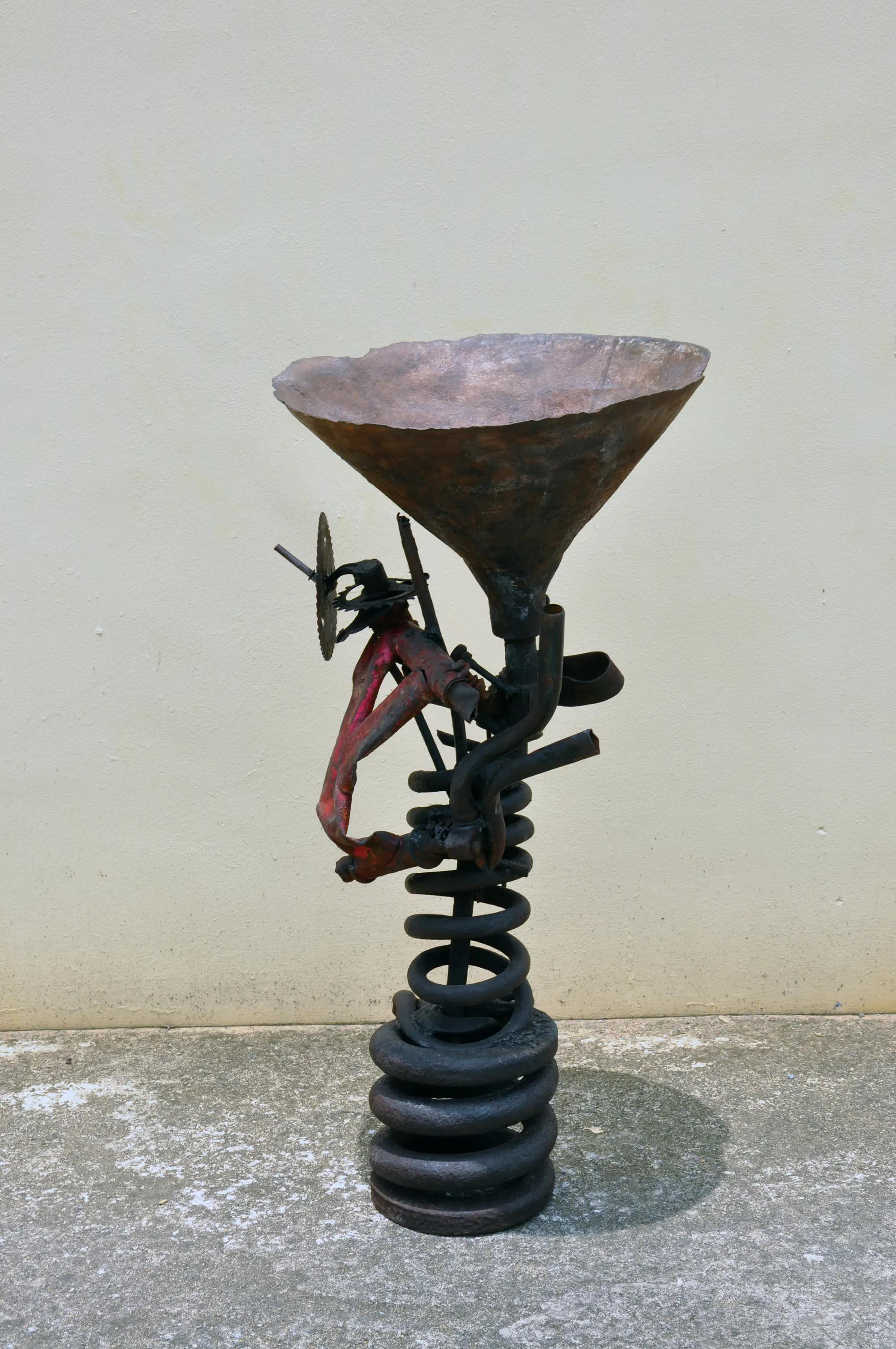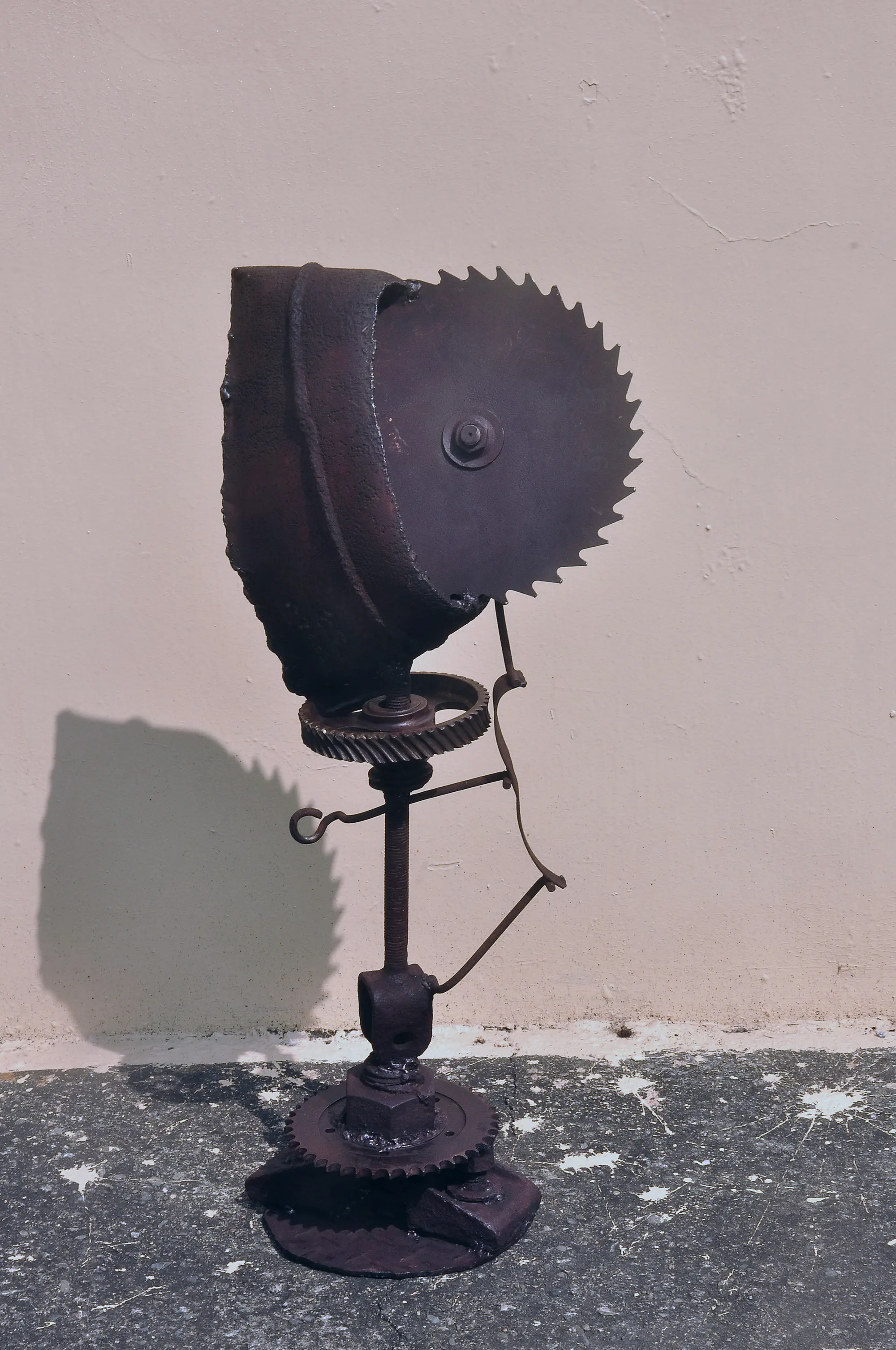 我的鐵雕作品在某種程度上有一種集合藝術的趣味,也具備了隨意組合、拆解的特質。在創作中我動手收集,重新拼貼、組合,那種對完成品輪廓概貌,一直處於「未知」的刺激是我的創作思考邏輯。也藉著與鐵件的零距離接觸,並藉著長期以來對「形」的敏感度不斷的在廢鐵堆中找尋靈感與生活緊密的结合,永遠在轉變中製造新奇,造就了一件件作品的完成。