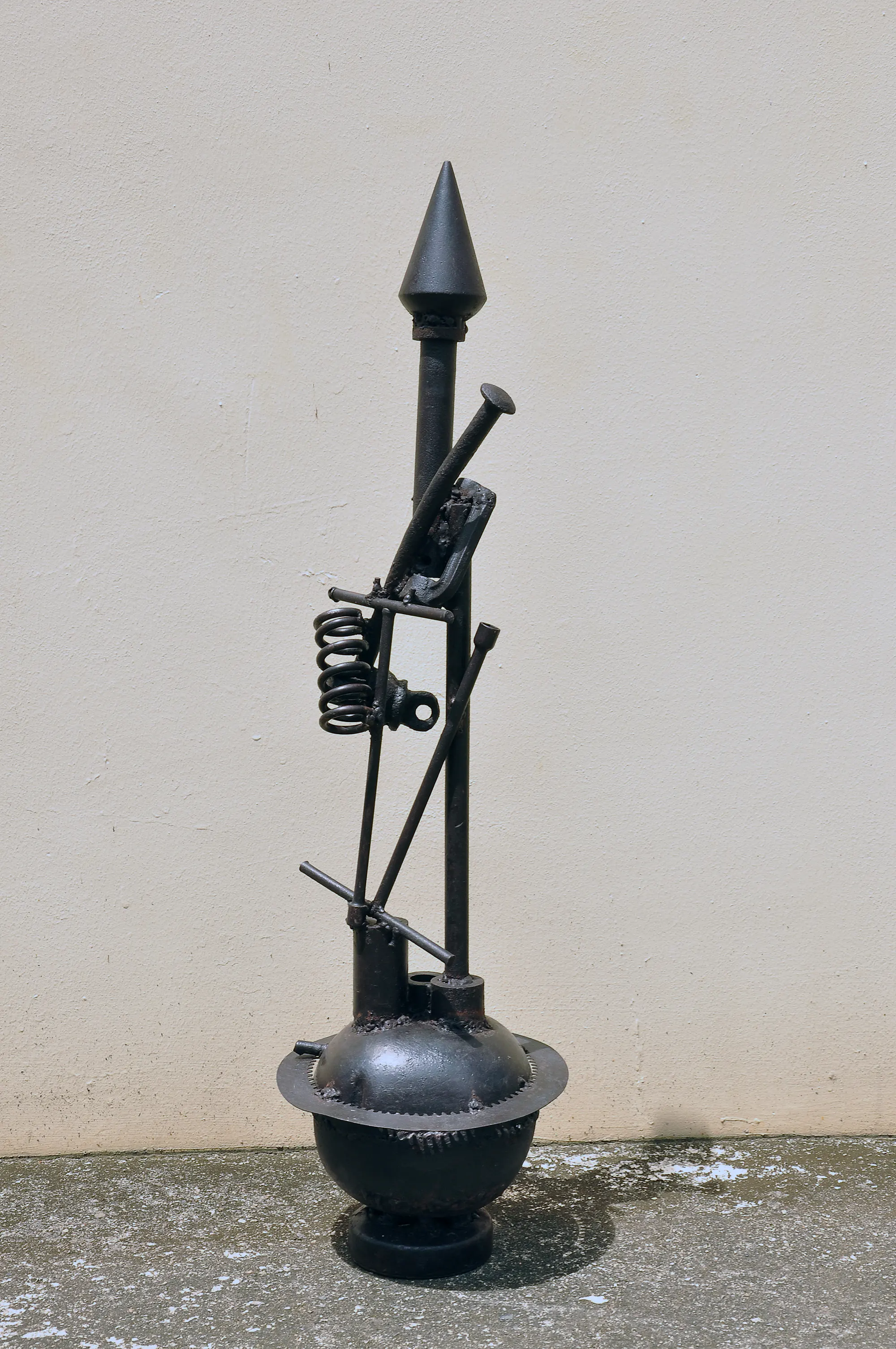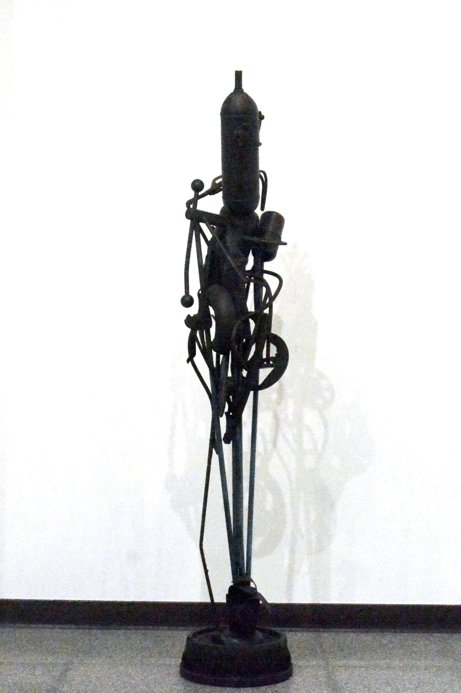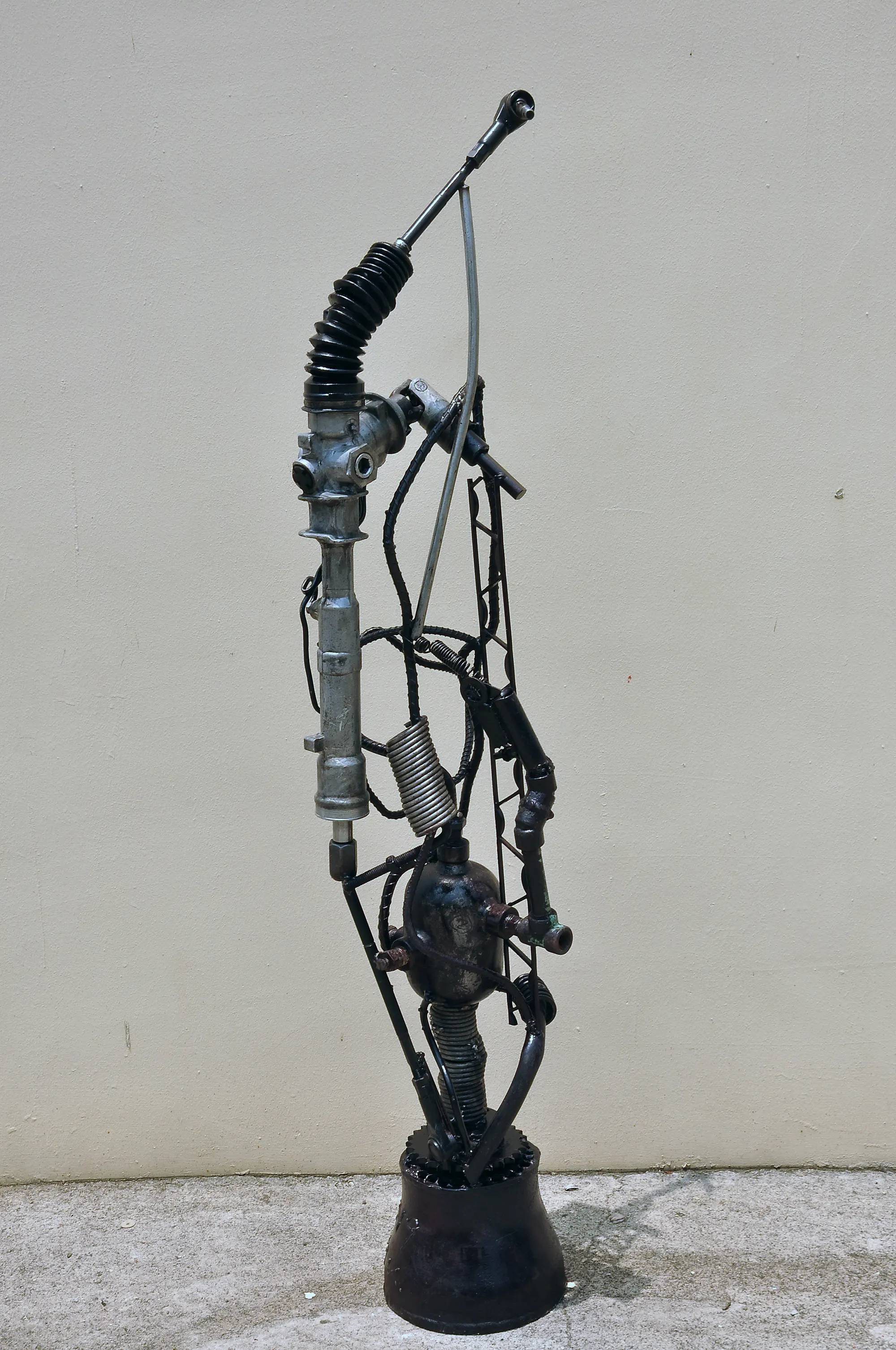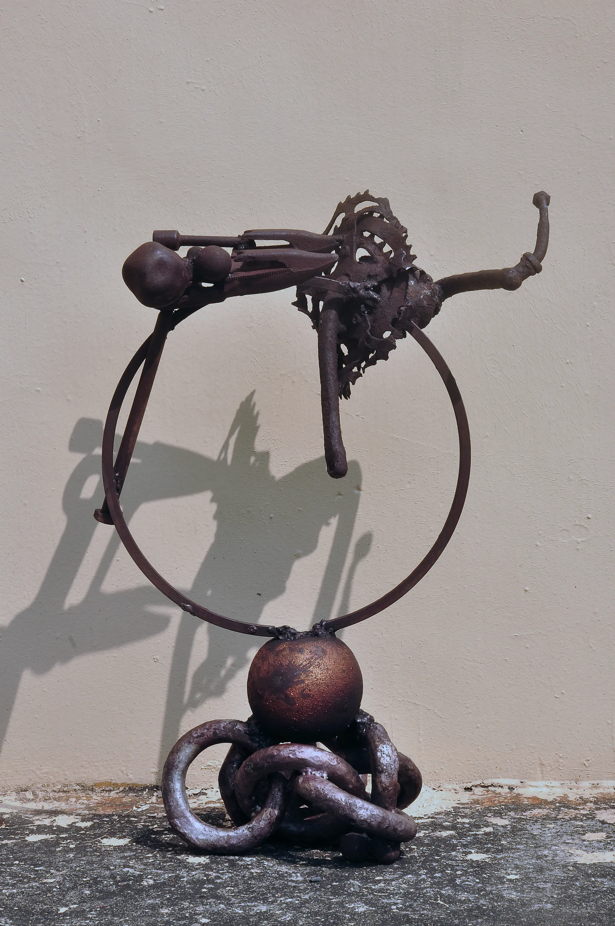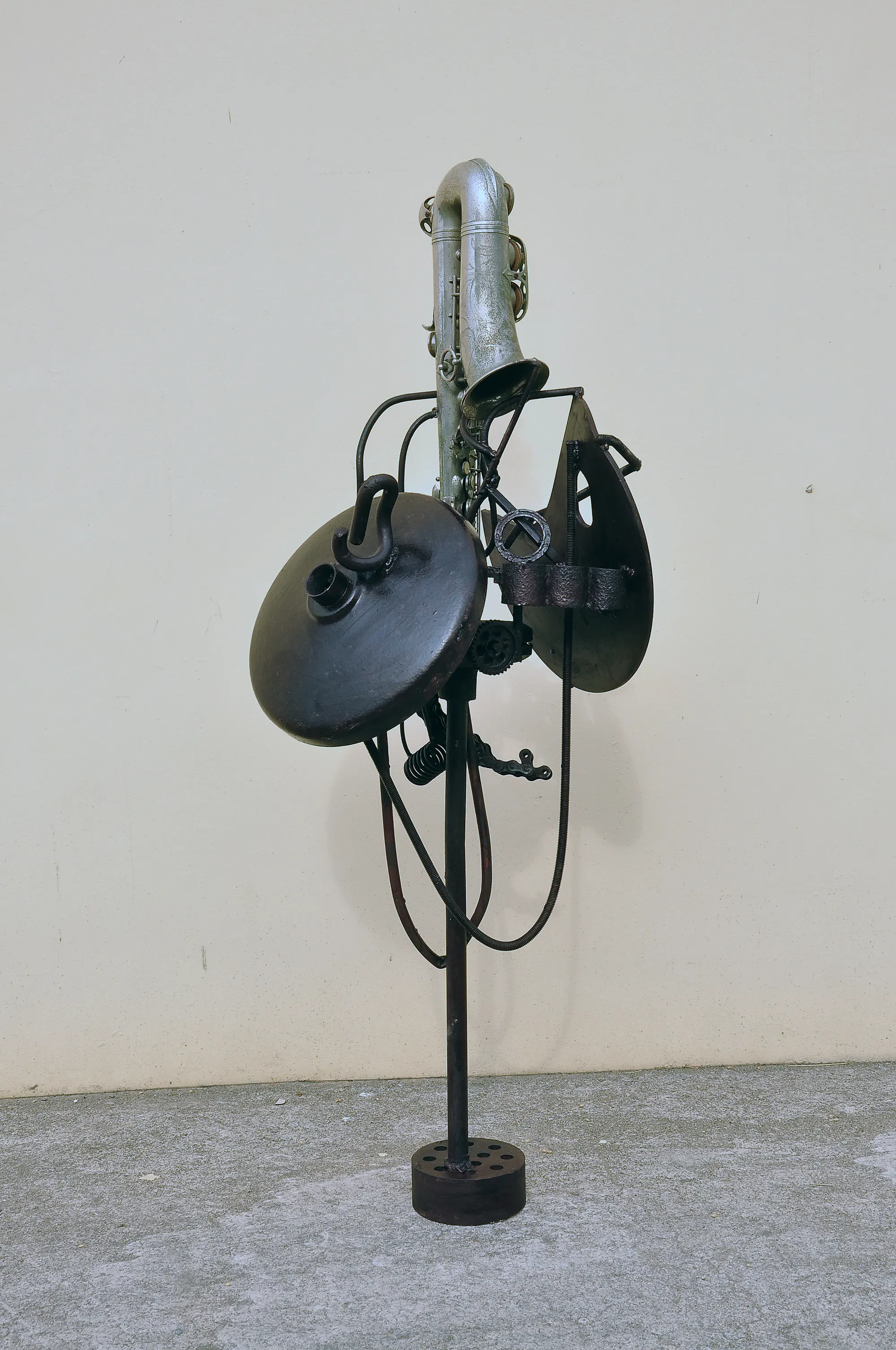 我的鐵雕作品在某種程度上有一種集合藝術的趣味,也具備了隨意組合、拆解的特質。在創作中我動手收集,重新拼貼、組合,那種對完成品輪廓概貌,一直處於「未知」的刺激是我的創作思考邏輯。也藉著與鐵件的零距離接觸,並藉著長期以來對「形」的敏感度不斷的在廢鐵堆中找尋靈感與生活緊密的结合,永遠在轉變中製造新奇,造就了一件件作品的完成。