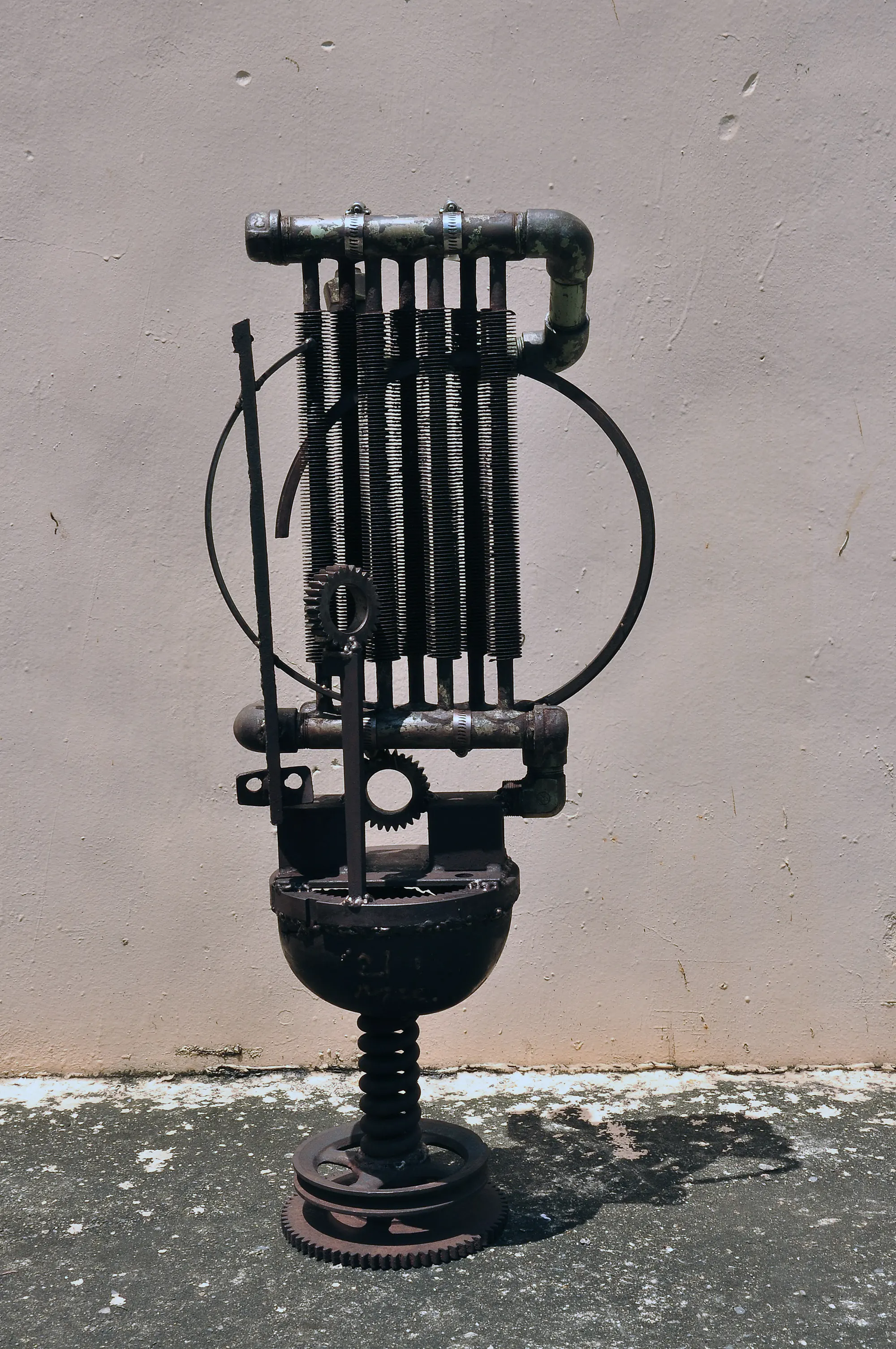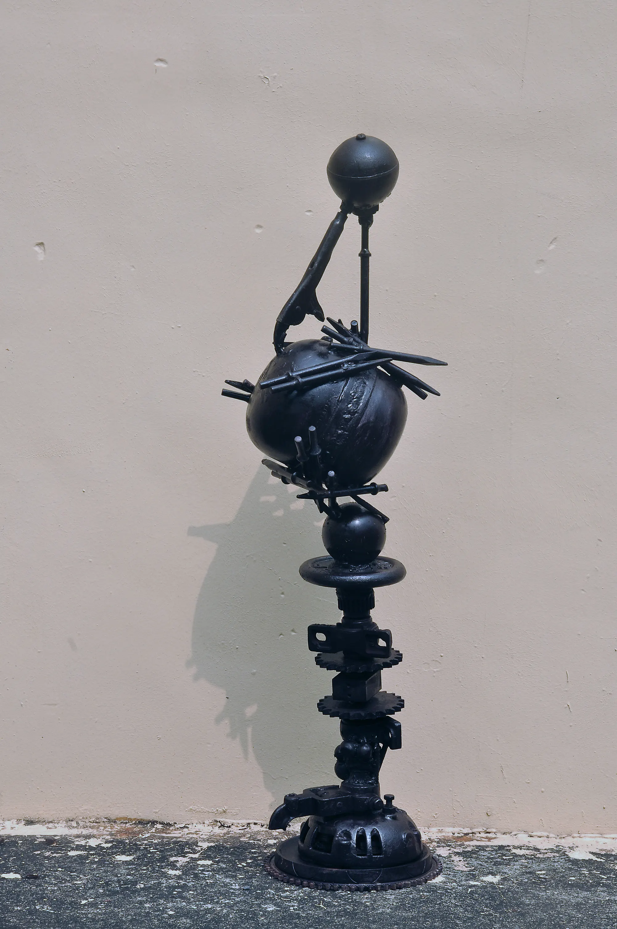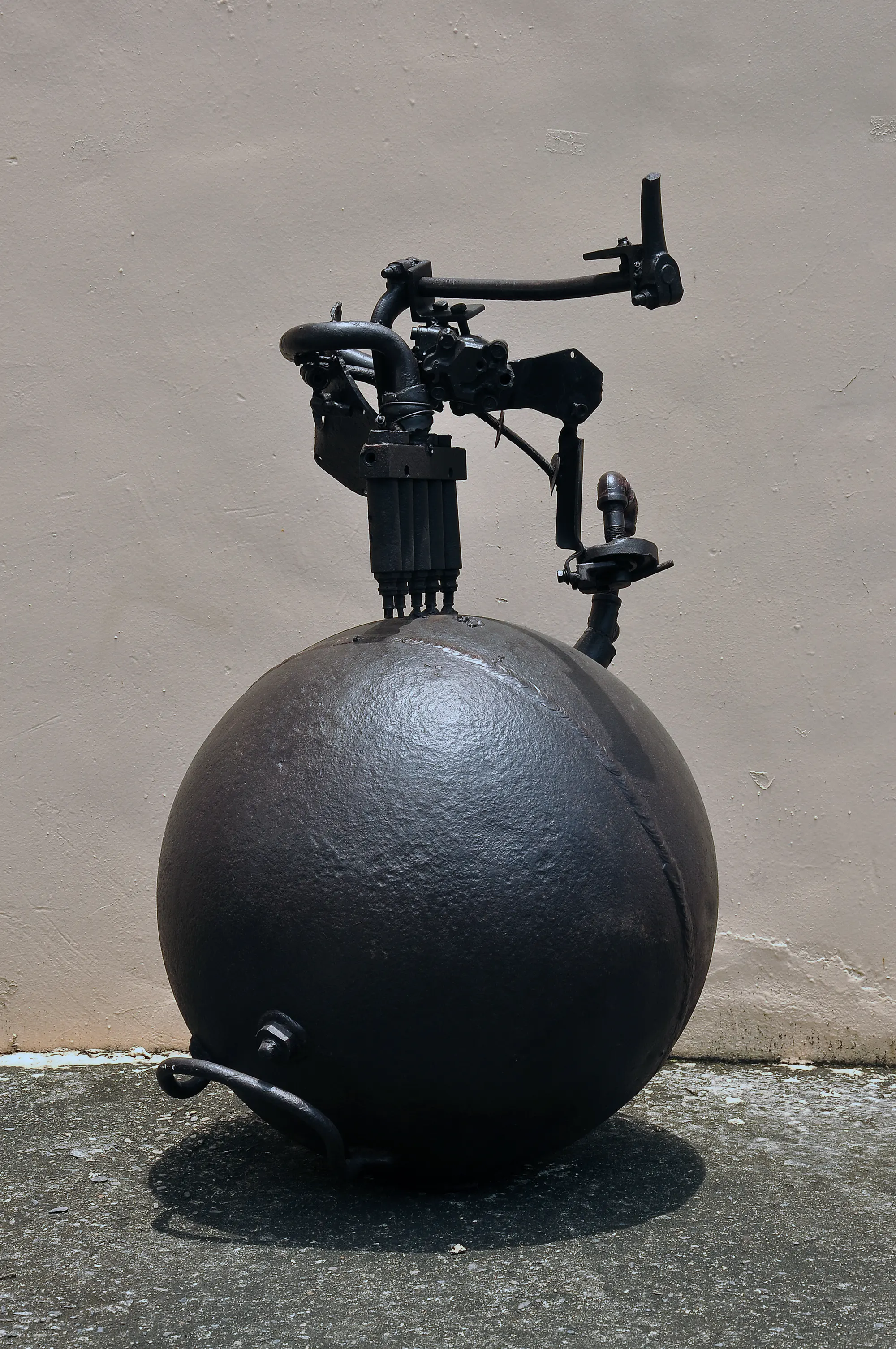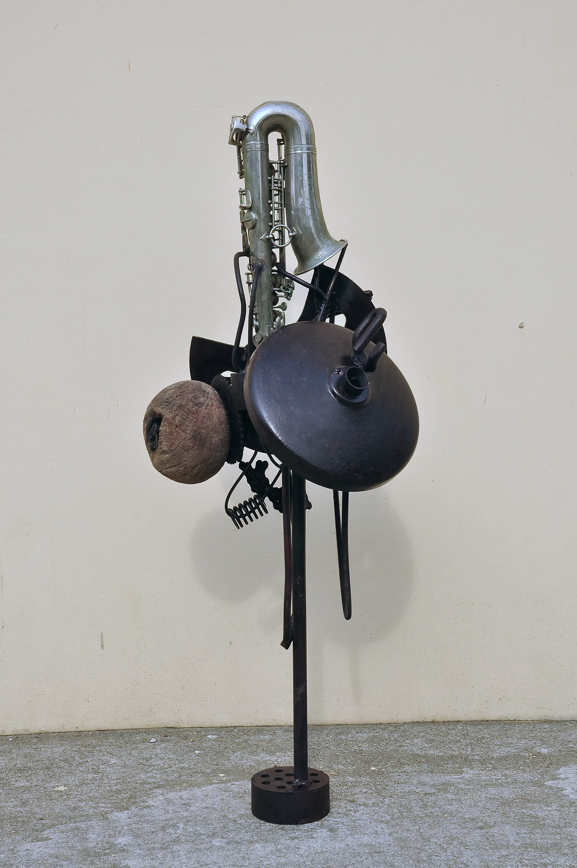我的鐵雕作品在某種程度上有一種集合藝術的趣味,也具備了隨意組合、拆解的特質。在創作中我動手收集,重新拼貼、組合,那種對完成品輪廓概貌,一直處於「未知」的刺激是我的創作思考邏輯。也藉著與鐵件的零距離接觸,並藉著長期以來對「形」的敏感度不斷的在廢鐵堆中找尋靈感與生活緊密的结合,永遠在轉變中製造新奇,造就了一件件作品的完成。