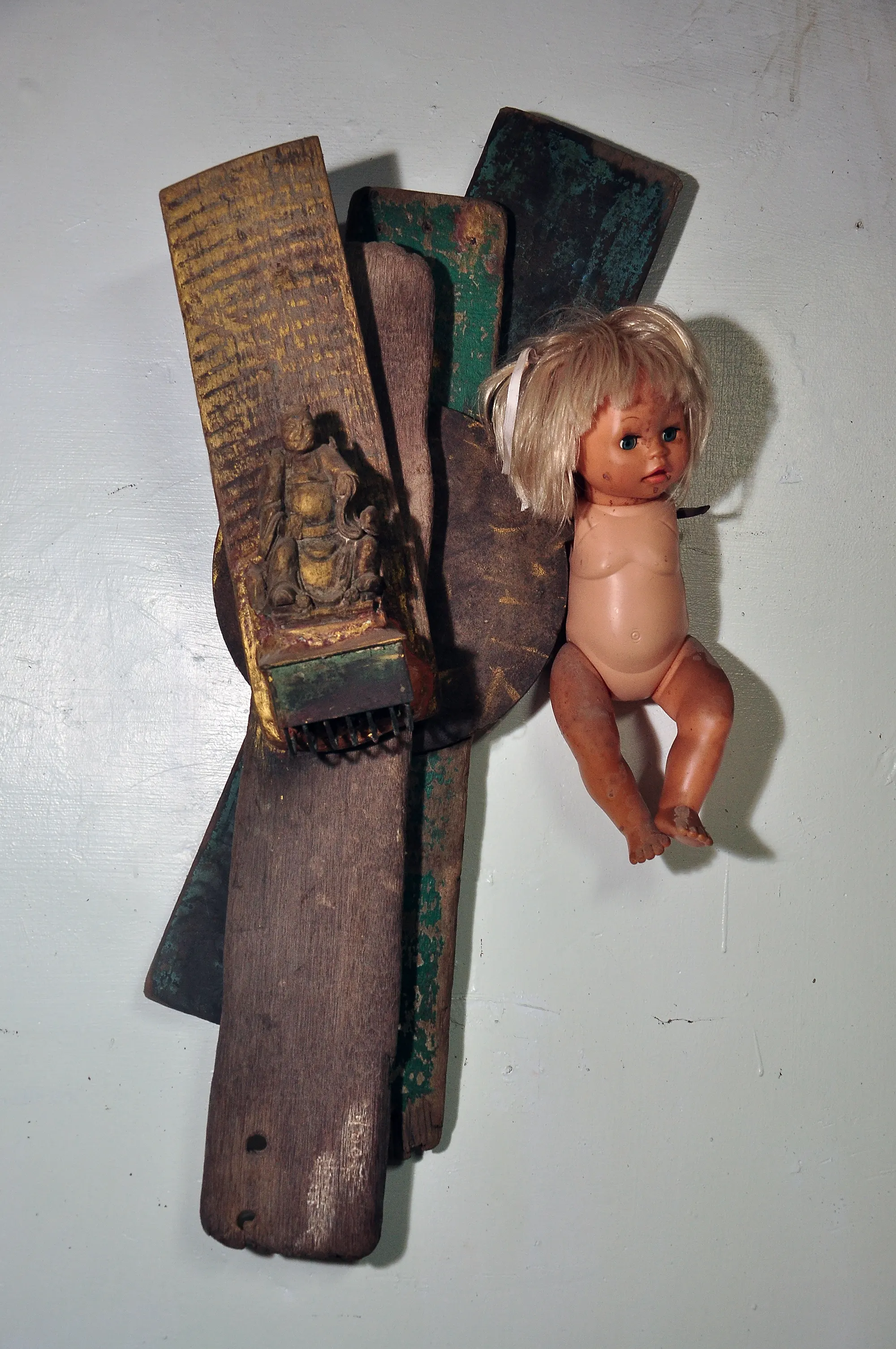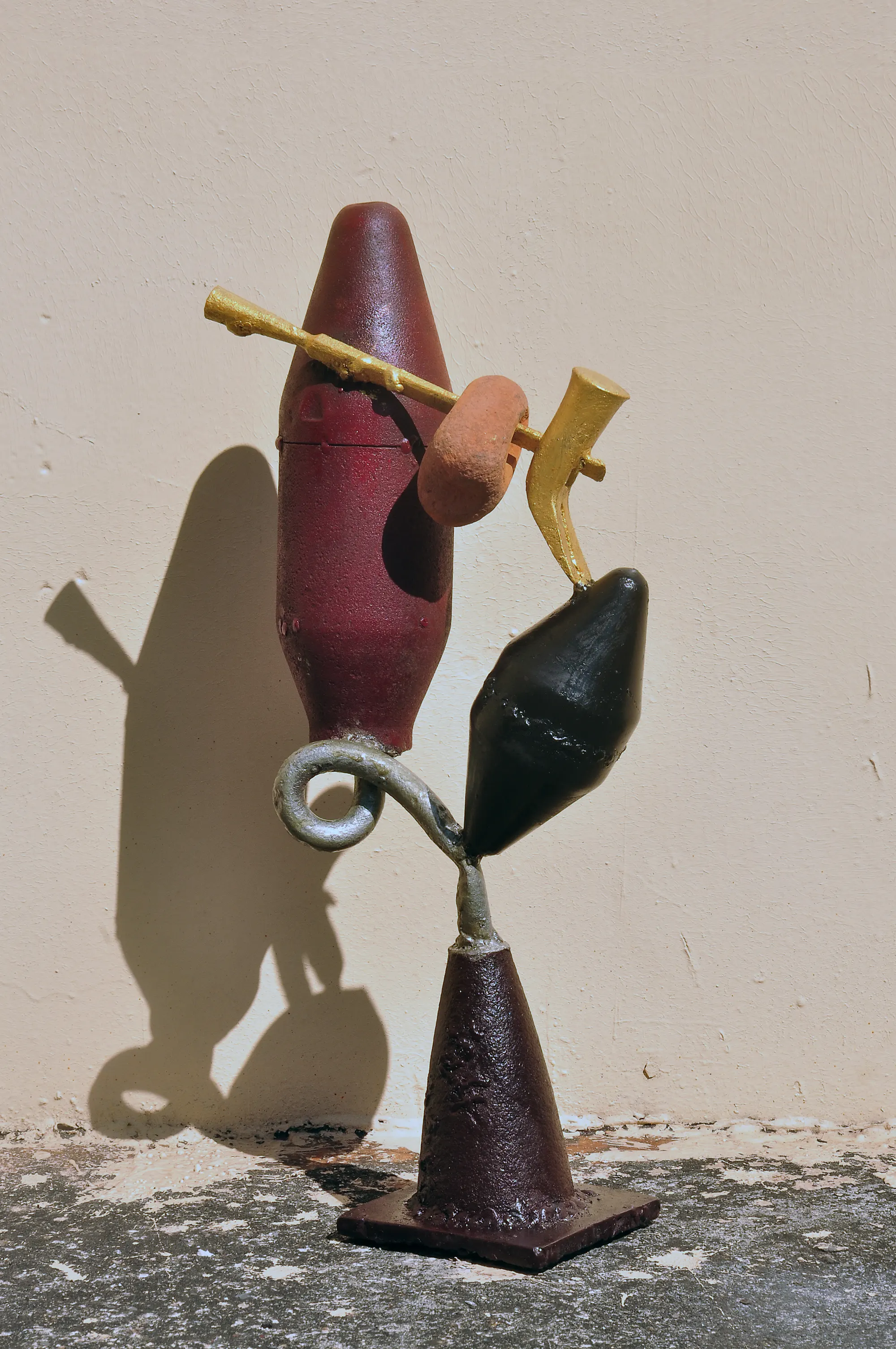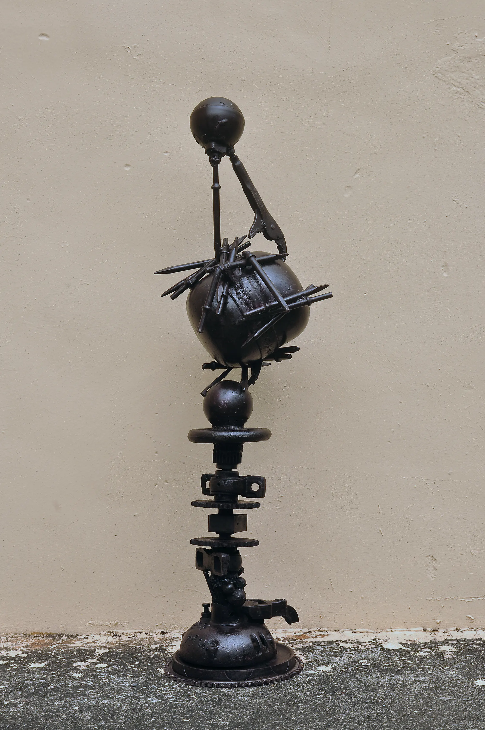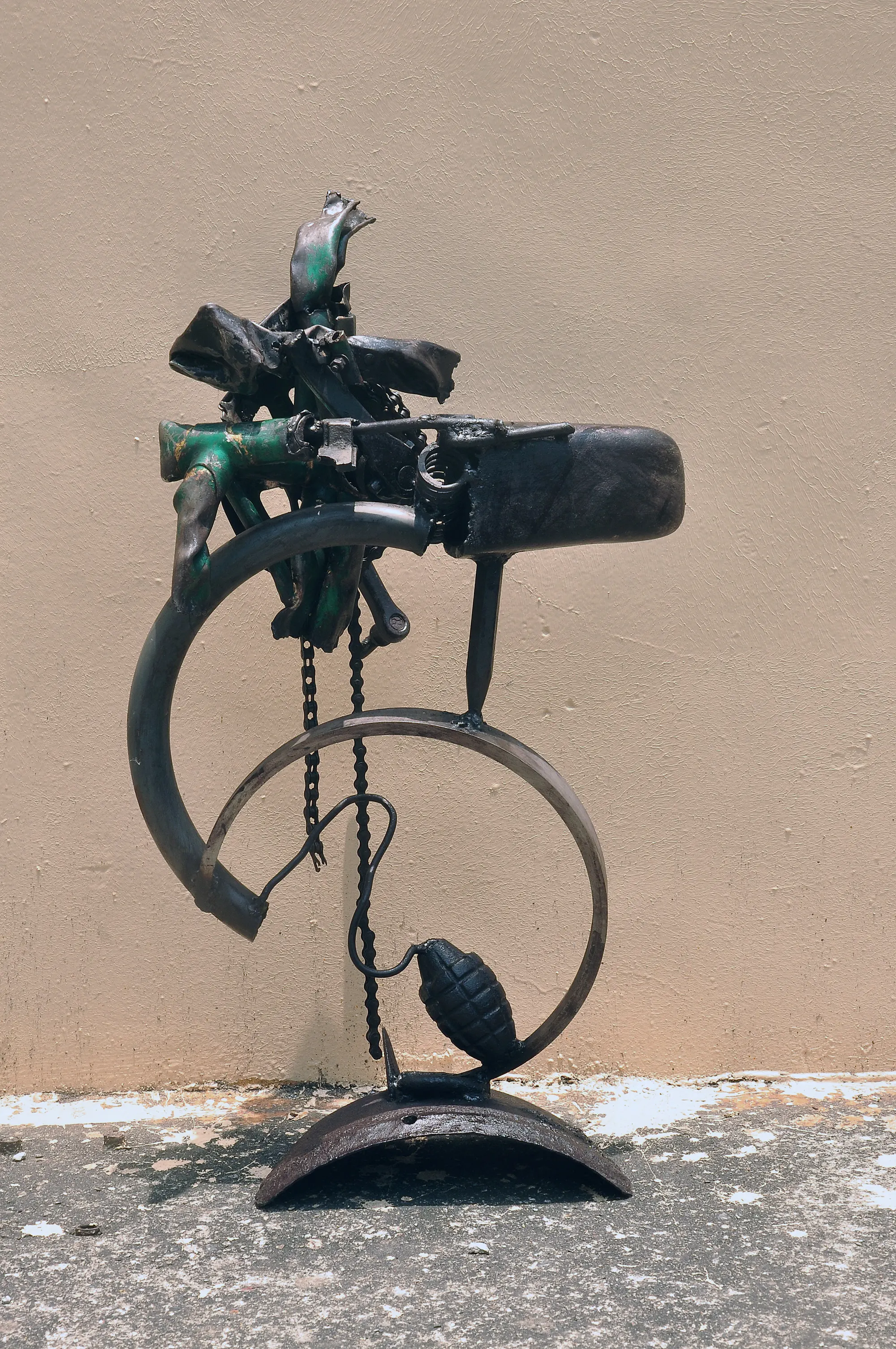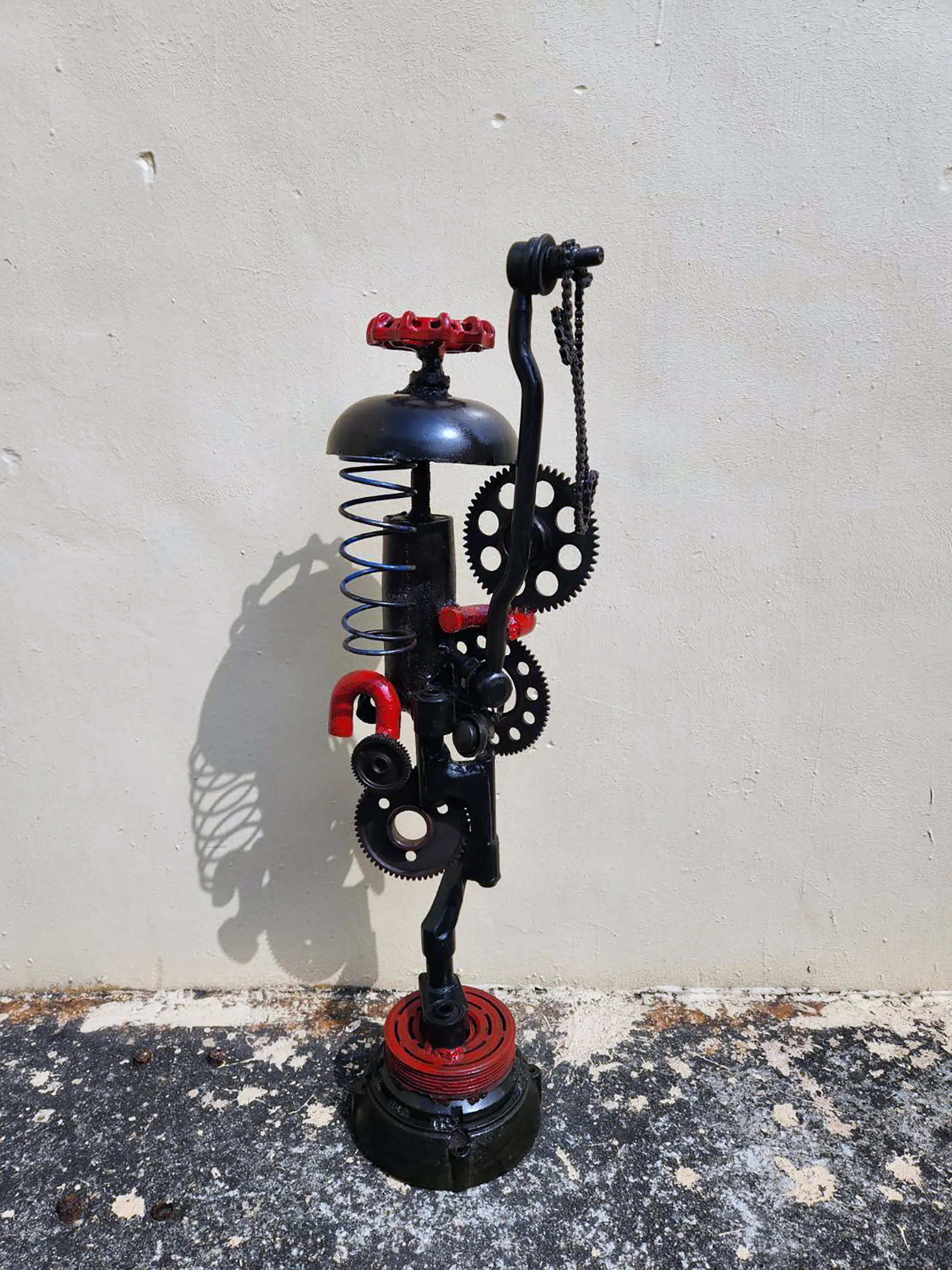 我的鐵雕作品在某種程度上有一種集合藝術的趣味,也具備了隨意組合、拆解的特質。在創作中我動手收集,重新拼貼、組合,那種對完成品輪廓概貌,一直處於「未知」的刺激是我的創作思考邏輯。也藉著與鐵件的零距離接觸,並藉著長期以來對「形」的敏感度不斷的在廢鐵堆中找尋靈感與生活緊密的结合,永遠在轉變中製造新奇,造就了一件件作品的完成。