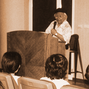在我懂事的年齡,常常不解父親為什麼那麼忙碌,從省立潮中下班回來總是晚上七點以後,大家一起用晚餐的時間才是我們交流的時間。用餐後沒多久就會有一些年輕人來找他,拿著板凳在屋外狹小的走廊就談了起來,不是談話畫就是談我聽不懂的電影、文學、現代藝術…..等等,做完功課的我是被允許在旁邊聽的,依稀記得的是大人們總是會說:「小孩子有耳無嘴,安靜。」雖然聽不懂大人談論的內容,但是在沒有電視的時代,我卻喜歡看父親在講演的樣子,慢慢的長大後,我也成了其中的一分子,其中我最喜歡聽陳英俊(冠學)先生說話了,有許多覺得很有趣但是還要思考的話。在大家回家後,父親又拿起國語字典,我變知道他又要開始寫文章了。