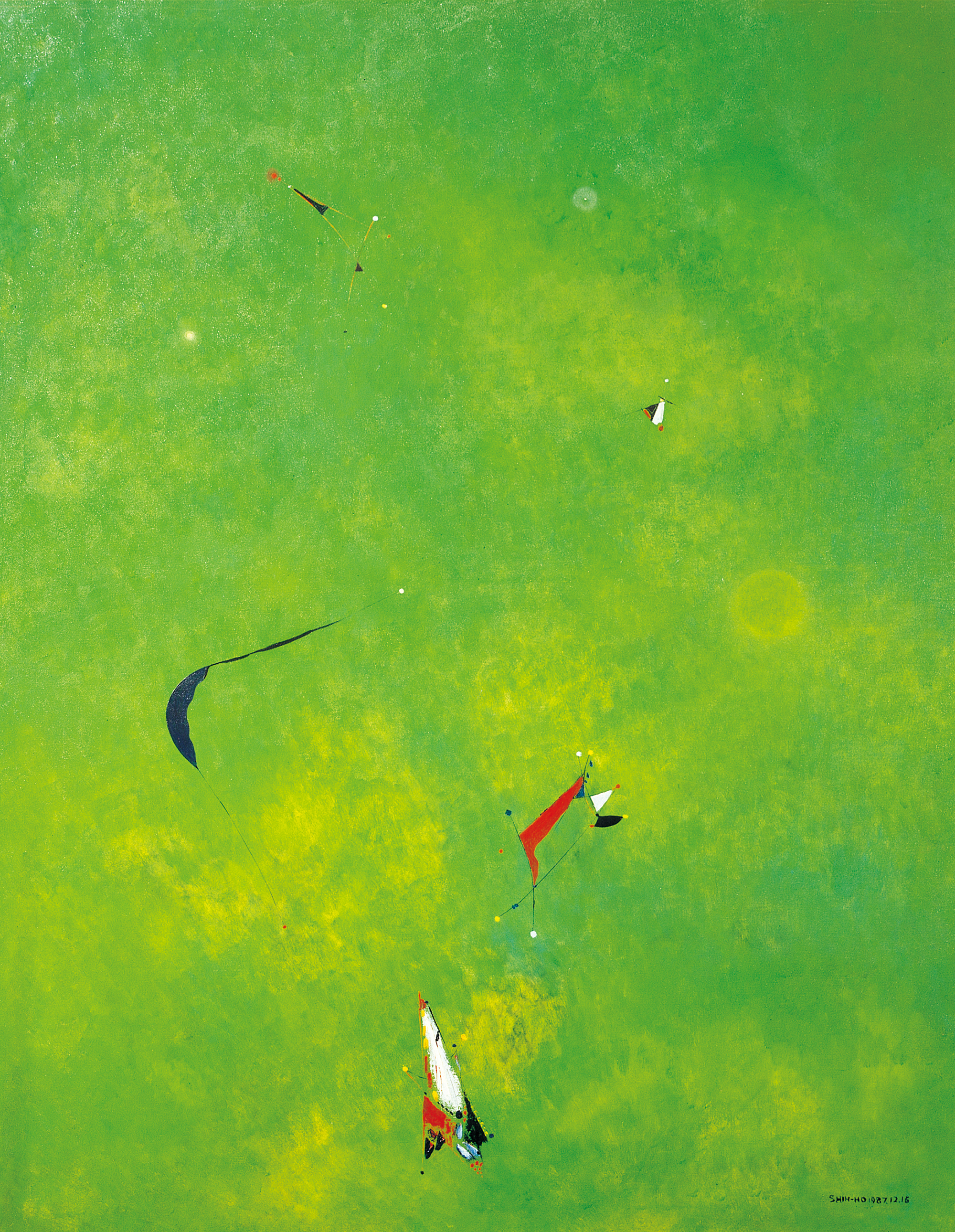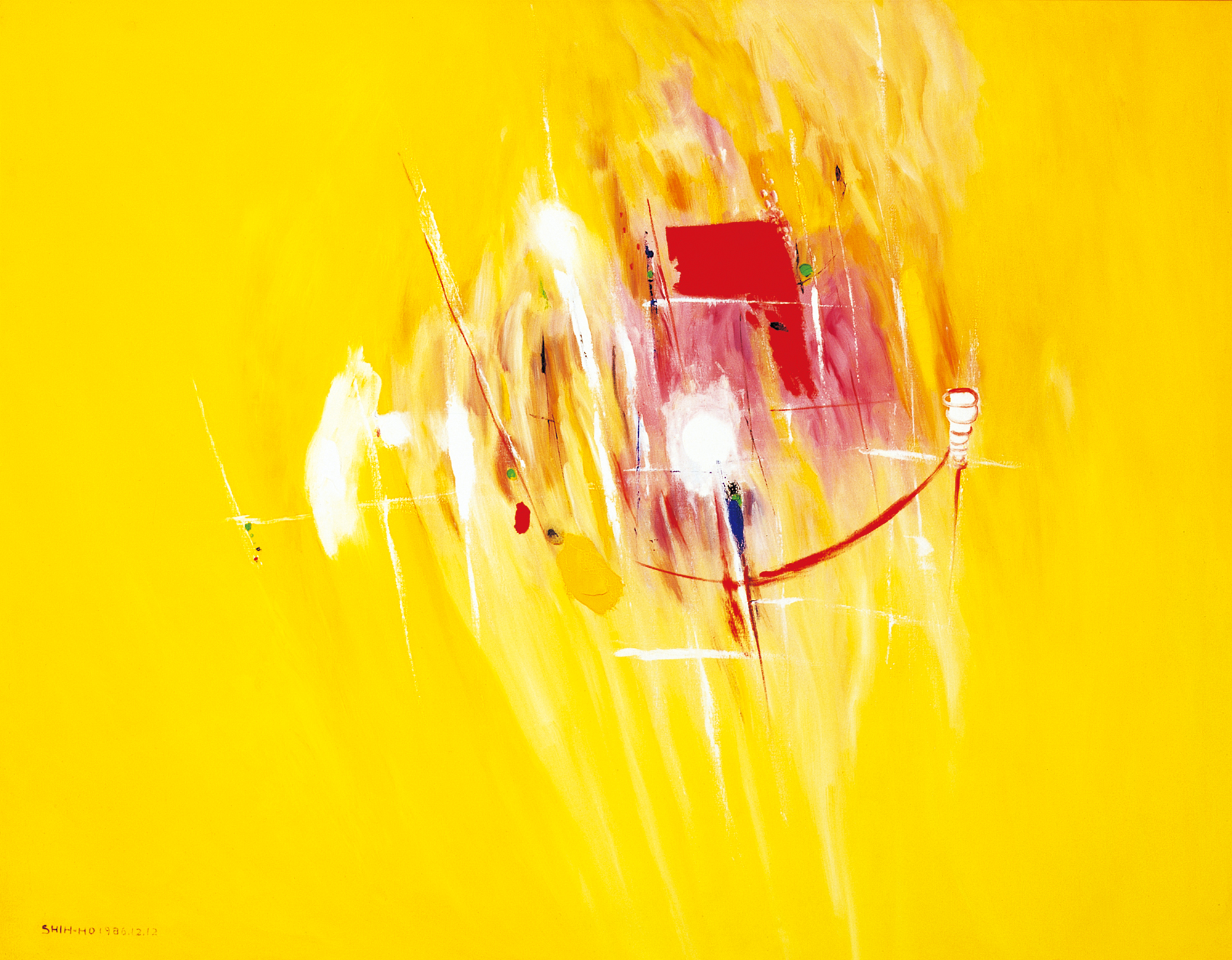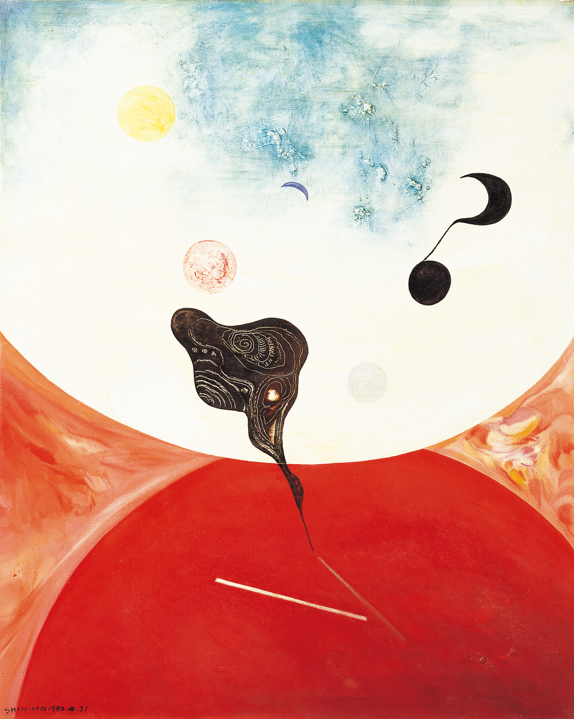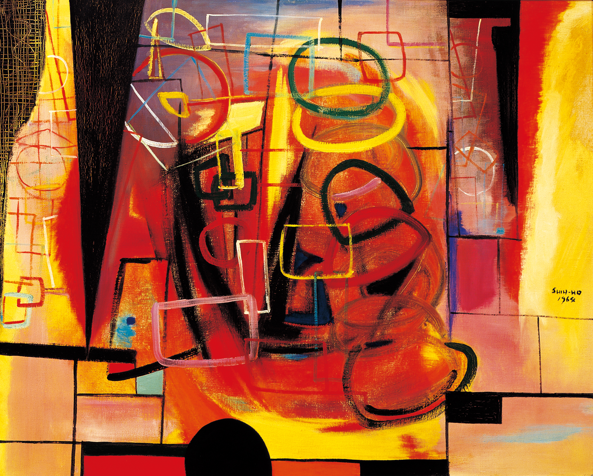 所以,一幅富有藝術性的中國現代繪畫,其內涵是作者自我思想與情感(由現代的感應所獲致),在無限地追求著永恆的理念,因「個性」的發揮而含有其民族精神和新時代意識的表現;色彩的生命、線與點的律動、面的變化交合,在諧調的構成中現出美的韻味,傳達了作者創造的意慾于鑑賞者之前,得以共鳴。誠然,這幅畫是保存著東方(中國)特有風格的,同時具有國際性的。