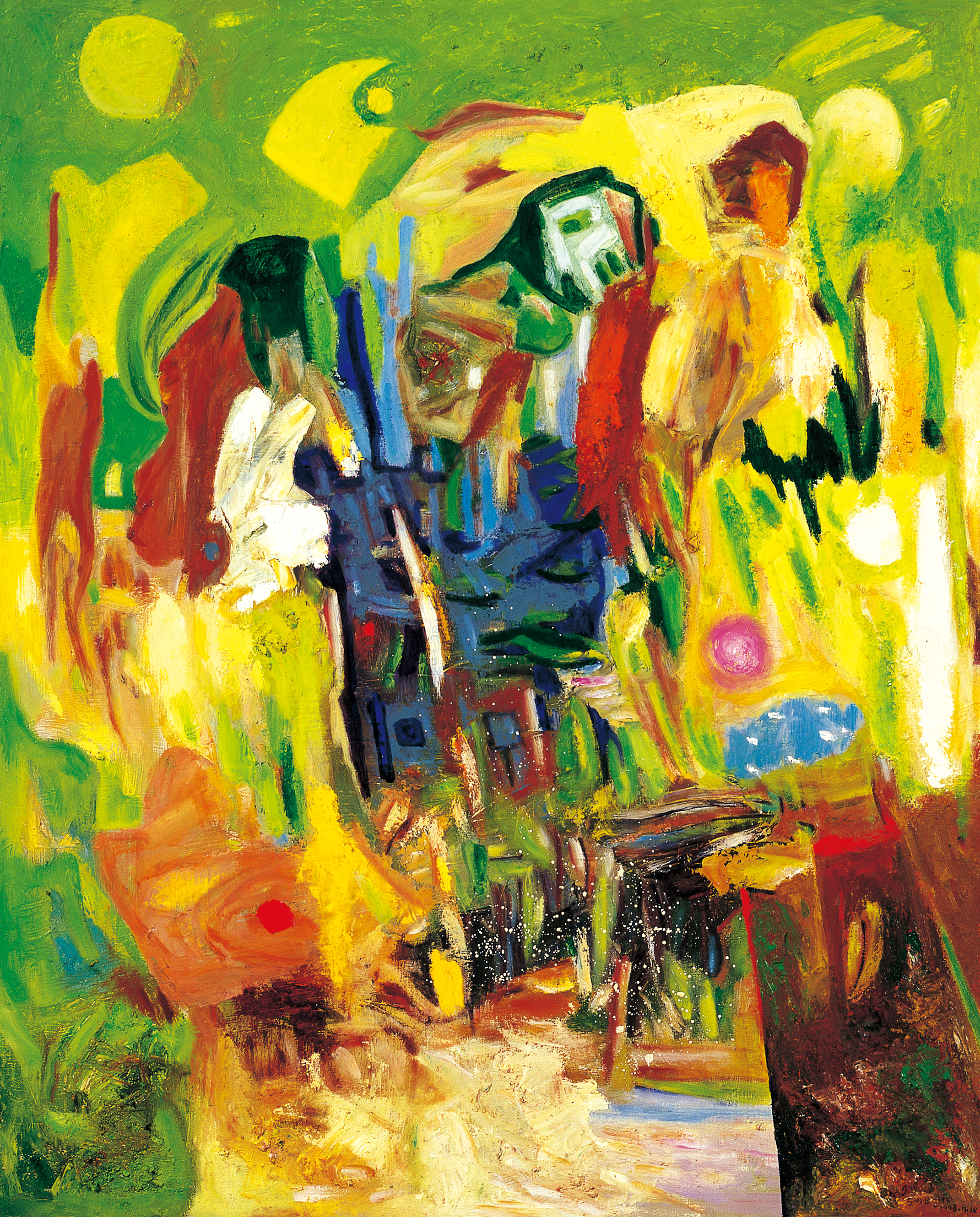 最後,就本期作品表現「生活紀錄」之探索系列的作品中,尚有1984年的〔梨山春色〕、1985年的〔青龍瀑布A〕、〔青龍瀑布B〕)、1987年的〔山之頌〕、1988年的〔山的嗚咽〕、1990年的〔山的聯想〕、1991年〔山B〕等幾幅有關「山」的系列作品特別值得一提,都各以不同的手段,處理不同時空情境之下,對於出的不同感受和心情。以〔青龍瀑布A〕和〔青龍瀑布B〕這兩幅同為1985年所作之作品相較,前者摻用了比較理性的色塊分割之技法,以及移動視點的宏觀取景;後者則有些近於塞尚晚年「聖維克多瓦山」系列之強調平面色塊之抽象視覺分析,取景範圍和視點也較為客觀了一些。至於1987年的〔山之頌〕,雖以描寫橫貫公路太魯閣的懸崖峭壁之奇觀為其畫因,然而單從畫面上我們只能從許多接近垂直的陡峭斜線感受山勢之雄險;從色彩之明麗多變,來感受作者對於其風景明媚之讚頌,顯然在這幅抽象作品當中,作者並無意讓觀眾尋覓何者長春祠?何處是太魯閣?相較於前兩幅〔青龍瀑布〕而言,〔山之頌〕的主觀和直觀之成分加濃了許多。至於1988年的〔山的嗚咽〕,以中鋒深色線條勾勒各式幾何化方形山石,大小參差錯落,近於頁岩與玄武岩之間,並藉色彩和筆觸之變化營造肌理,介於抽象與半抽象之間,乍看之下有幾分近於克利(Klee,Paull 1879-1940)之風格,但又接近於中國山水畫之馬牙皴。實則莊老在創作此畫之際,未必心繫著上述兩種傳統因子,然而面對著諸前述風格相近之景境感受時,任何沉澱於潛意識裡之傳統因子,往往被其瞬間靈感所摧動而翻湧浮現,在機緣巧合之情境下被信手拈來而自然地摻用於畫面上。至於1990年的〔山的聯想〕,則將山約減化、幾何化成為斜線構成的單純的紅、藍、黑三大色塊,其間綴以如竹葉、似柳葉般的一群隨風飄散的書法性細碎撇筆,更增加其動勢。在抽象的畫面中,含蘊著作者內心豐富的情感和想像意涵,其幾何造形的象徵符號運用,也不盡同於絕對主義(Suprematism),而在強調結構的韻律感之外,其豐富的文學意涵更是莊老作品之一大特色。此外,莊老1991年所畫的〔山B〕,相較於前述幾幅以「山」為主題的系列作品而言,則顯然大膽、奔放得多。在這件作品中,莊老發揮其對色彩的高度敏銳性,幾乎完全摒除客觀視覺之意象,而盡情抒發其內在感受和直覺的感應,其節奏明快有力,感情豐沛,極富生命力,為其抒情抽象之佳構。